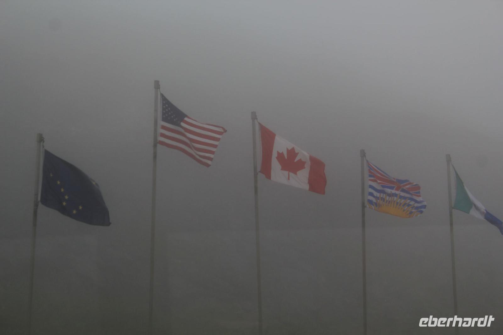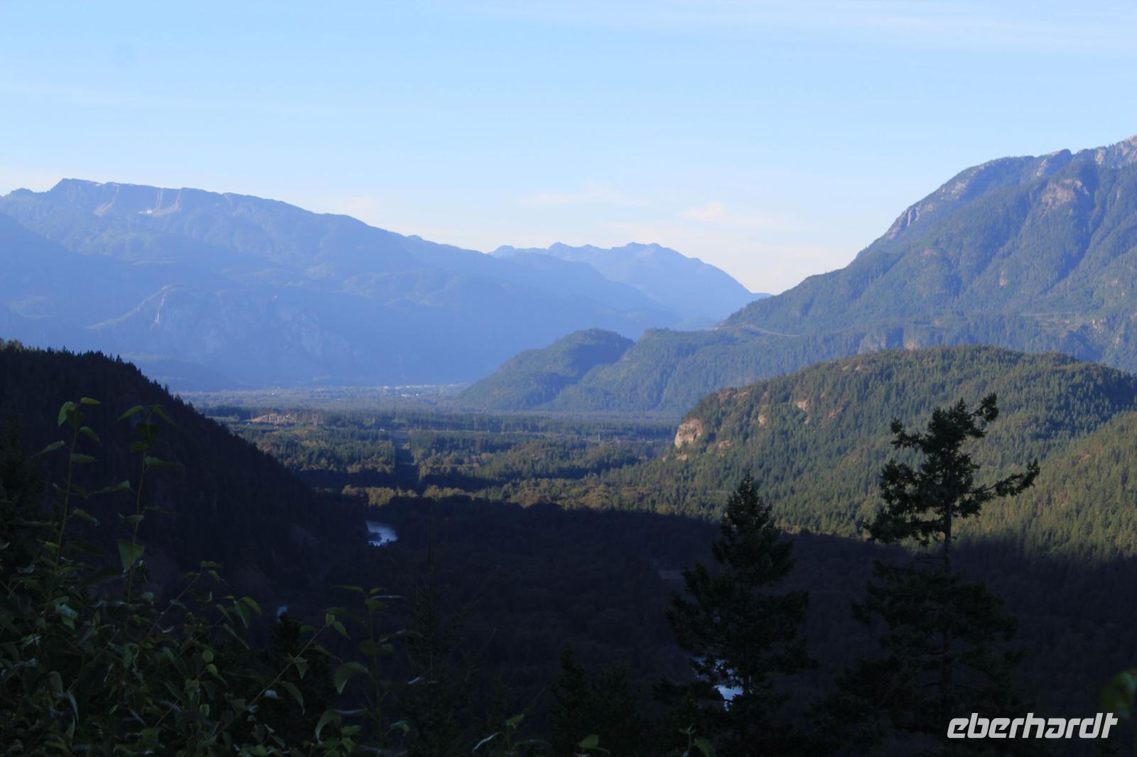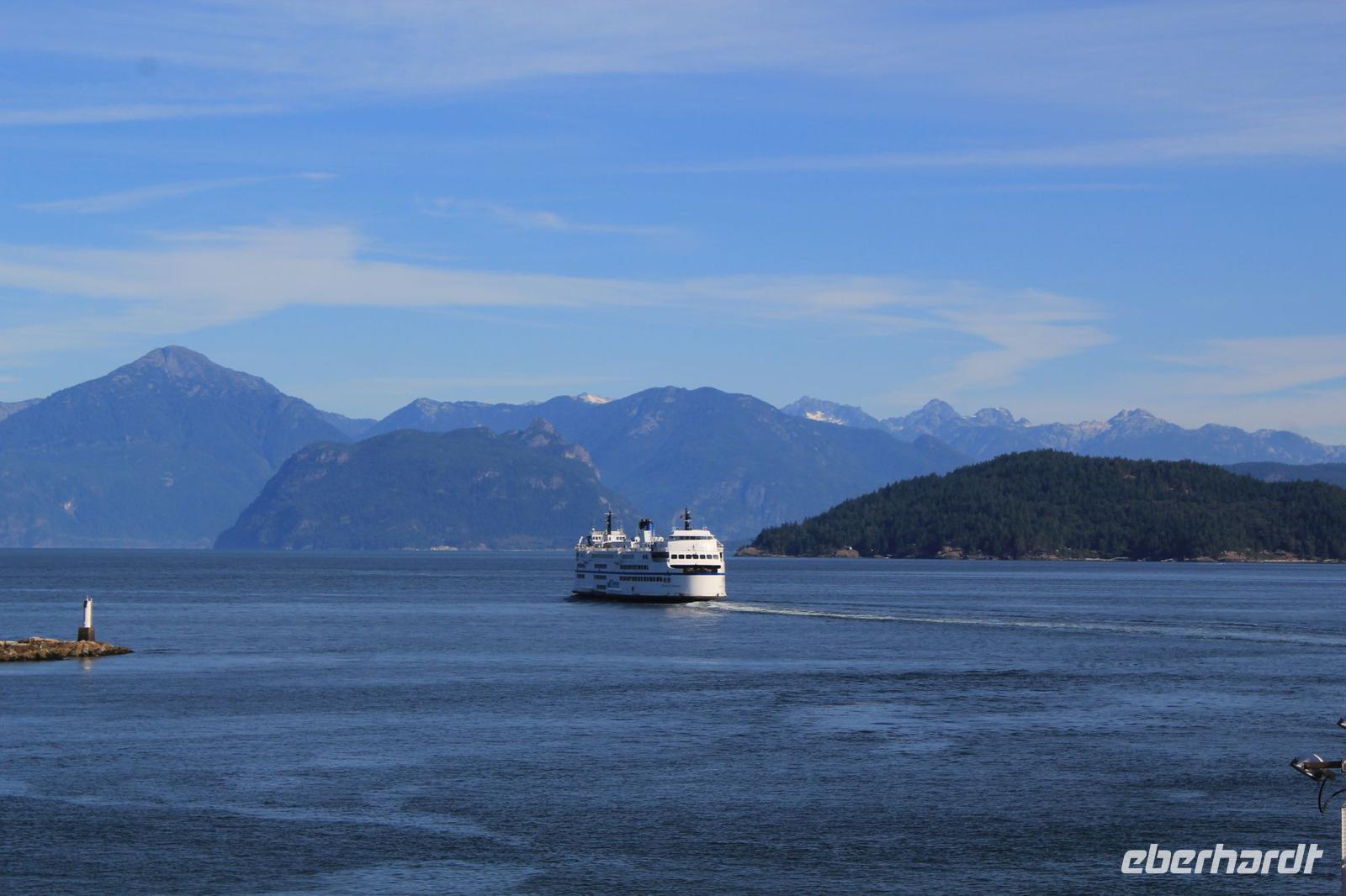 Heute beginnt der Tag ein wenig früher als sonst, denn wir haben eine Fähre zu erwischen! Um 7:15 Uhr verlassen wir Whistler und wollen entlang des „Sea to Sky Highways", sprichwörtlich „vom Himmel zum Ozean" fahren. Nach kurzem Fotostopp an der Tantalus Bergkette, die wunderschön von der Morgensonne angestrahlt wird, machen wir kurz Halt im Ort Squamish. Schließlich ist es soweit und der Pazifik, der uns in Form einer herrlichen Fjordlandschaft, bespickt mit kleinen grünen Inselchen zum 1. Mal begegnet, rückt in unser Blickfeld.