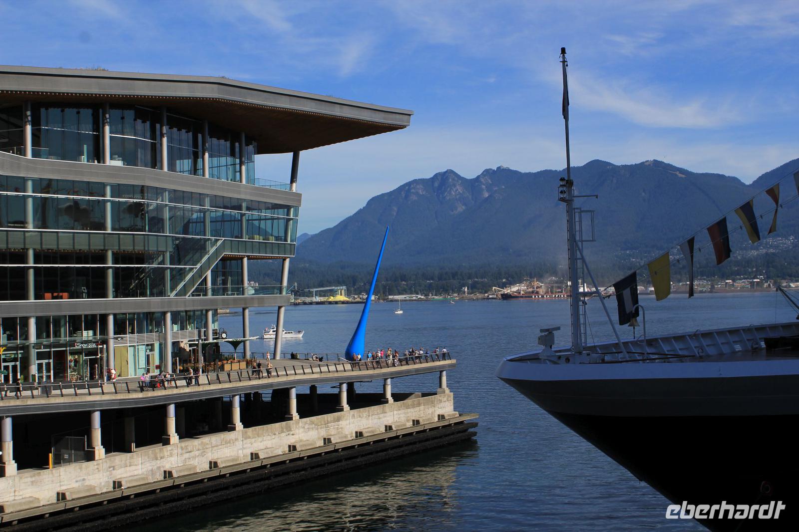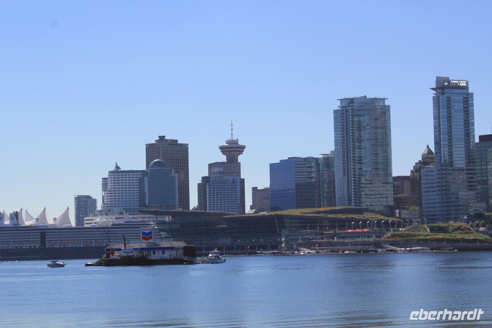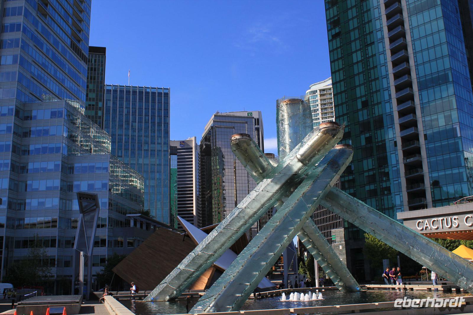 Jetzt haben wir Downtown, die zentrale Innenstadt Vancouvers erreicht. Hier wuchsen erst in den letzten 3 Jahrzehnten silbern schimmernde Wolkenkratzer in die Höhe. Neben modernen Apartmentblocks und futuristisch-eleganten Hotels lockt hier der schöne Canada Place viele Besucher an. Ein architektonisch sehr bemerkenswerter Komplex weist ein imposantes Dach in Form eines Segelschiffes auf. Vor nur einer Woche stachen wir hier mit unserem Kreuzfahrtschiff in See! Bei einem Bummel entlang der Water Front sehen wir Wasserflugzeuge starten und landen und erblicken bereits das grüne Herz der Stadt, den Stanley Park, im Hintergrund. Gegenüber ragen die 3 Hausberge der Stadt hoch in den Himmel: der Cyprus, Grouse und Seymour Mountain. Die Glastürme, die das Sonnenlicht reflektieren, lassen die Stadt hell und freundlich erscheinen und verschaffen den Straßen einen ganz besonderen, lebhaften Glanz. Einen weiteren Blick werfen wir auf die Konstruktion des Olympischen Feuers, das nur zu ganz speziellen Anlässen noch gezündet wird.