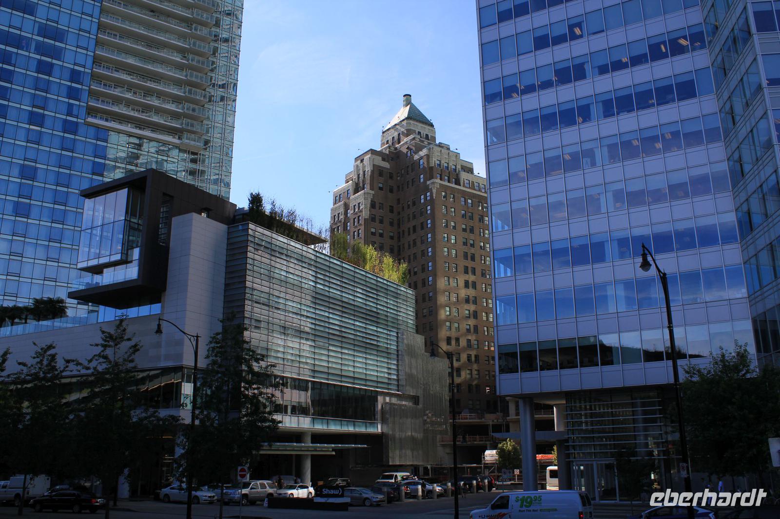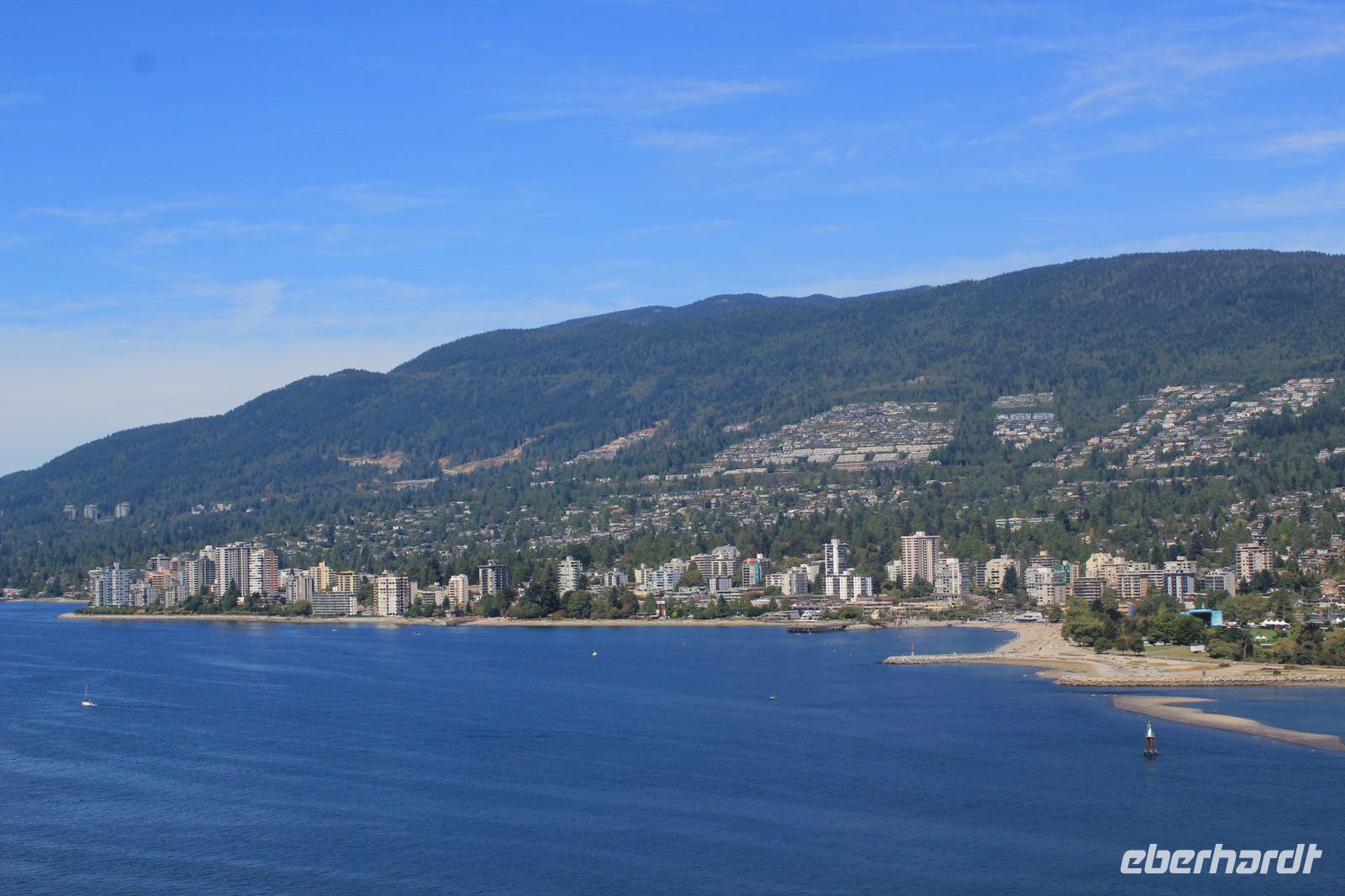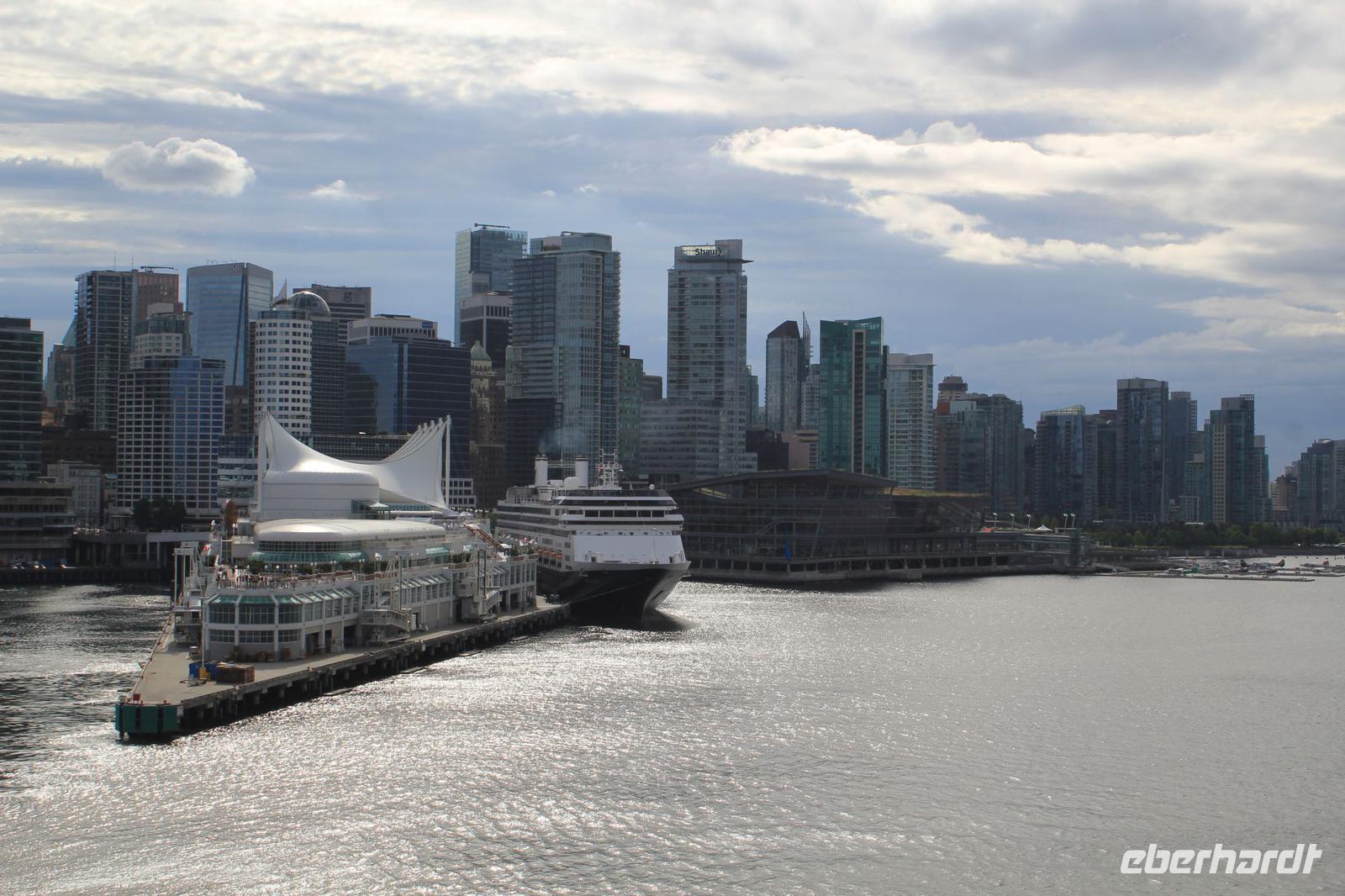 Jetzt haben wir Downtown, die zentrale Innenstadt Vancouvers erreicht. Hier wuchsen erst in den letzten 3 Jahrzehnten silbern schimmernde Wolkenkratzer in die Höhe. Neben modernen Apartmentblocks und futuristisch-eleganten Hotels lockt hier der schöne Canada Place viele Besucher an. Ein architektonisch sehr bemerkenswerter Komplex weist ein imposantes Dach in Form eines Segelschiffes auf. Vor nur einer Woche stachen wir hier mit unserem Kreuzfahrtschiff in See! Bei einem Bummel entlang der Water Front sehen wir Wasserflugzeuge starten und landen und erblicken bereits das grüne Herz der Stadt, den Stanley Park, im Hintergrund. Gegenüber ragen die 3 Hausberge der Stadt hoch in den Himmel: der Cyprus, Grouse und Seymour Mountain. Die Glastürme, die das Sonnenlicht reflektieren, lassen die Stadt hell und freundlich erscheinen und verschaffen den Straßen einen ganz besonderen, lebhaften Glanz. Einen weiteren Blick werfen wir auf die Konstruktion des Olympischen Feuers, das nur zu ganz speziellen Anlässen noch gezündet wird.