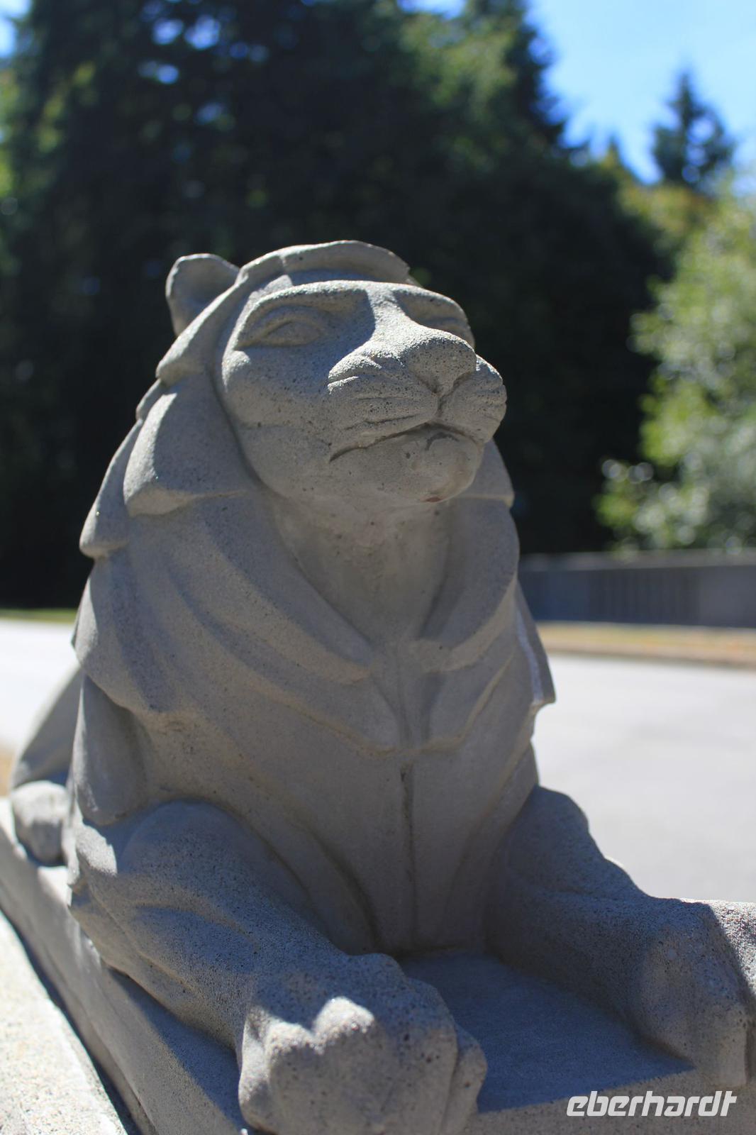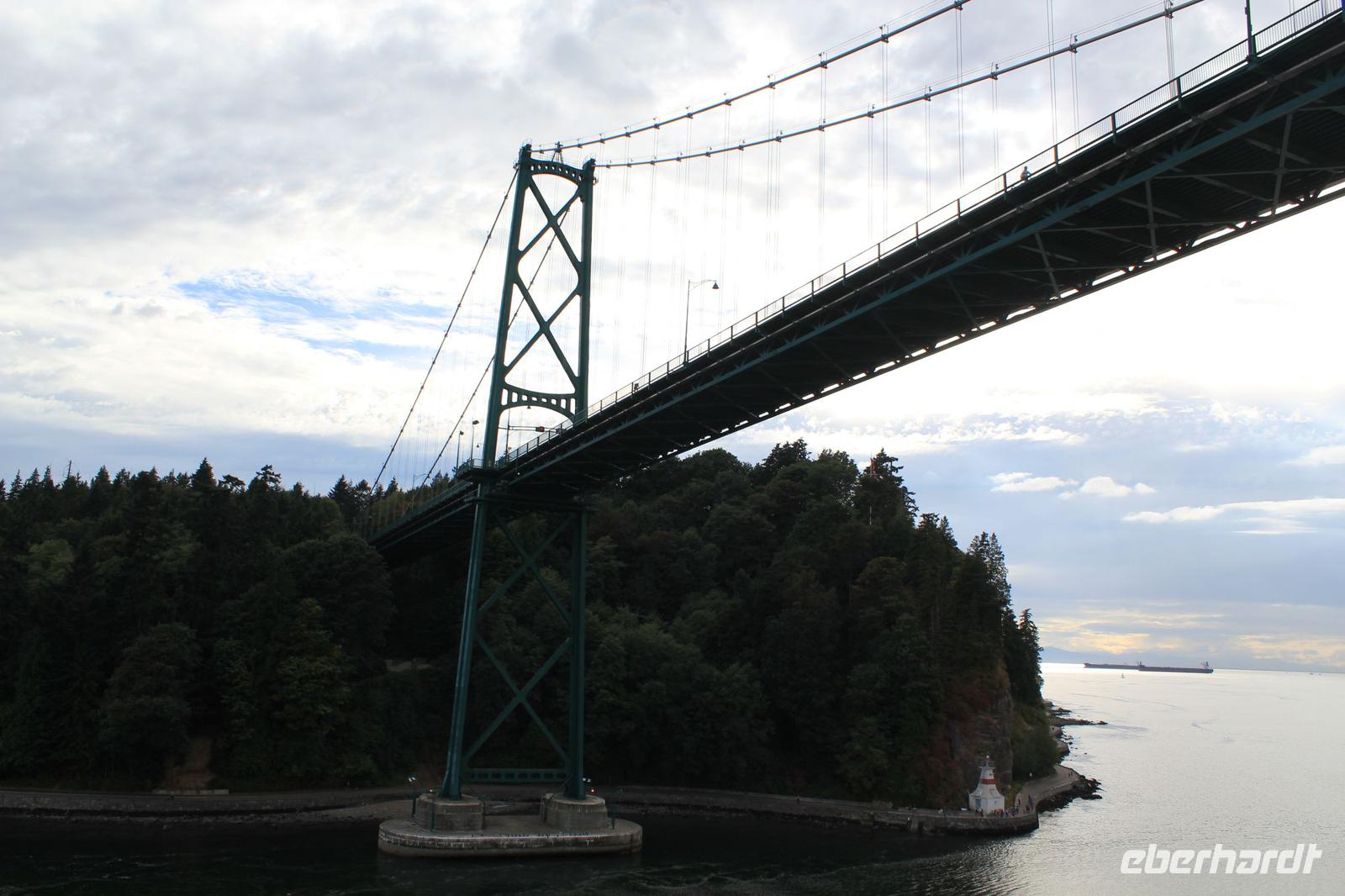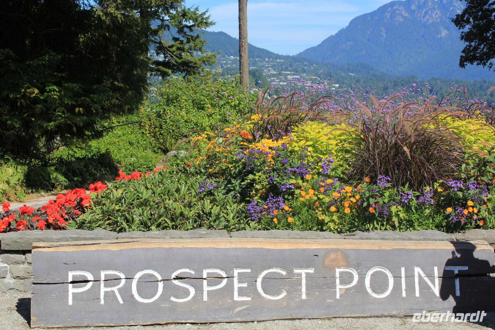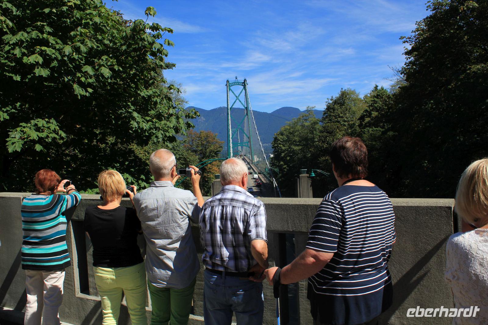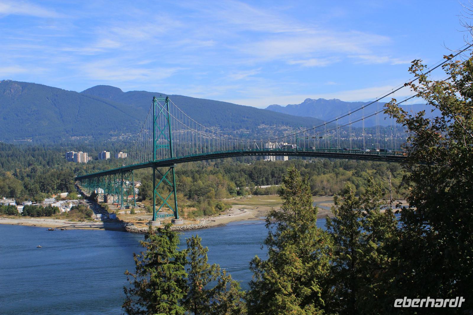 Wir umfahren den Park weiter und wollen uns noch einem weiteren herrlichen Aussichtspunkt widmen. Am Prospect Point kommen wir der gewaltigen, grüngestrichenen Lions Gate Brücke ganz nah, durch die wir vor gut einer Woche mit dem Schiff ausliefen. Die 1938 eingeweihte Brücke wurde von den Guinness-Brüdern finanziert, wird heute von 2 steinernen Löwen bewacht und führt hinüber nach North Vancouver.