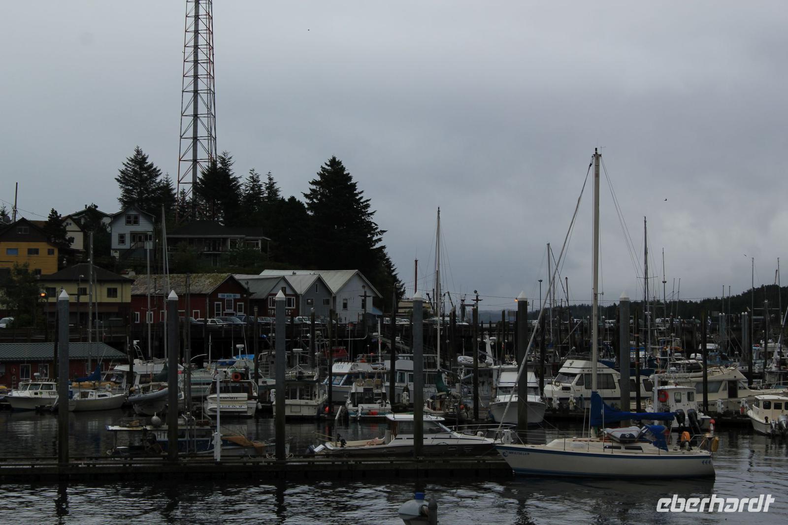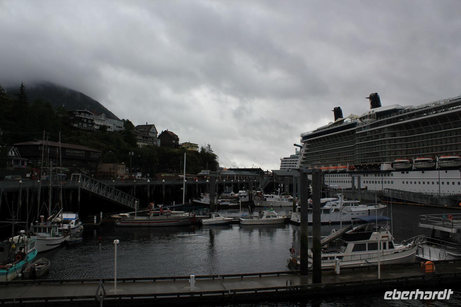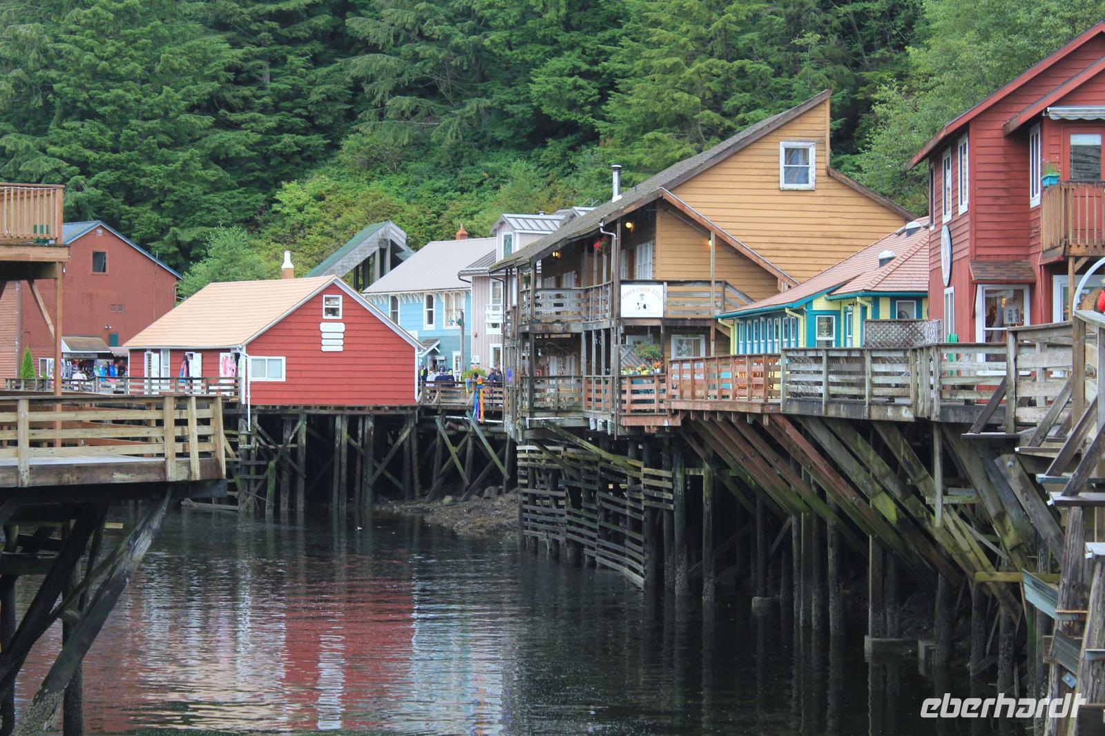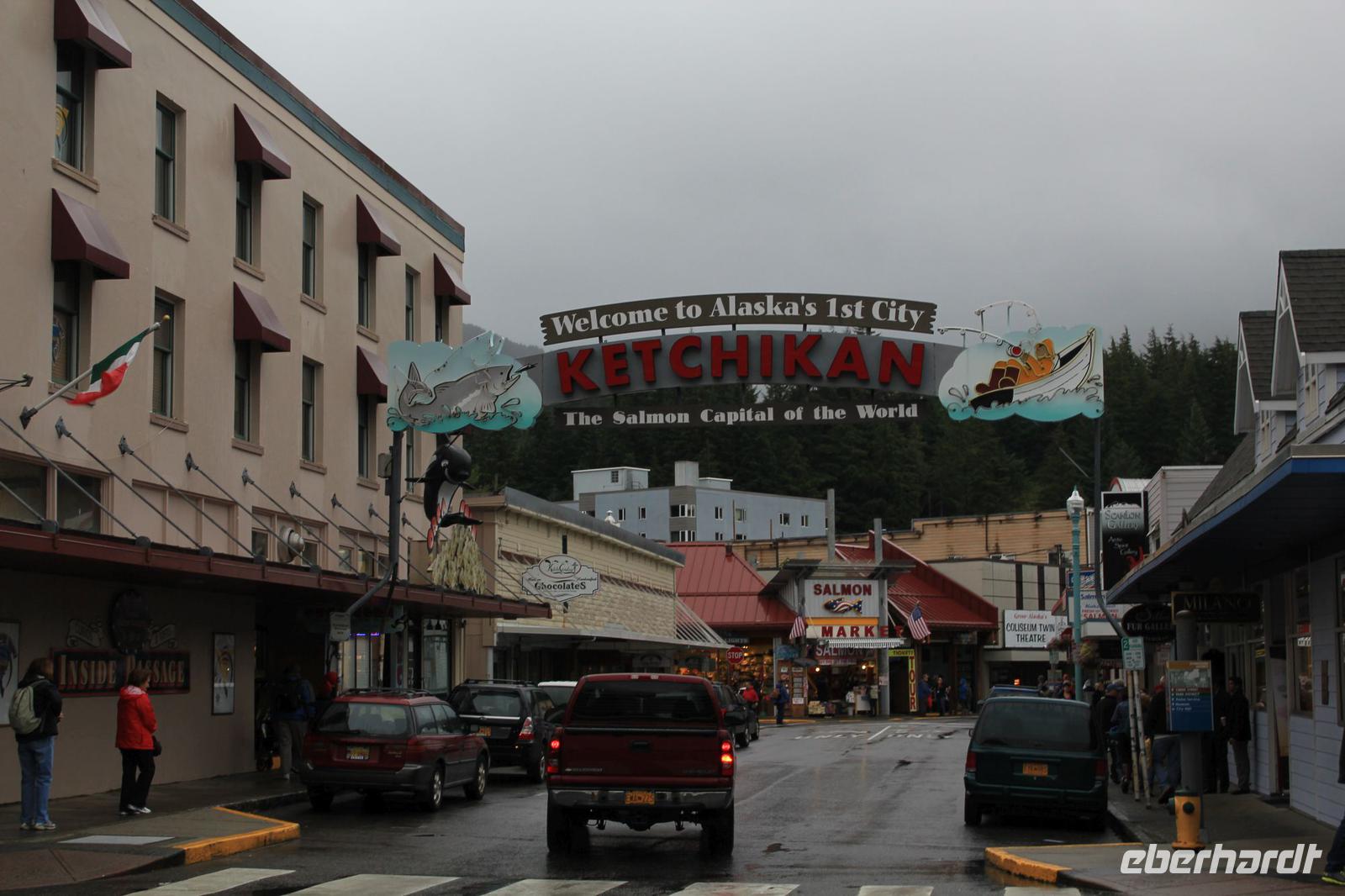 Unser erster Landgang steht an! Das kleine Städtchen Ketchikan begrüßt uns mit - Regen! Wie sollte es anders sein, denn schließlich zählt der Ort zu einem der regenreichsten der Welt. Unsere Stimmung wird dadurch aber nicht getrübt und wir freuen uns darauf die bunte Stadt mit ihren teilweise auf Holzpfählen errichteten Häuschen kennenzulernen. „Hauptstadt der Lachse" lautet der Untertitel der Stadt und auch mit der größten Totempfahlsammlung der Welt brüstet man sich hier.