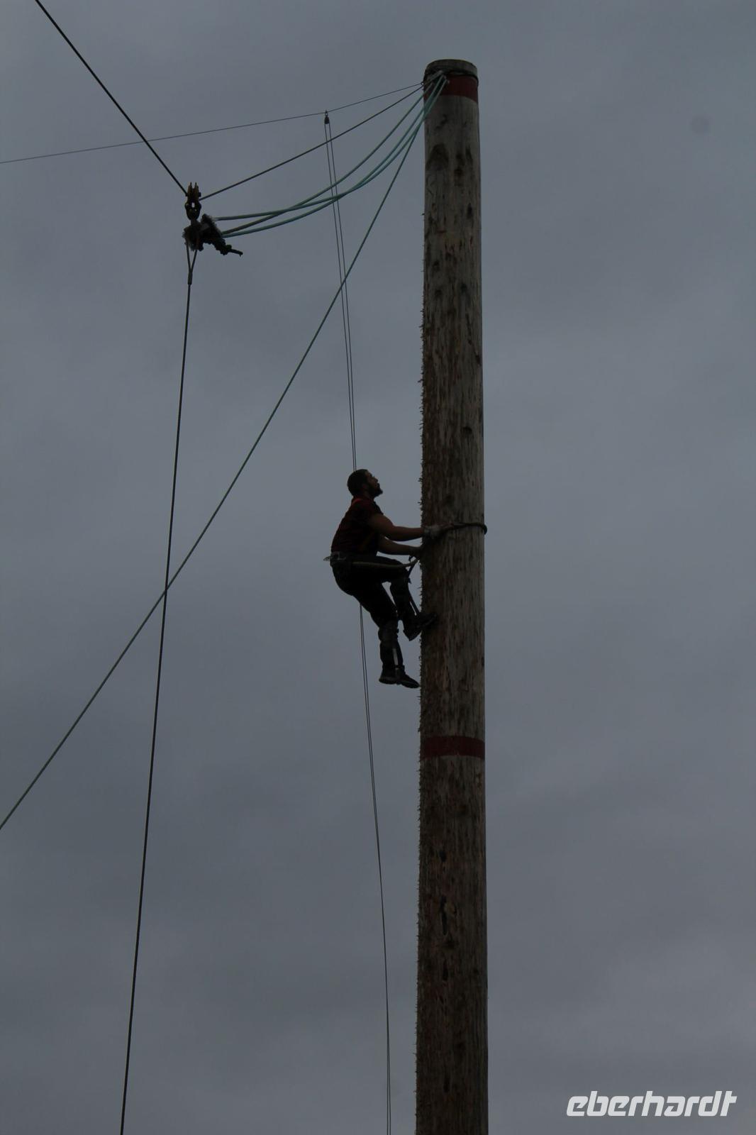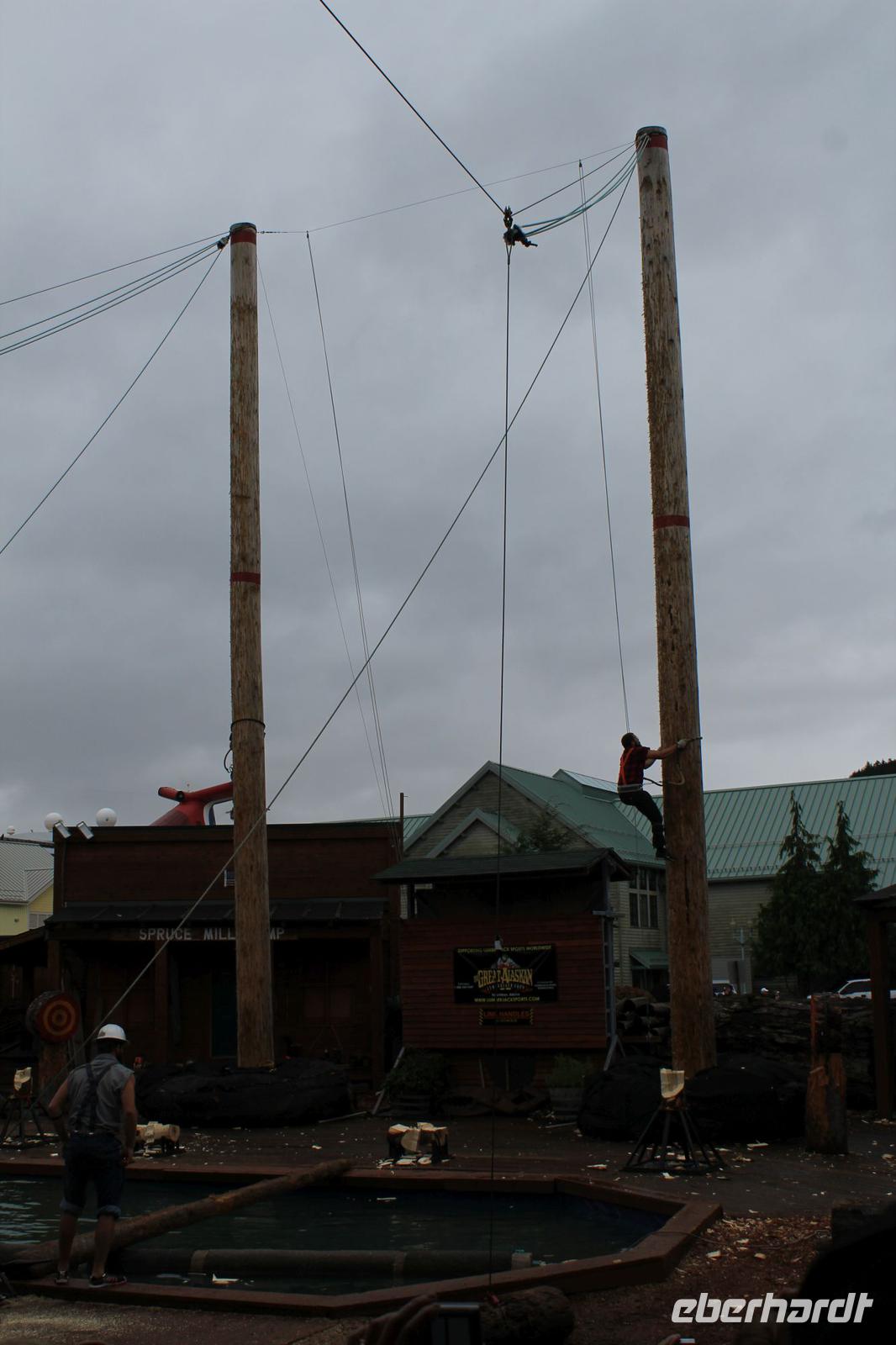 Um 10:30 Uhr treffen wir uns um typisch amerikanisches Entertainment zu erleben: eine Lumberjack Show! Dabei treten 2 kanadische gegen 2 US-amerikanische Holzfäller in verschiedenen Disziplinen, wie Baumstammsägen, Baumstamm hochklettern oder einfach nur doofen Sprüchen klopfen, gegeneinander an. Begleitet von lautem Gejohle und Anfeuerungsrufen des Publikums geben die 4 Jungs in Latzhosen, Hosenträgern und Karohemden ihr Können zum Besten. Sehr belustigend, amüsant und so richtig amerikanisch!