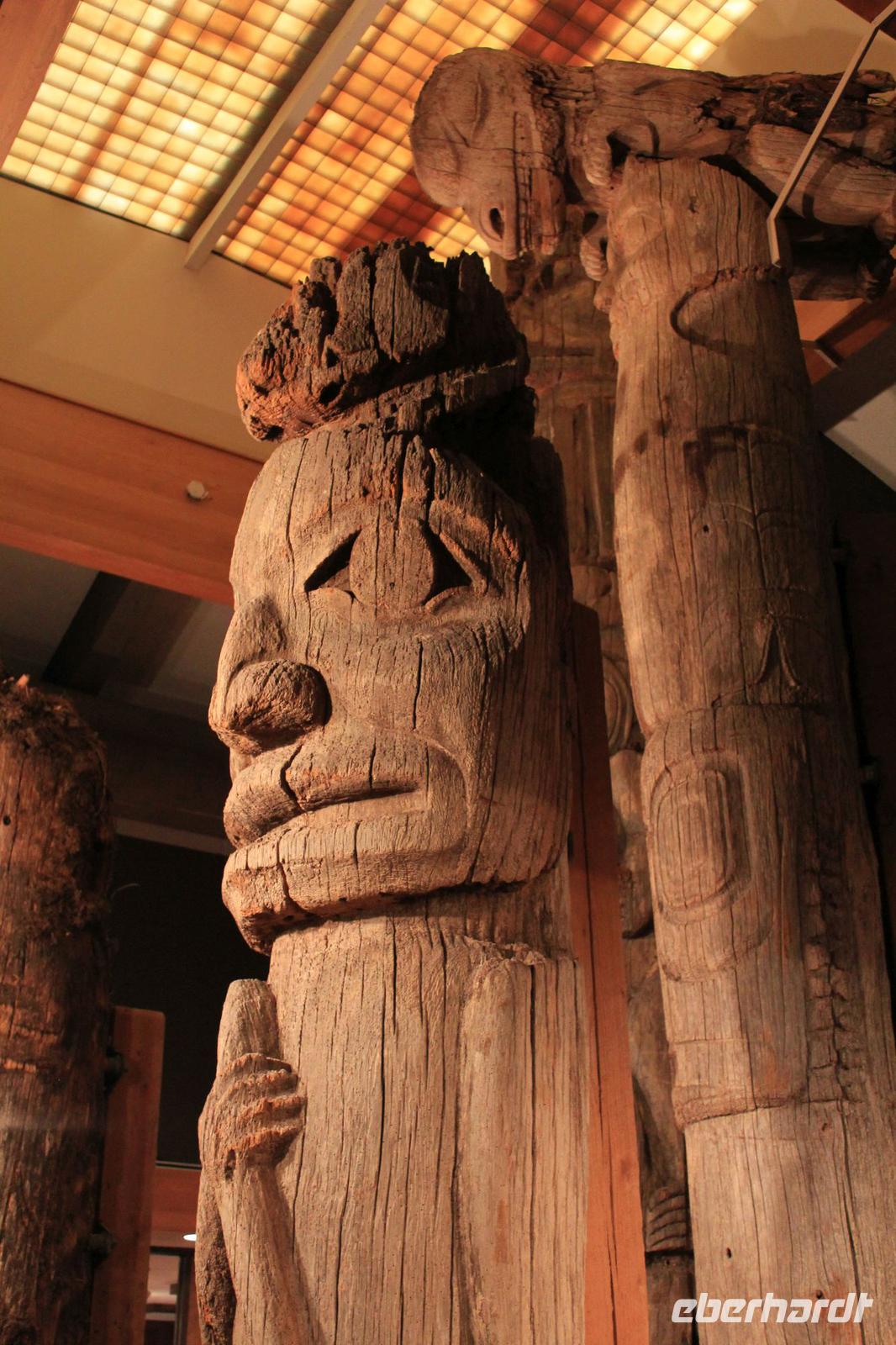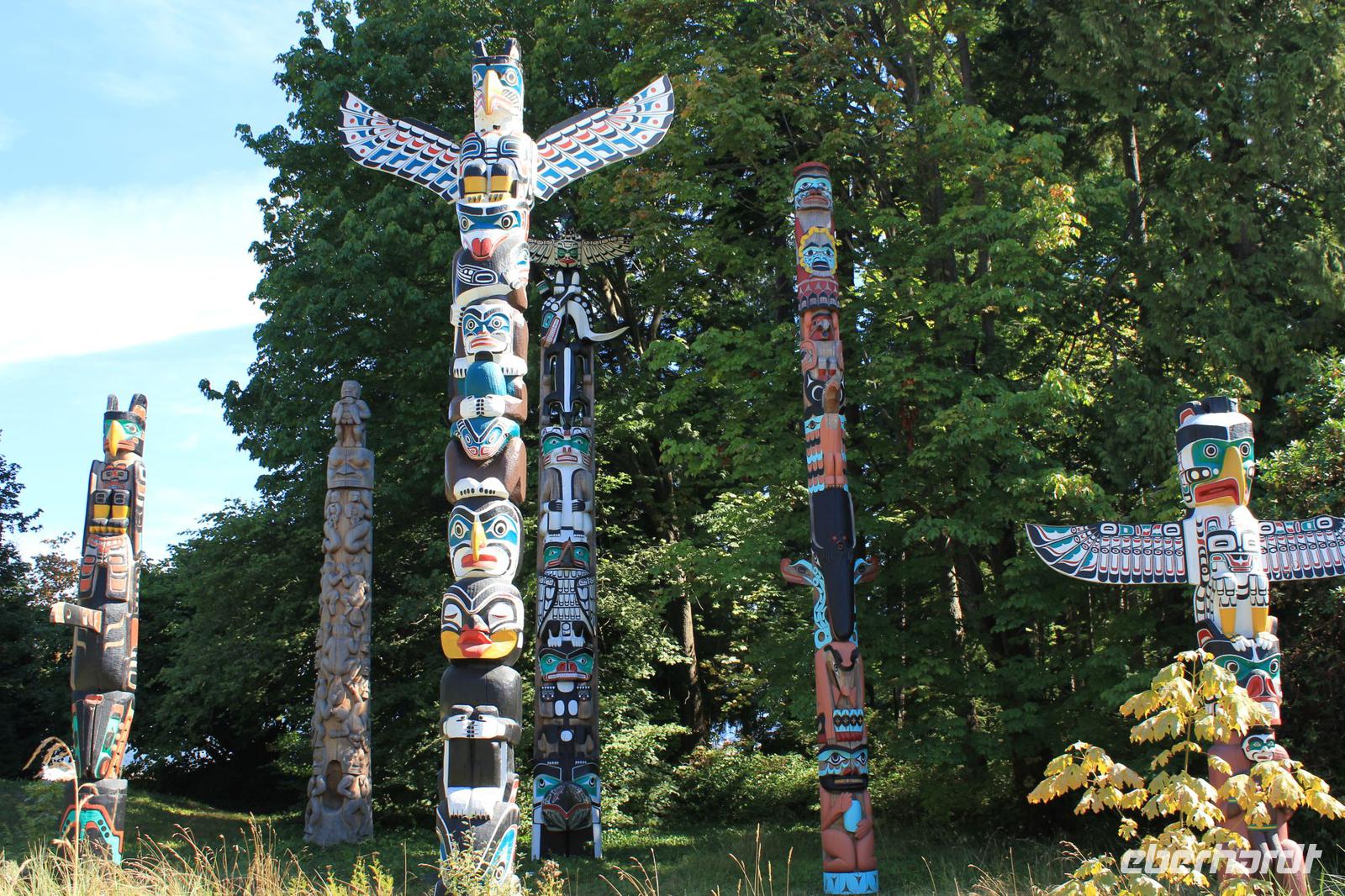 Jetzt besuchen wir die grüne Oase der Stadt. Der ca. 1.000 ha große Stanley Park ist ein Freizeit-und Sportparadies für Fahrradfahrer, Wanderer, Jogger, picknickende Familien und Spaziergänger. Ein 10 km langer Fuß- und Radweg umspannt die Halbinsel und es wimmelt von gut gelaunten, aktiven Menschen! Nicht nur das sehenswerte Vancouver Aquarium befindet sich hier, sondern auch die weltbekannte Totempfahlsammlung. Die eindrucksvollen Pfähle sind im 19. bzw. 20. Jh. von Angehörigen verschiedener Nordwestküsten-Indianerstämme geschnitzt wurden. Jeder erzählt seine eigene Geschichte und stell ein Kunstwerk für sich dar. Unseren Blick von den Totempfählen abwendend haben wir einen traumhaften Blick auf die glitzernde Skyline der Stadt, die sich im klaren Wasser spiegelt! Hier im Stanley Park sind wir umgeben von roten Zedern und dicken Douglasien, die die Umgebung einem Urwald gleichen lassen!