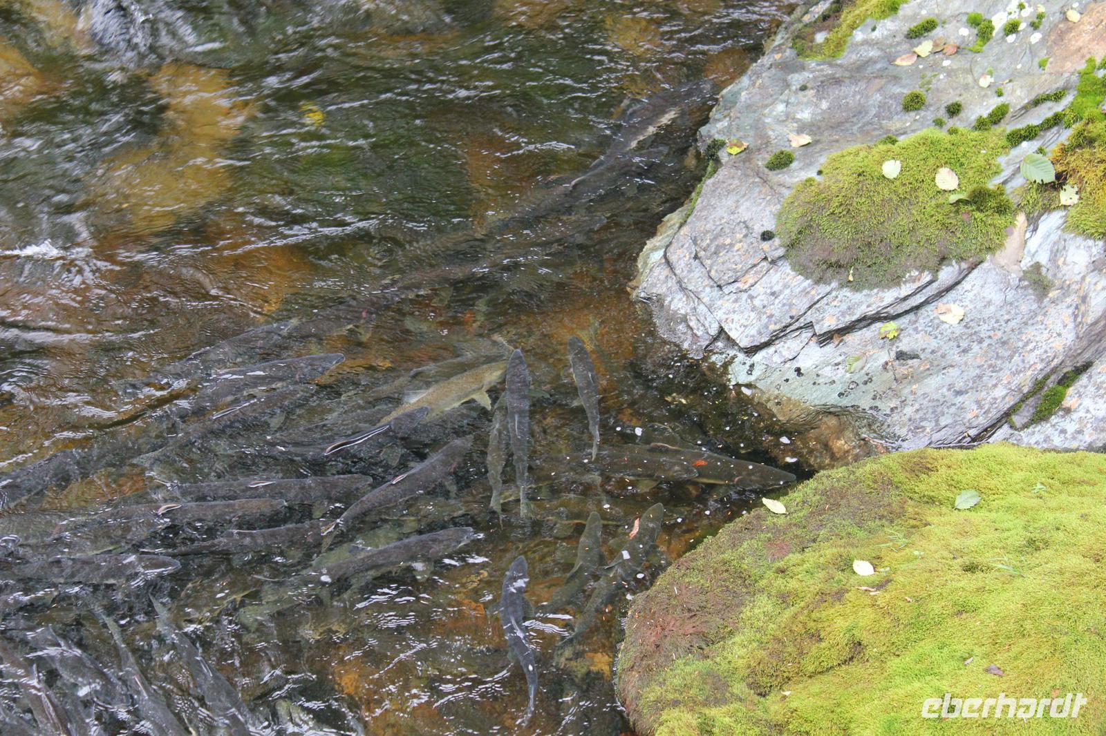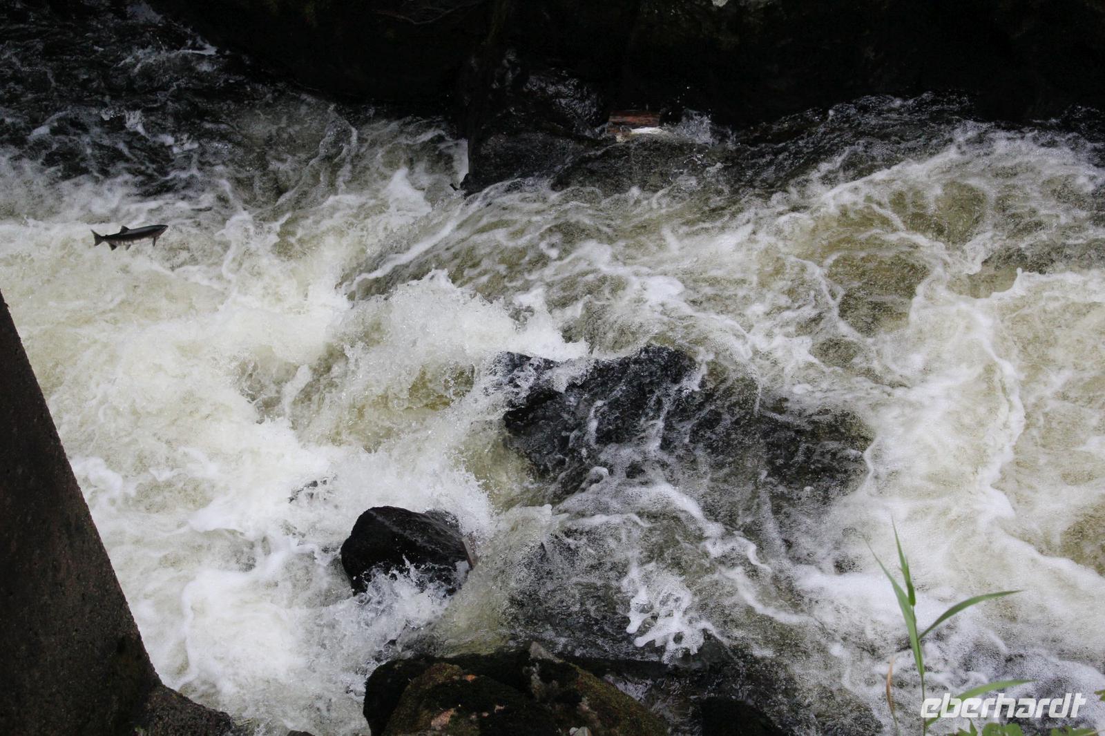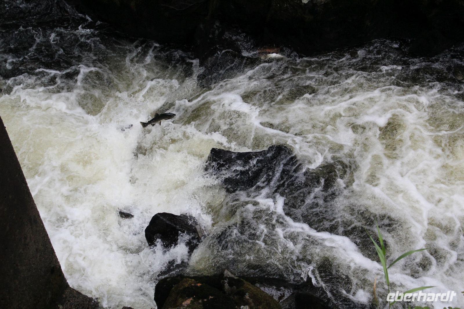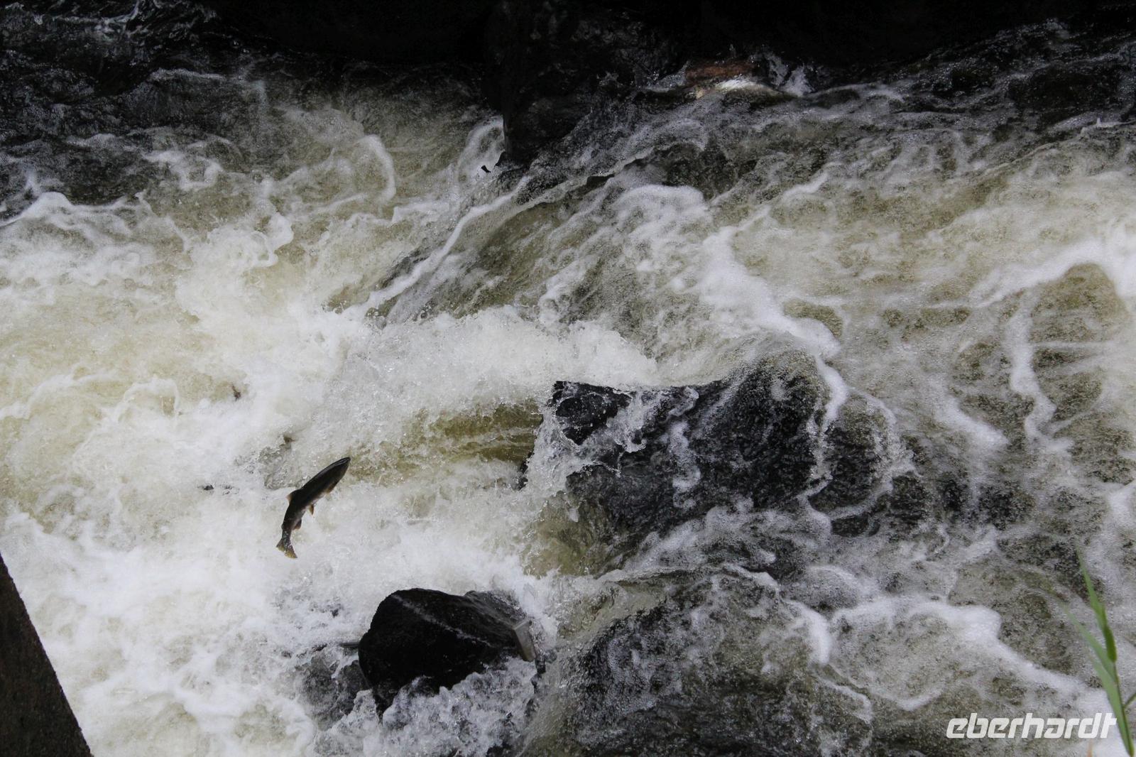 Danach wollen wir das einstige Goldgräberstädtchen noch weiter erkunden und unser Weg führt uns entlang der auf Stelzen im Wasser errichteten Creek Street durch das ehemalige Rotlichtviertel der Stadt. Immer wieder zieht es uns an das Geländer und wir starren gebannt auf den kleinen Fluss, denn was sich hier abspielt, hat so noch keiner von uns gesehen: Tausende Lachse schwimmen dicht an dicht gegen den Strom aufwärts! Immer wieder gilt es Stromschnellen und Treppen zu passieren und die großen (und leckeren) Fische kämpfen sich mit aller Kraft weiter und weiter! Immer wieder sehen wir die Tiere bei ihren tollkühnen Sprüngen die Fischtreppe hinauf! Ein Spektakel sondergleichen und ein wenig Bewunderung bringen wir den Lachsen schon entgegen, die auf Ihrem Weg zum eigenen Geburtsort bereits tausende Kilometer ohne Nahrung geschwommen sind, um nach dem Laichen schließlich zu sterben.