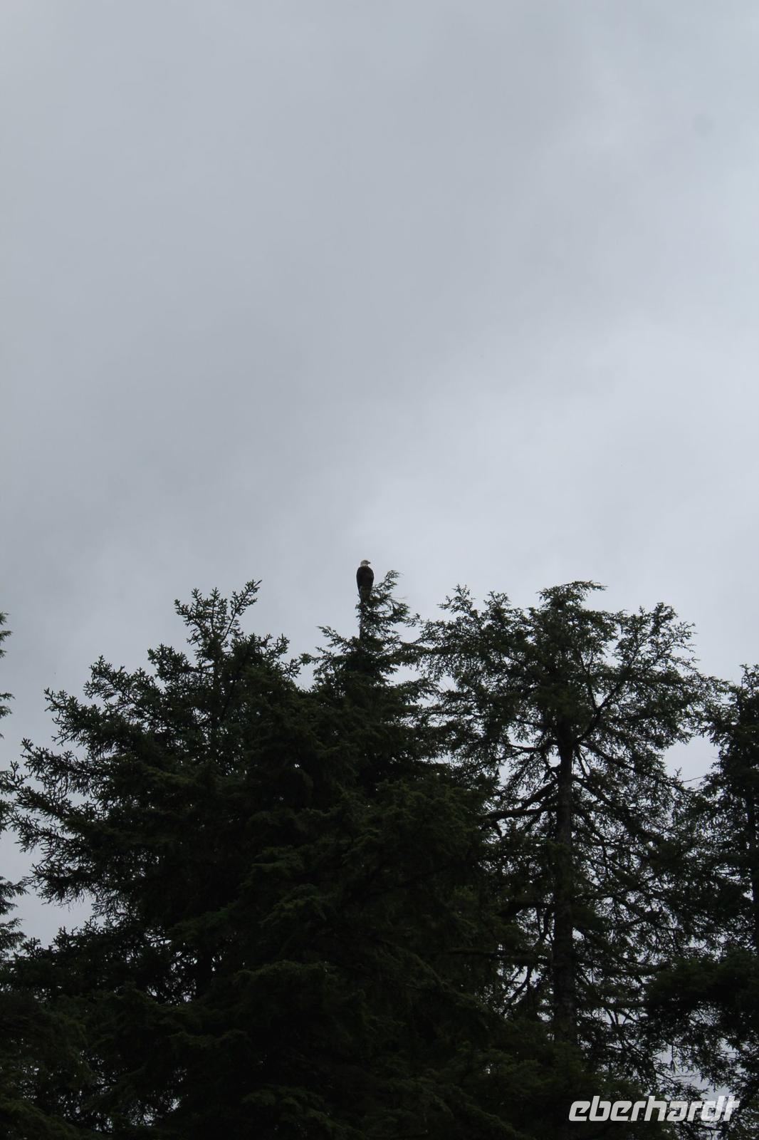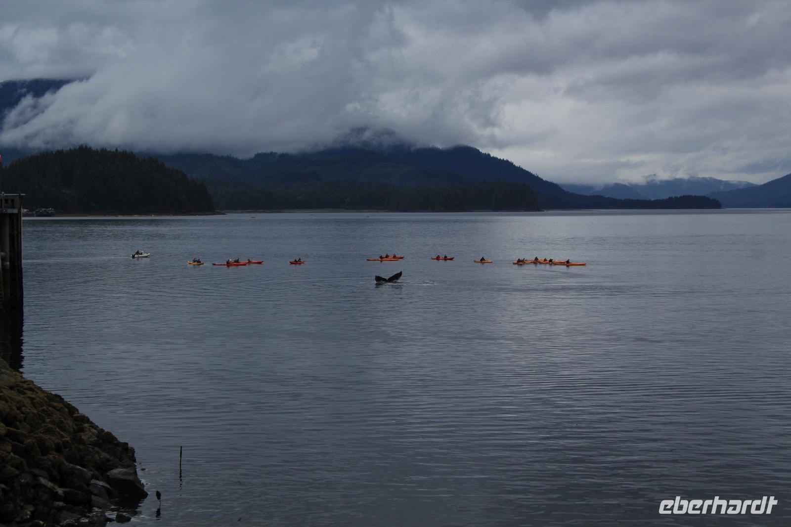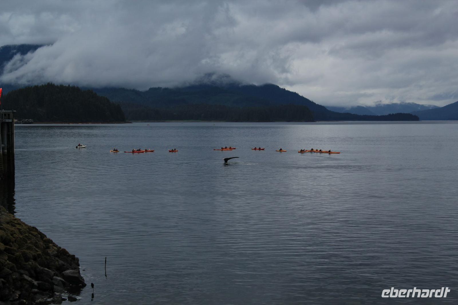 Heute wird getendert! Mit den kleinen Rettungsbooten erreichen wir nach und nach das nahegelegene Ufer. Hier sind wir wirklich umgeben von nichts als Natur, Regenwald, hohen Bergen und rauen Küsten! Ein Paradies für Naturliebhaber und -sportler und Ausgangspunkt für Erkundungen im nahe gelegenen Glacier Bay Nationalpark. Erst seit 2004 ein Kreuzfahrthafen, darf hier immer nur ein Schiff anlegen. Das heißt wir haben die Idylle heute quasi für uns allein. Der Icy Strait Point stellte einst den sehr erfolgreichen Standort einer Konservenfabrik dar. Seit 1912 wurde hier Lachs verarbeitet und Zeugnis darüber liefert heute das sich noch im selben Gebäude befindende sehr interessante Museum. Sowohl der Icy Strait Point als auch das ca. 1 km entfernte Dorf Hoonah liegen fest in der Hand der hiesigen Indianer: der Tlingit. Über die Küstenindianer, die durch das milde Klima und einem ständigen Überfluss an Holz, Lachs und Wild ein angenehmes Leben hier an der Küste führten, wollen wir heute mehr erfahren. Ihrem speziellen Glauben nach, besitzt jedes Wesen, jedes Ding eine Seele. Sehr interessant ist außerdem, dass man als Tlingit in eine Stammeshälfte hinein geboren wird: entweder in die der Raben oder in die der Wölfe. Die Tlingit sind ein anerkanntes Volk und können so unbeschwert leben. Ganz so einfach ist es dann aber doch nicht, denn die Schattenseite des vom Staat bezuschussten Lebens, bei dem das Geld gerade so ausreicht um nicht arbeiten zu müssen, sehen wir bei unserem morgendlichen Spaziergang nach Hoonah. Der Großteil von uns schlendert bei herrlichem, recht mildem Wetter an der Uferbucht entlang und nachdem wir einen hübschen Aussichtpunkt passiert haben, bei dem sich unser Kreuzfahrtkutter in seiner vollen Pracht aufnehmen lässt, dauert es gar nicht lange und wir erspähen unseren ersten Weißkopfseeadler! Hoch oben auf einer Baumspitze, thront das majestätische Tier über „seinem Revier"! Doch es sollte noch besser kommen: plötzlich, wie aus dem nichts, taucht etwa 20 m vom Ufer entfernt ein gigantischer Wal auf! In einer Seelenruhe stößt er geräuschvoll seine Fontäne in die Luft, zeigt uns seinen buckeligen Rücken und taucht, seine herrliche Fluke in die Lüfte reckend, wieder ab! Wir sind vollkommen ergriffen, die Münder bleiben uns offen stehen und wir vergessen fast das Drücken des Kameraauslösers! Ein so mächtiges Tier in so unmittelbarer Nähe zu sehen und zu hören lässt uns alle einen Wal(l) von Glückshormonen ausschütten! Der Wal hat offensichtlich keine Eile und beehrt uns auch auf dem Rückweg noch mit seinem Erscheinen. Ein wahrhaftig einmaliges Erlebnis!
