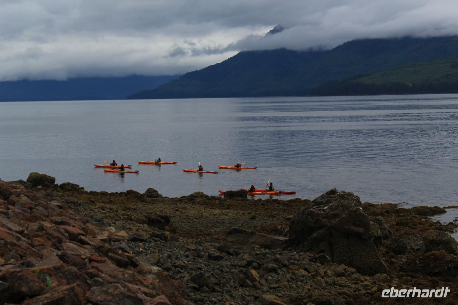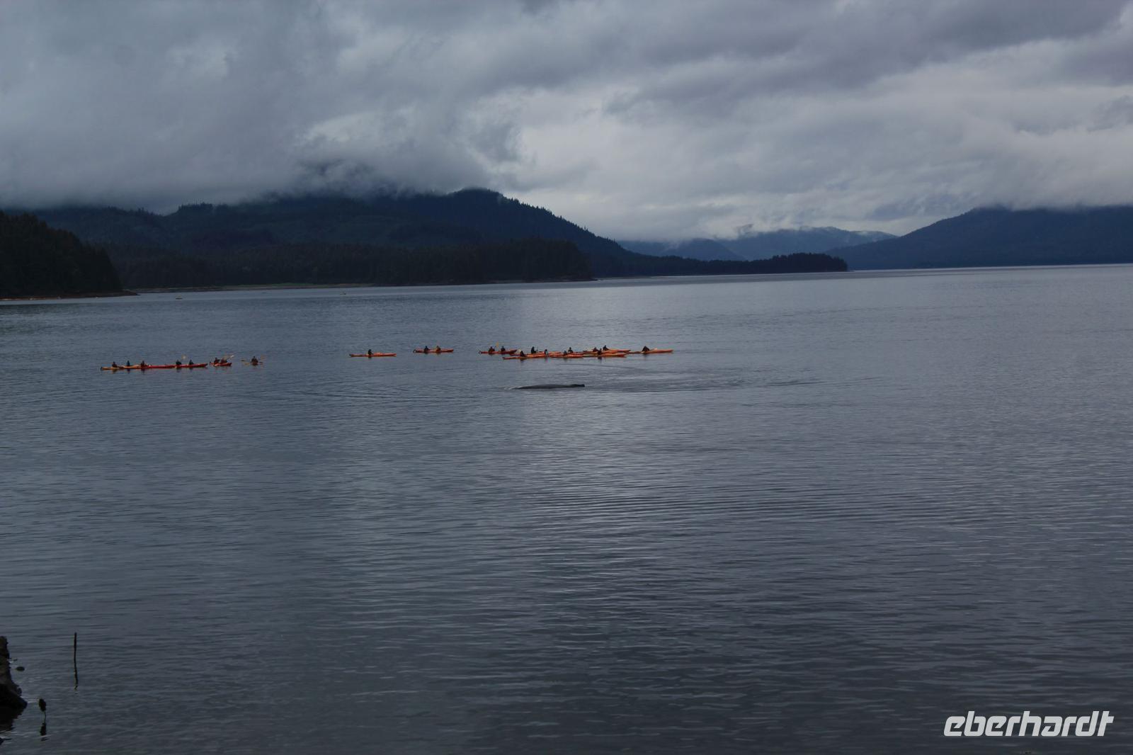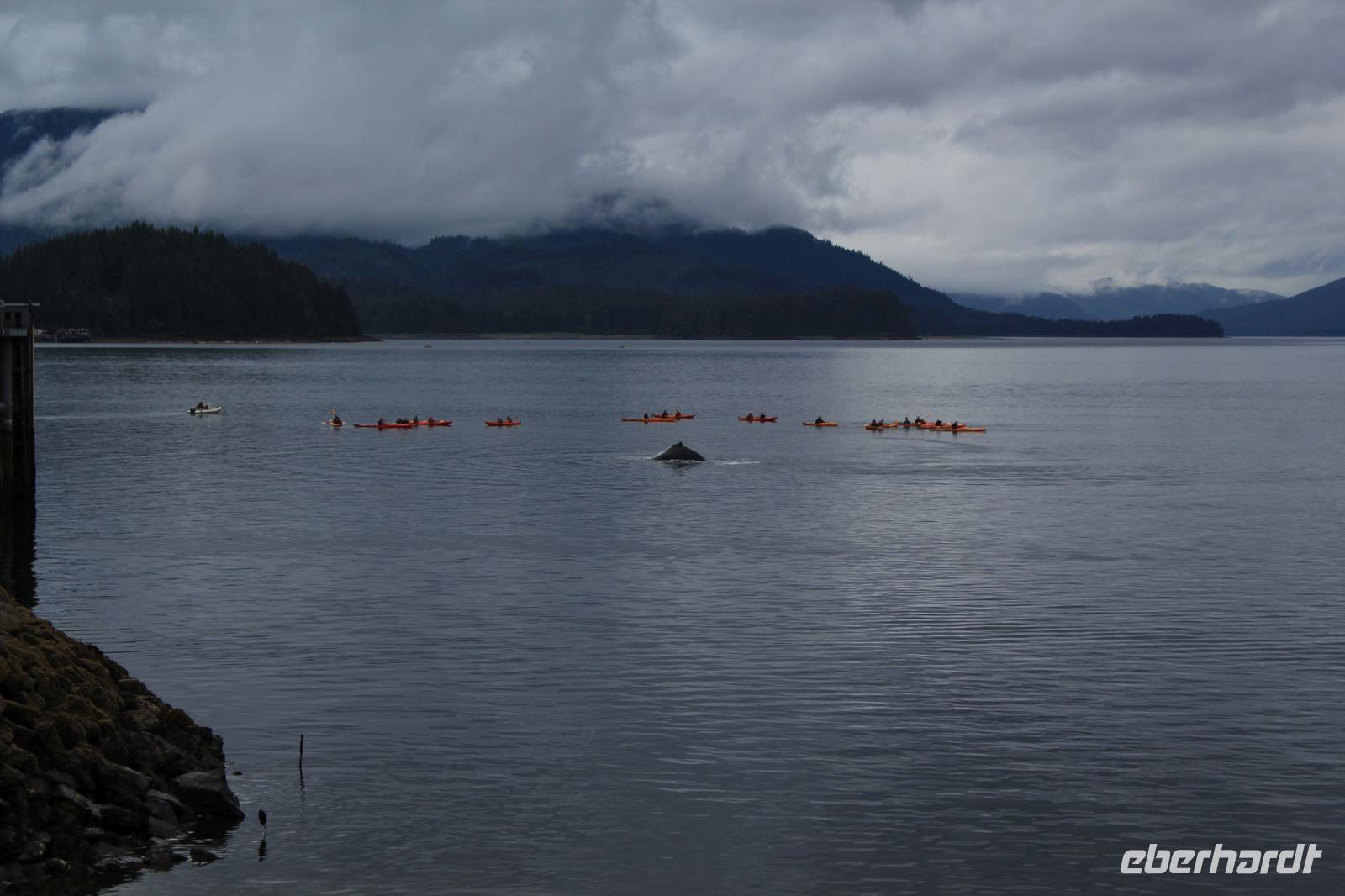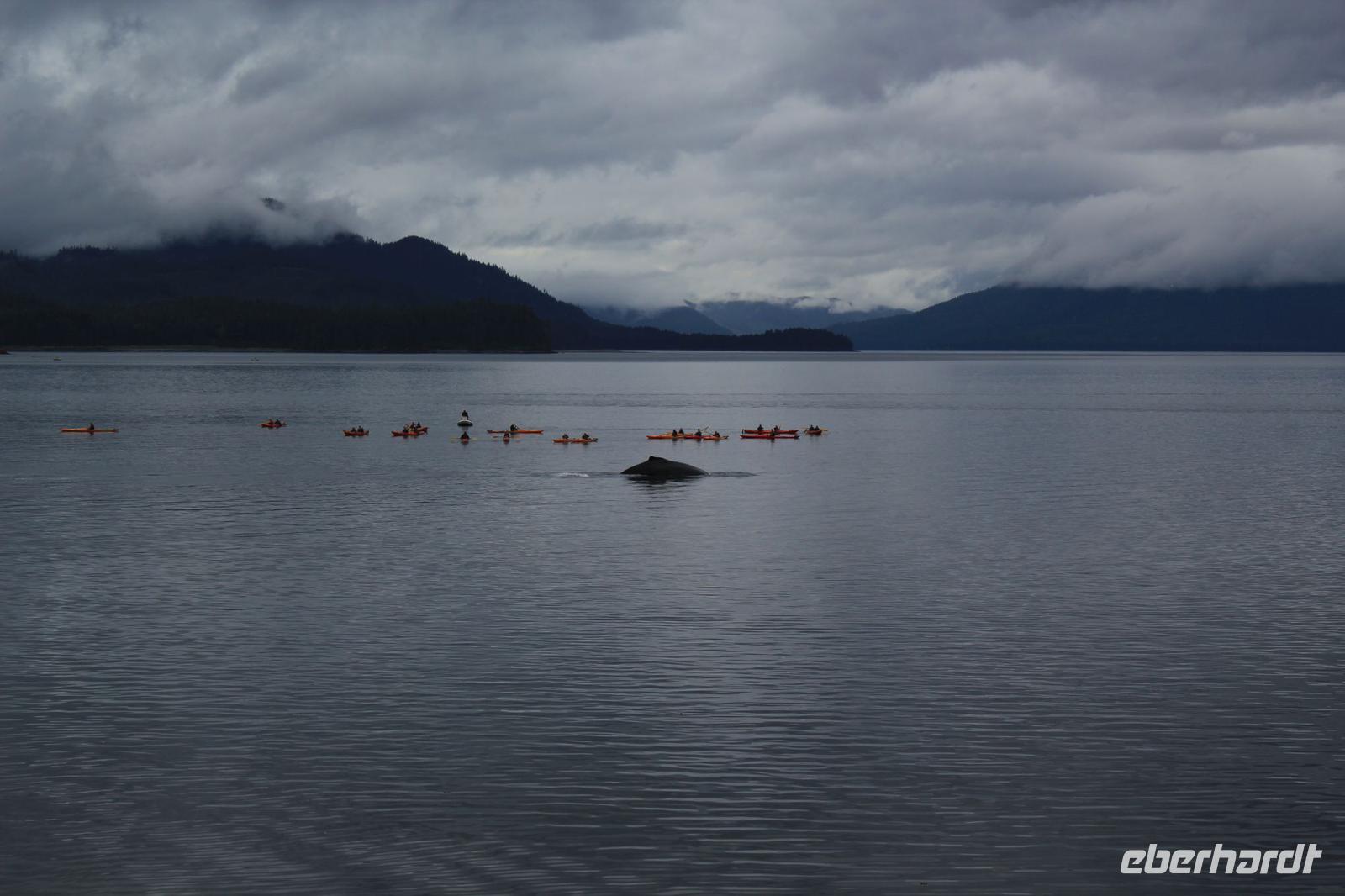 Heute wird getendert! Mit den kleinen Rettungsbooten erreichen wir nach und nach das nahegelegene Ufer. Hier sind wir wirklich umgeben von nichts als Natur, Regenwald, hohen Bergen und rauen Küsten! Ein Paradies für Naturliebhaber und -sportler und Ausgangspunkt für Erkundungen im nahe gelegenen Glacier Bay Nationalpark. Erst seit 2004 ein Kreuzfahrthafen, darf hier immer nur ein Schiff anlegen. Das heißt wir haben die Idylle heute quasi für uns allein. Der Icy Strait Point stellte einst den sehr erfolgreichen Standort einer Konservenfabrik dar. Seit 1912 wurde hier Lachs verarbeitet und Zeugnis darüber liefert heute das sich noch im selben Gebäude befindende sehr interessante Museum. Sowohl der Icy Strait Point als auch das ca. 1 km entfernte Dorf Hoonah liegen fest in der Hand der hiesigen Indianer: der Tlingit. Über die Küstenindianer, die durch das milde Klima und einem ständigen Überfluss an Holz, Lachs und Wild ein angenehmes Leben hier an der Küste führten, wollen wir heute mehr erfahren. Ihrem speziellen Glauben nach, besitzt jedes Wesen, jedes Ding eine Seele. Sehr interessant ist außerdem, dass man als Tlingit in eine Stammeshälfte hinein geboren wird: entweder in die der Raben oder in die der Wölfe. Die Tlingit sind ein anerkanntes Volk und können so unbeschwert leben. Ganz so einfach ist es dann aber doch nicht, denn die Schattenseite des vom Staat bezuschussten Lebens, bei dem das Geld gerade so ausreicht um nicht arbeiten zu müssen, sehen wir bei unserem morgendlichen Spaziergang nach Hoonah. Der Großteil von uns schlendert bei herrlichem, recht mildem Wetter an der Uferbucht entlang und nachdem wir einen hübschen Aussichtpunkt passiert haben, bei dem sich unser Kreuzfahrtkutter in seiner vollen Pracht aufnehmen lässt, dauert es gar nicht lange und wir erspähen unseren ersten Weißkopfseeadler! Hoch oben auf einer Baumspitze, thront das majestätische Tier über „seinem Revier"! Doch es sollte noch besser kommen: plötzlich, wie aus dem nichts, taucht etwa 20 m vom Ufer entfernt ein gigantischer Wal auf! In einer Seelenruhe stößt er geräuschvoll seine Fontäne in die Luft, zeigt uns seinen buckeligen Rücken und taucht, seine herrliche Fluke in die Lüfte reckend, wieder ab! Wir sind vollkommen ergriffen, die Münder bleiben uns offen stehen und wir vergessen fast das Drücken des Kameraauslösers! Ein so mächtiges Tier in so unmittelbarer Nähe zu sehen und zu hören lässt uns alle einen Wal(l) von Glückshormonen ausschütten! Der Wal hat offensichtlich keine Eile und beehrt uns auch auf dem Rückweg noch mit seinem Erscheinen. Ein wahrhaftig einmaliges Erlebnis!