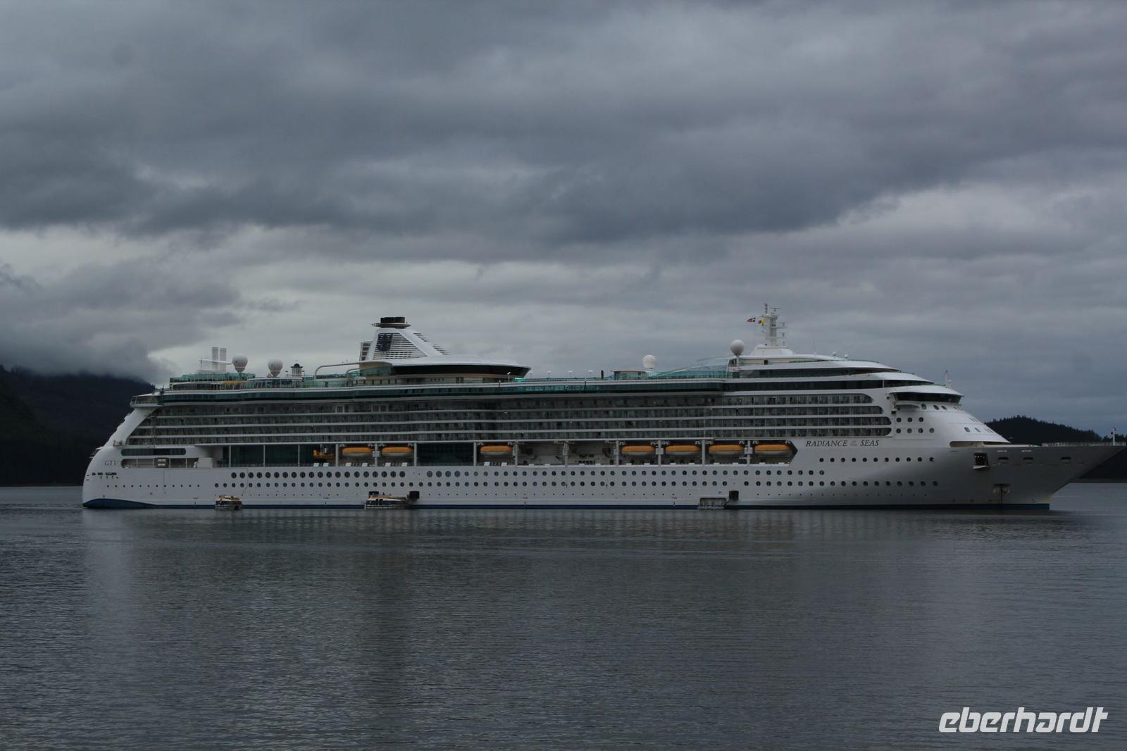 Wir durchfahren Vancouver um zum Canada Place zu gelangen, wo sich das Kreuzfahrtterminal befindet. Jetzt wird es spannend! Während sich Gerard um unsere Koffer kümmert, müssen wir nun durch die Sicherheitskontrolle, vorbei an US-Amerikanischen Grenzbeamten und durch den Check-In-Bereich. Alles meistern wir problemlos und wir betreten unser Kreuzfahrtschiff, die „Radiance oft he Seas"! Das riesige, glamourös ausgestattete Schiff bietet alles was das Herz begehrt und wir müssen uns erst einmal „einsehen", denn überall glitzert, glänzt und strahlt es! Wir beziehen unsere herrlichen, komfortablen Kabinen und der Großteil von uns will gleich das Mittagsbuffet im „Windjammer Café" ausprobieren. An Vielseitigkeit, Kreativität und Auswahl nicht zu übertreffen sollten wir hier in den nächsten Tagen noch so einigen Leckereien begegnen, die immer wieder aufs Neue unsere Entscheidungsfreudigkeit herausfordern sollten!
