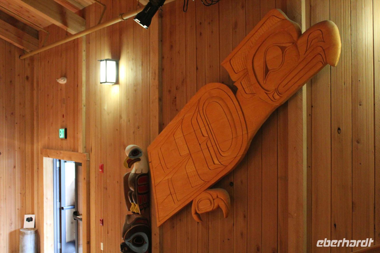 Jetzt wollen wir noch das „Totem Heritage Center" besuchen, ein Museum, das über 100-jährige Totempfähle der umliegenden Indianerclans beherbergt. Die imposanten Kunststücke, die liegend bearbeitet und dann feierlich aufgerichtet werden, geben die Geschichten und Familienchroniken der jeweiligen Clans wieder. Alle Pfähle werden aus des Indianers „tree of life" (Baum des Lebens) gefertigt: der roten Zeder. Mit deutschen Erklärungen unternehmen wir einen interessanten Rundgang, bevor jeder für sich wieder gemütlich in Richtung Hafen zurück bummelt.