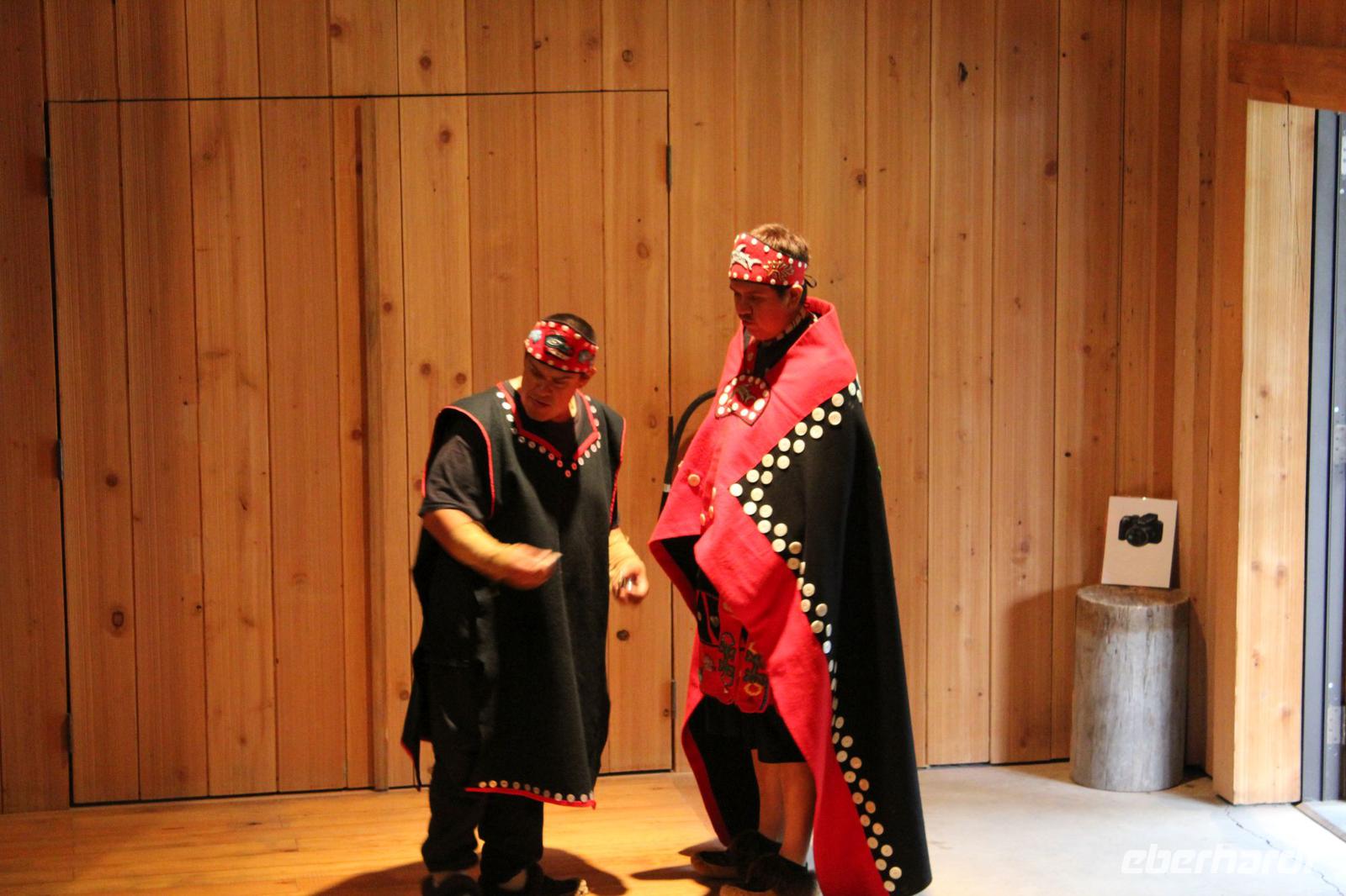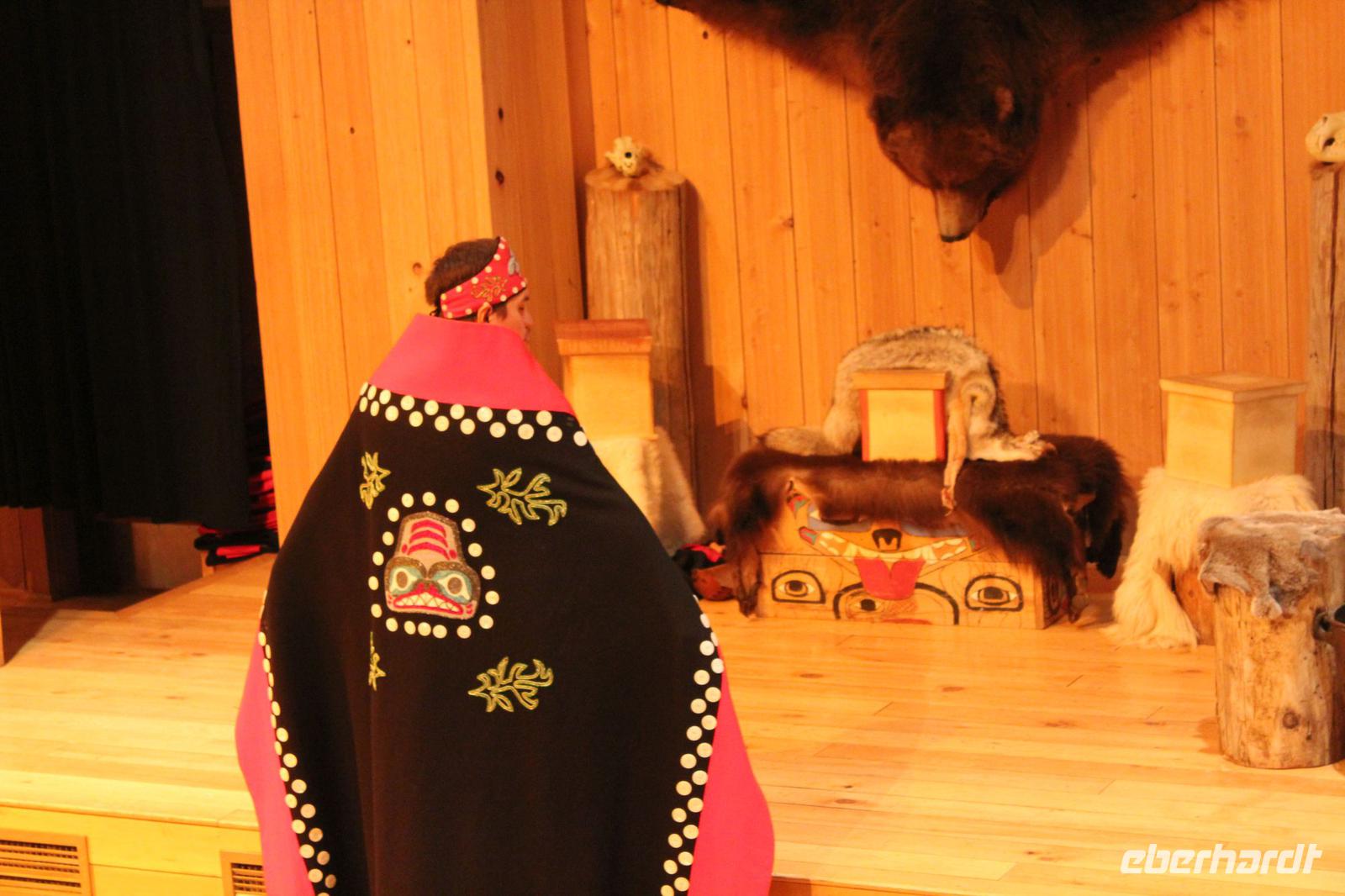 Obwohl der Tag sich bis hierher bereits gelohnt hat, freuen wir uns trotzdem auf unseren gemeinsamen Ausflug: mit einer Waldbahn geht es auf Erkundungsfahrt durch den Regenwald und an den Strand. Unser Tlingit-Indianer „Cookie" erzählt uns Wissenswertes über den Wald, dessen heimische Pflanzen und Tiere und deren Bedeutung bzw. Verwendung für die Indianer. Im Anschluss besuchen wir das komplett aus Holz gefertigte Theater der Tlingit und lehnen uns bei einer tänzerischen und erzählerischen Darbietung zurück. Die Entstehungsgeschichte der Welt aus Sicht der Tlingit wird uns anschaulich dargeboten und wir erfreuen uns an den kunstvoll verarbeiteten traditionellen Kleidern und an dem von einer Trommel begleiteten Tanz und Gesang. Der Rabe brachte den Menschen einst den Mond, die Sterne und das Tageslicht und ist damit für die Tlingit sinnbildlich der Schöpfer der Welt. Weil aber doch nicht alles so eindeutig zu verstehen war, fasst uns Elisa am Abend die Vorführung noch einmal zusammen und erklärt die dargebotene Geschichte ausführlich. Nach diesem Tag sind wir nun nahezu Experten was die Kultur und den Glauben der Tlingit-Indianer betrifft.