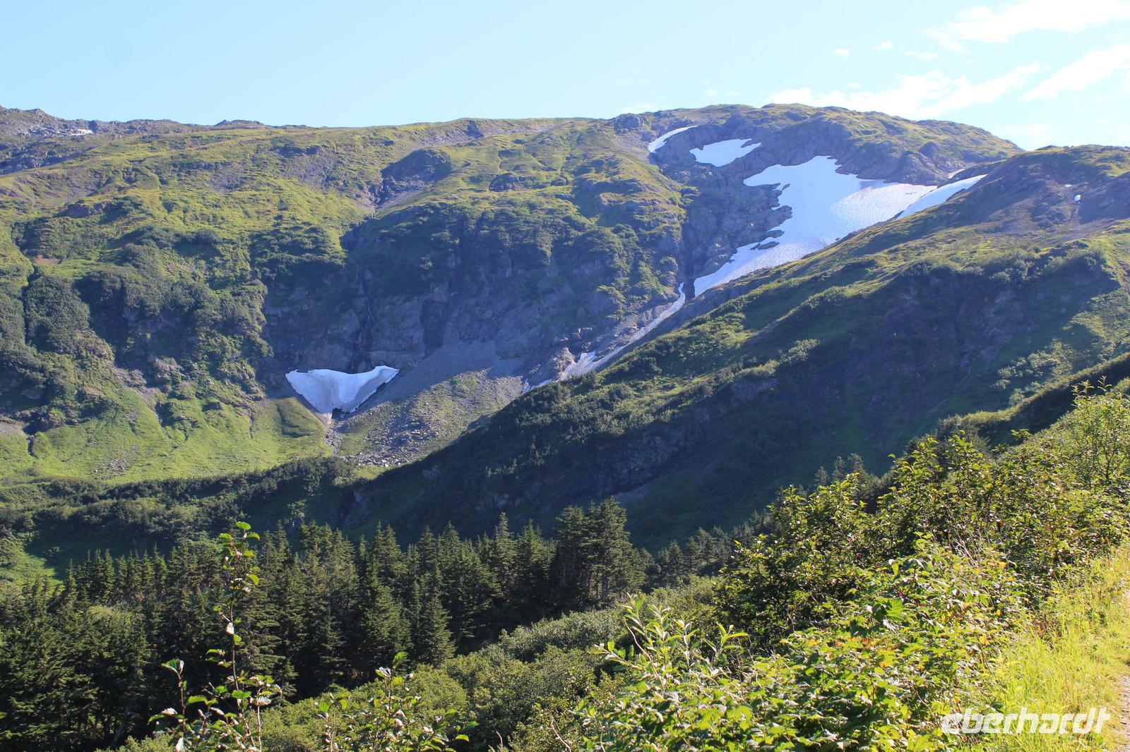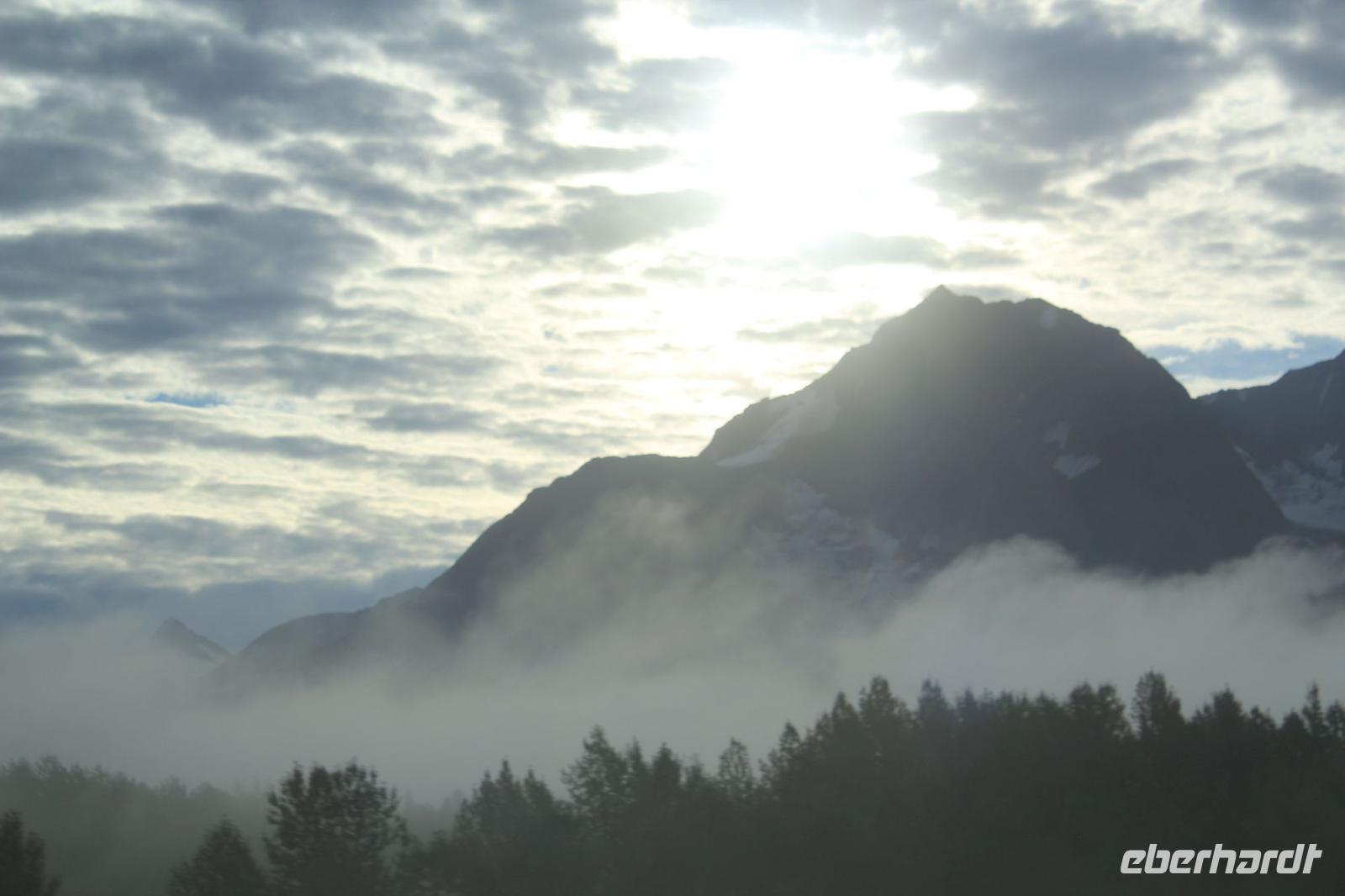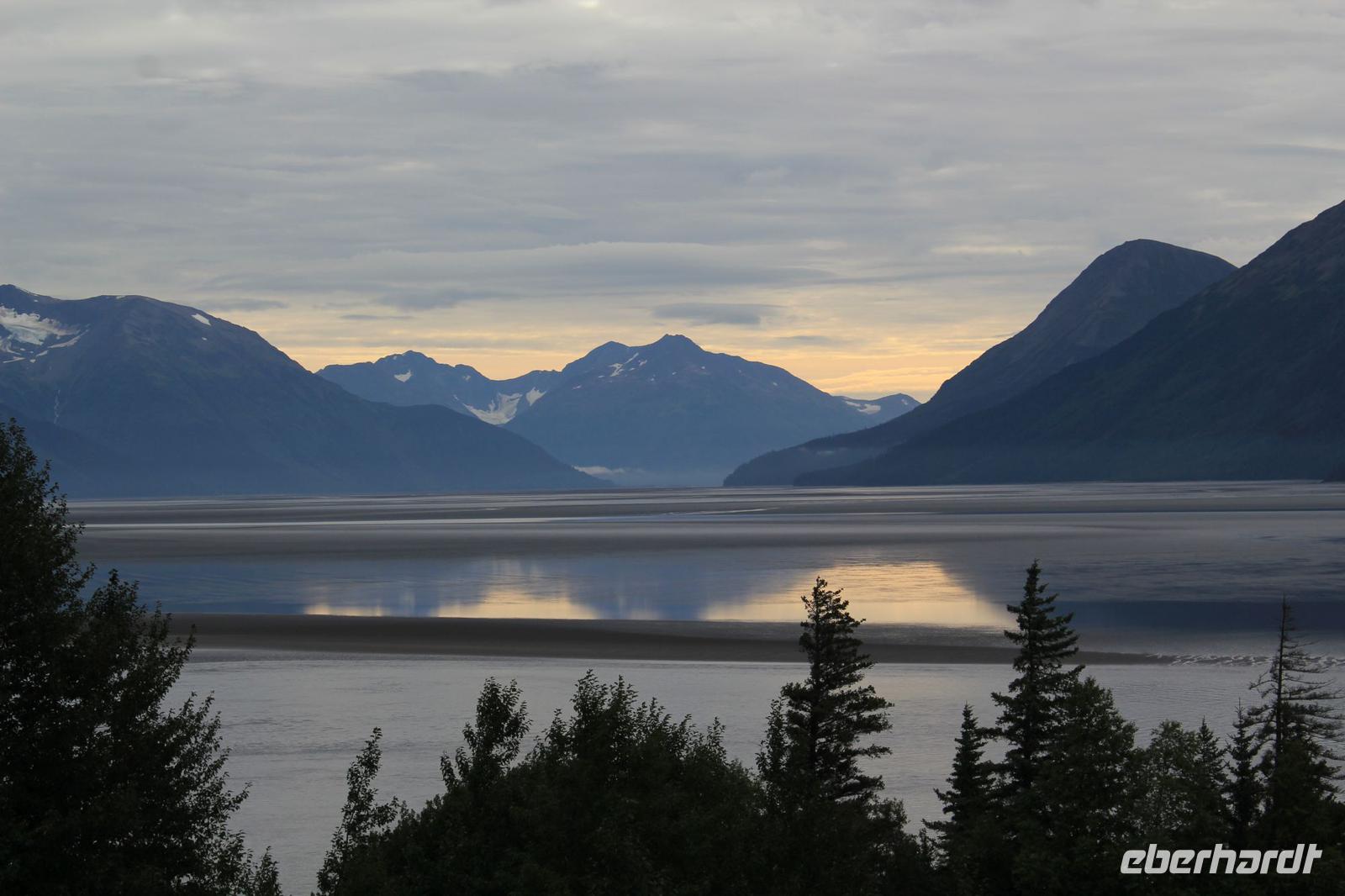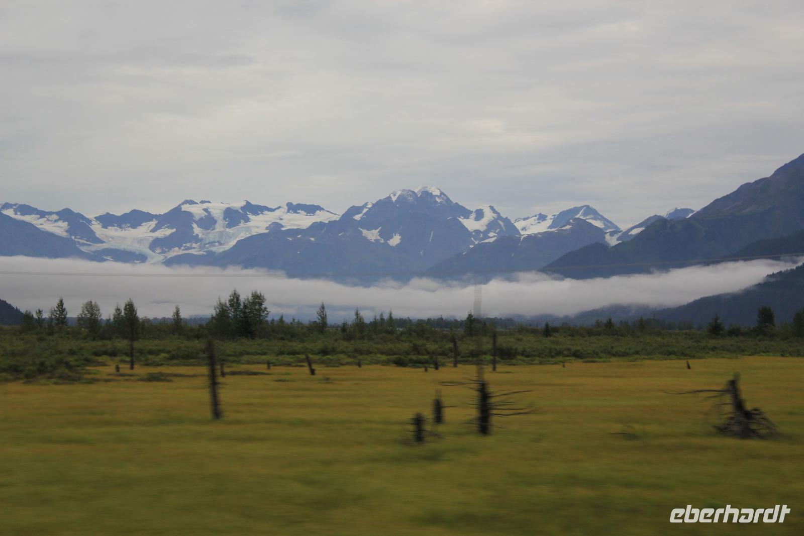 Ein letztes Mal genießen wir das vielfältige Frühstücksbuffet und dann heißt es „bye bye Radiance!" Gegen 7:45 Uhr verlassen wir unser liebgewonnenes Kreuzfahrtschiff. Alles klappt (fast) reibungslos und Reiseleiterin Hannelore erwartet uns bereits. Mit dem Bus drehen wir zunächst eine Runde durch das kleine Hafenstädtchen Seward auf der Halbinsel Kenai gelegen und werfen einen letzten Blick auf unser friedlich im Hafenbecken ruhendes Schiff. Über den Seward Highway wollen wir nun die Fahrt in Richtung Anchorage antreten. Wir durchqueren die traumhafte Landschaft Alaskas, wobei dicke, tiefhängende Nebenschwaden die Umgebung mystisch und geheimnisvoll wirken lassen. Nach unserer Fahrt entlang des Schneeflusses, der schließlich in den riesigen Kenai See mündet, machen wir einen Fotostopp am Canyon Creek um die umliegenden Berge, umspielt von Seen und bedeckt mit schier endlos grünen Wäldern, festzuhalten. Von Hannelore erfahren wir viel Wissenswertes über das Leben und die Bevölkerung hier in Alaska, während wir durch das Portage Tal fahren und den Ausblick genießen. Wir haben das Gefühl, die Natur möchte uns noch einmal zeigen, was sie zu bieten hat und was diesen Staat so einzigartig und besonders macht! Einen weiteren Stopp unternehmen wir am Bird Point und überblicken den Turnagain Arm, einst erkundet und benannt von Kapitän Cook.