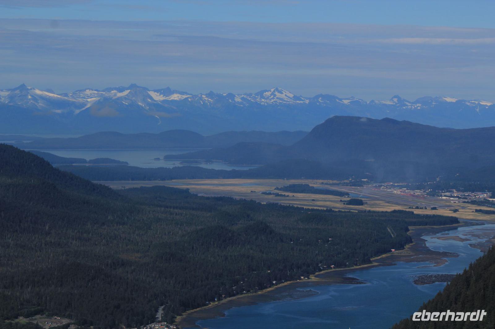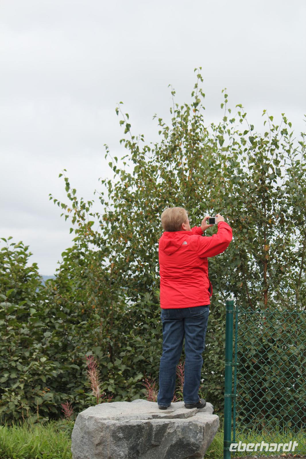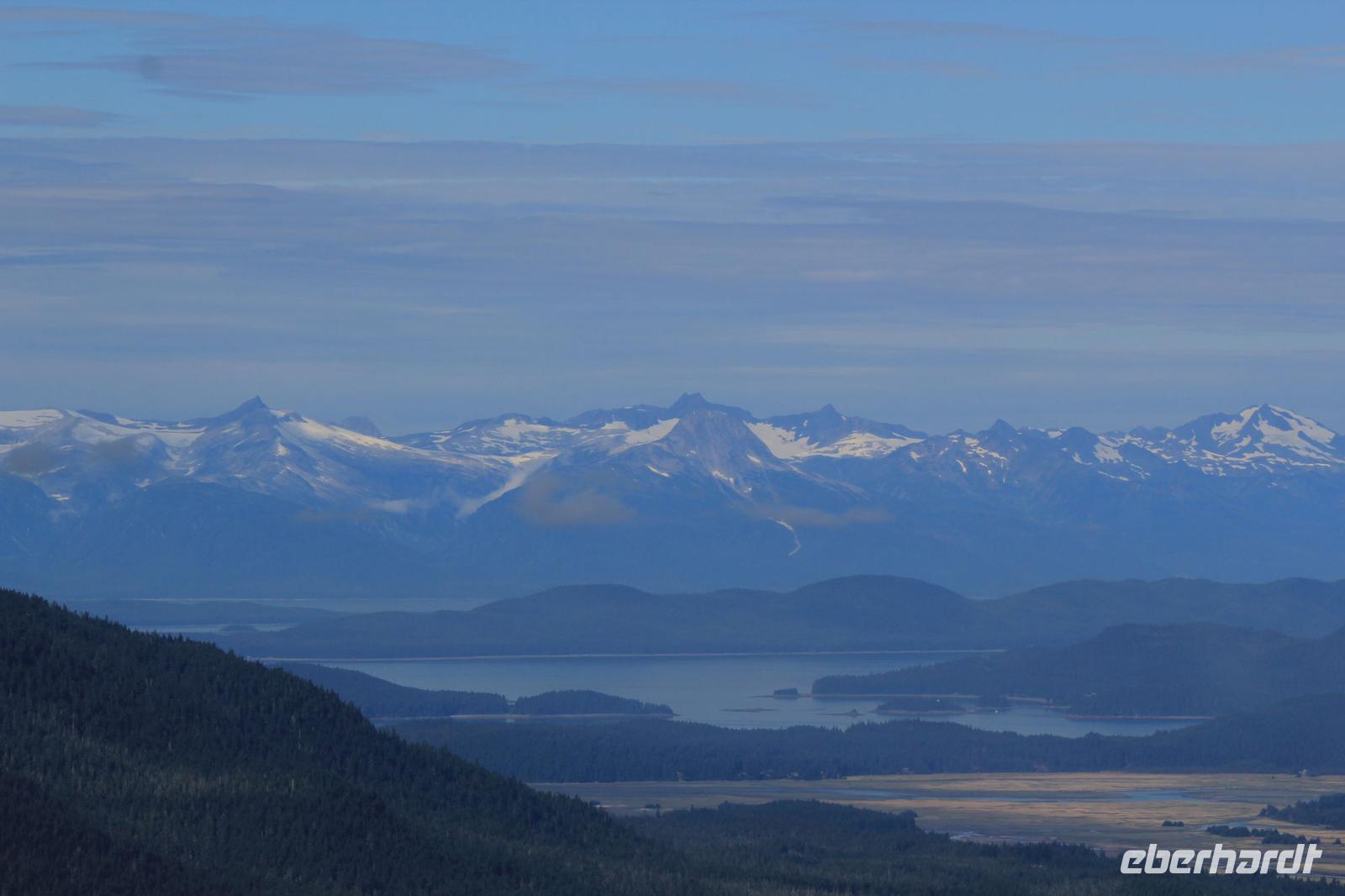Zunächst steigen wir in die Mount Roberts Seilbahn und nach der Gondelfahrt auf den 600 m hohen Berg werden wir belohnt mit einem wunderschönen Panoramablick über den Hafen, die Bergkette der Chilkat Mountains und Douglas Island. Während einige von uns sich einer hübschen Aufführung mit typischen Alaska-Klängen widmen, wandern wir anderen zum Gipfelkreuz und genießen Aussicht, grandioses Wetter und Natur pur!