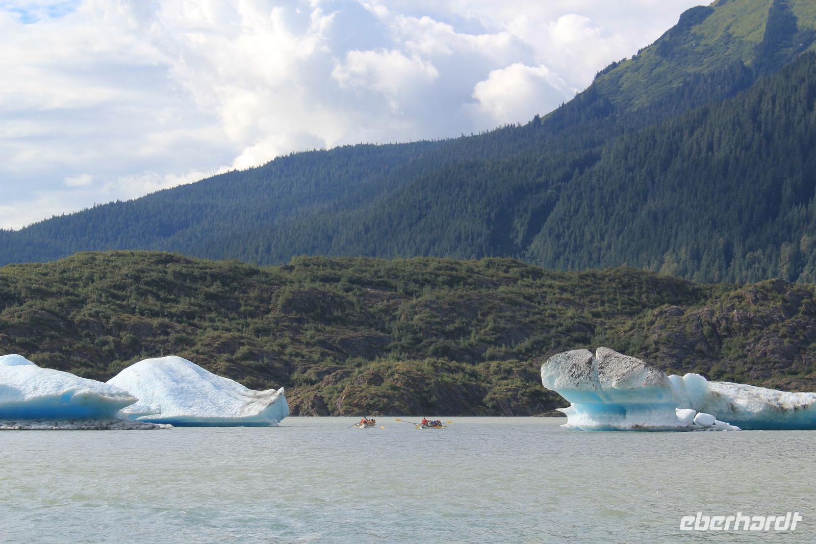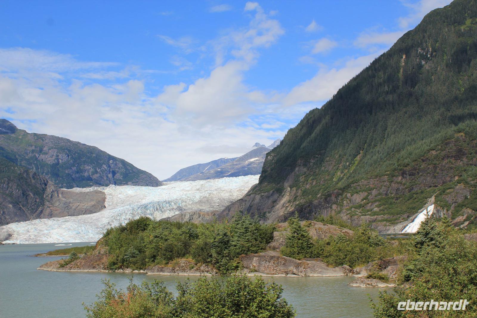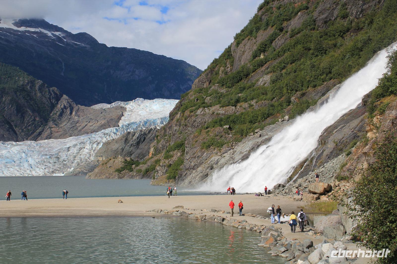 Weiter geht es zum 3. Programmpunkt des Tages: dem Mendenhall-Gletscher. Hier sollten wir zwar diesmal nicht auf, aber dafür richtig nah ran kommen an den gewaltigen Fluss aus Eis! Das gigantische 4.000 km2 große Juneau-Eisfeld speist insgesamt 38 große und über 100 kleine Gletscher. Der beeindruckende, ca. 20 km lange und 2,4 k m breite, Mendelhall-Gletscher liegt herrlich am gleichnamigen See und bei einem Spaziergang zum „Nachbarn" des Gletschers, dem Nugget Wasserfall, bieten sich uns herrliche Fotomotive! Das milde Meeresklima und die Küstenberge Alaskas wirken sich sehr positiv auf die hiesige Vergletscherung aus, so dass sich die Gletscher hier wesentlich langsamer zurückziehen als zum Beispiel in Europa.