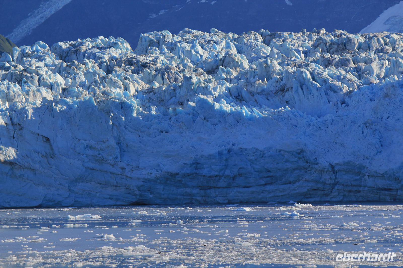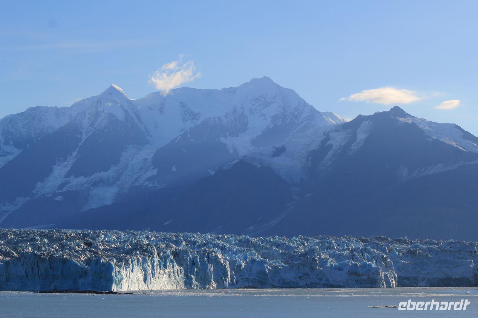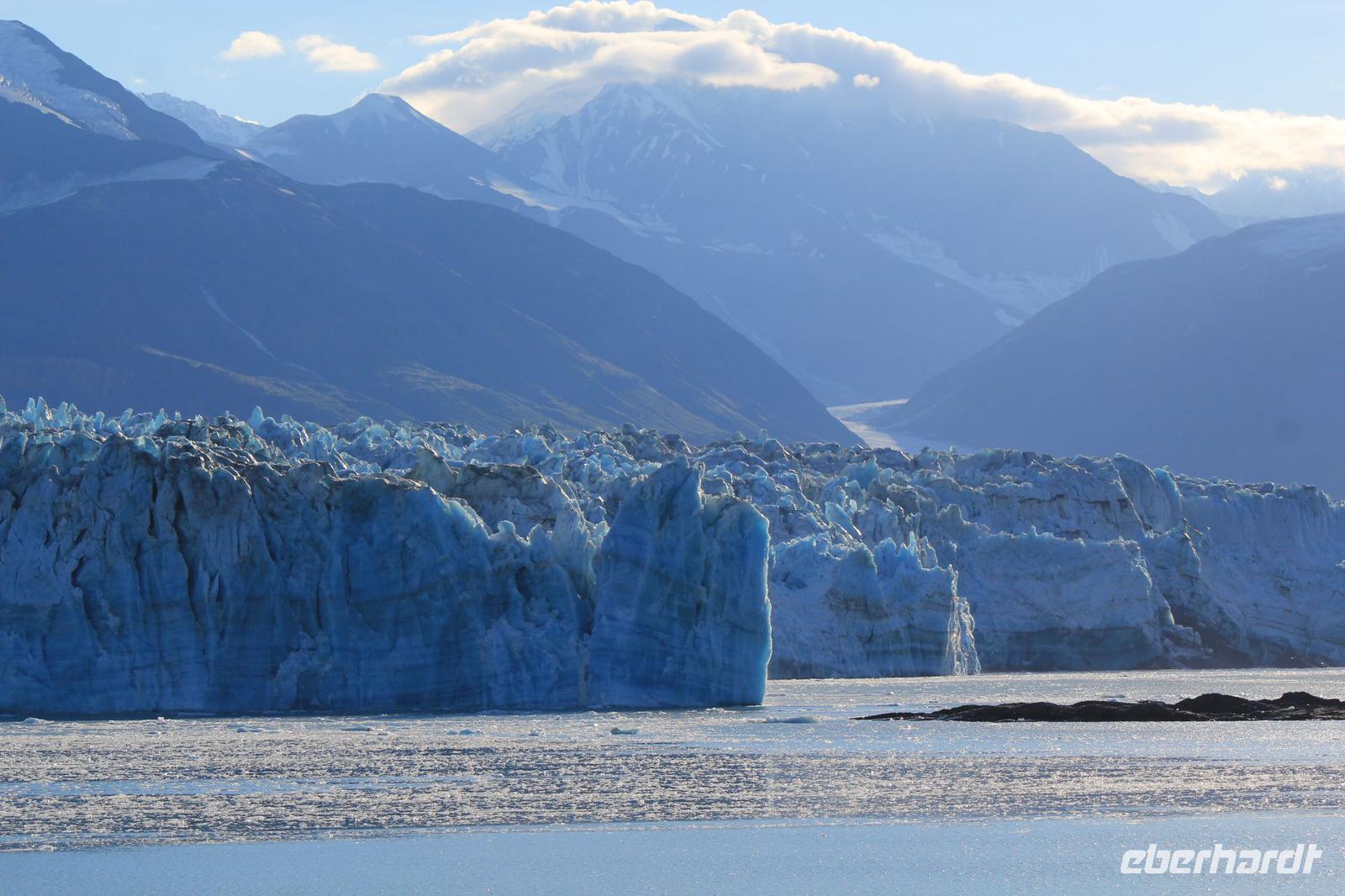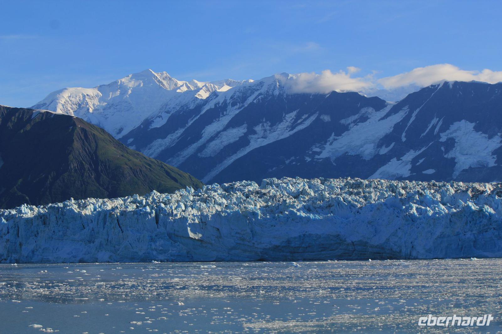 Unser heutiger Tag auf See beginnt mit einem wahren Schauspiel der Natur: Vorhang auf für den Hubbard-Gletscher! Ab 7 Uhr stehen scheinbar alle 2.000 Passagiere gleichzeig auf Deck, um ja nichts zu verpassen! Das Schiff gleitet langsam durch den gewaltigen Fjord, der mit seinen schneebedeckten Bergen bereits ein Augenschmaus für sich ist, und die Plätze an der Reling werden immer rarer. Unsere unerwartet wendige „Radiance oft he Seas" manövriert sich nun bis auf weniger als 200 Meter an die gewaltigen Eismassen heran, die sich langsam und mit gewaltiger Kraft vom Yukon Territorium dem Russell Fjord entgegenschleppen. Mit 10 km Breite und 122 km Länge ist der am nördlichen Ende der Yakutat Bay gelegene Hubbard-Gletscher Alaskas längster Strom aus Eis! Ein kühler Wind weht uns um die Ohren, aber das hält uns keineswegs davon ab dieses Szenario so lange wie möglich zu beobachten. Die Sonne setzt die Eismassen erst so richtig in Szene und lässt den Gletscher in einem wunderschönen Blau glitzern! Unter lautem Getöse kalbt der Gletscher immer wieder und lässt riesige Eisbrocken knarzend ins Meer stürzen. Diese schickt er nun als türkisblau schillernde Eisblöcke aufs offene Meer hinaus. Kapitän Goran lässt unser Schiff mehrmals um die eigene Achse drehen, so dass sich einem jeden die besten Ausblicke bieten.
