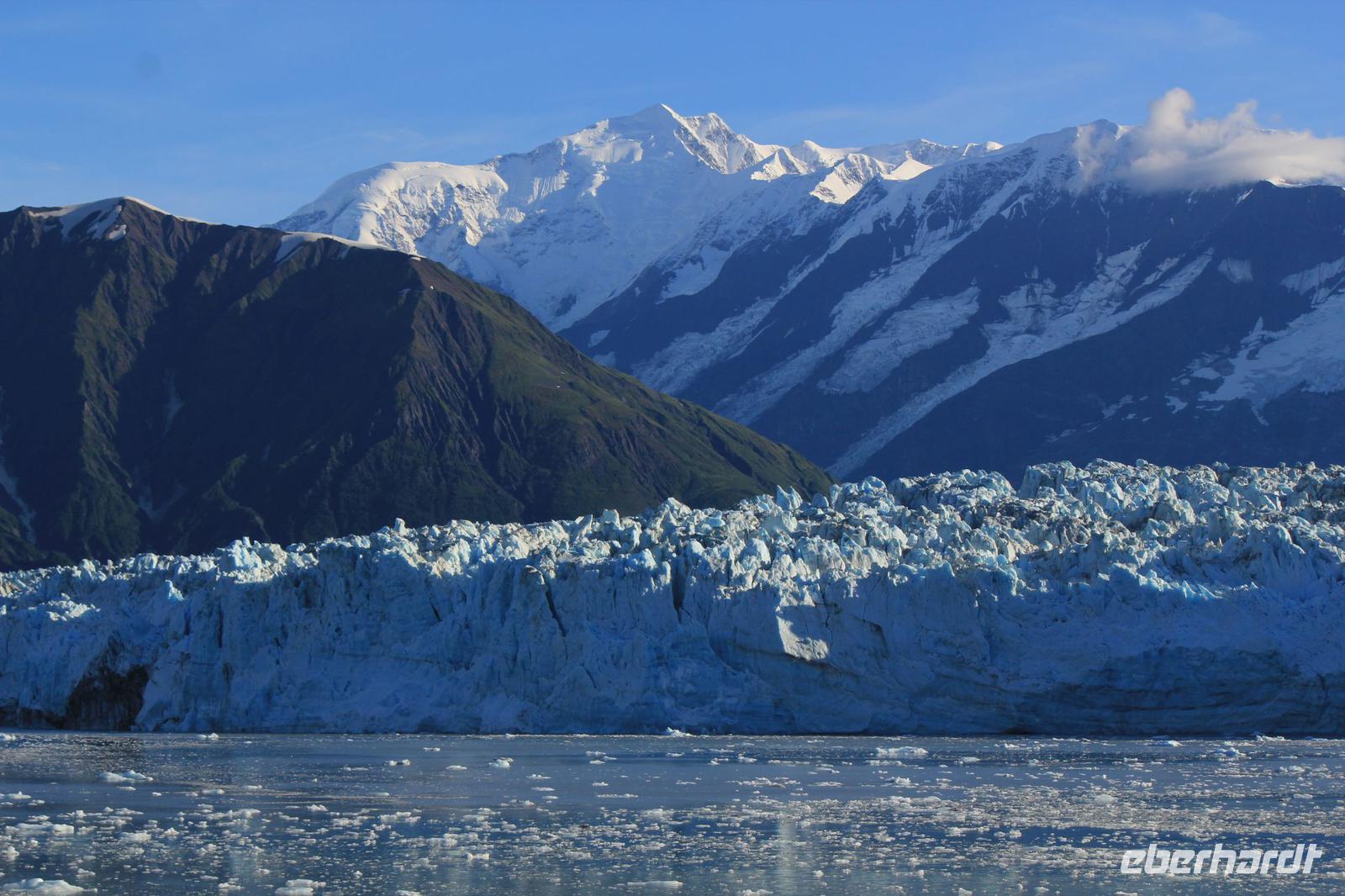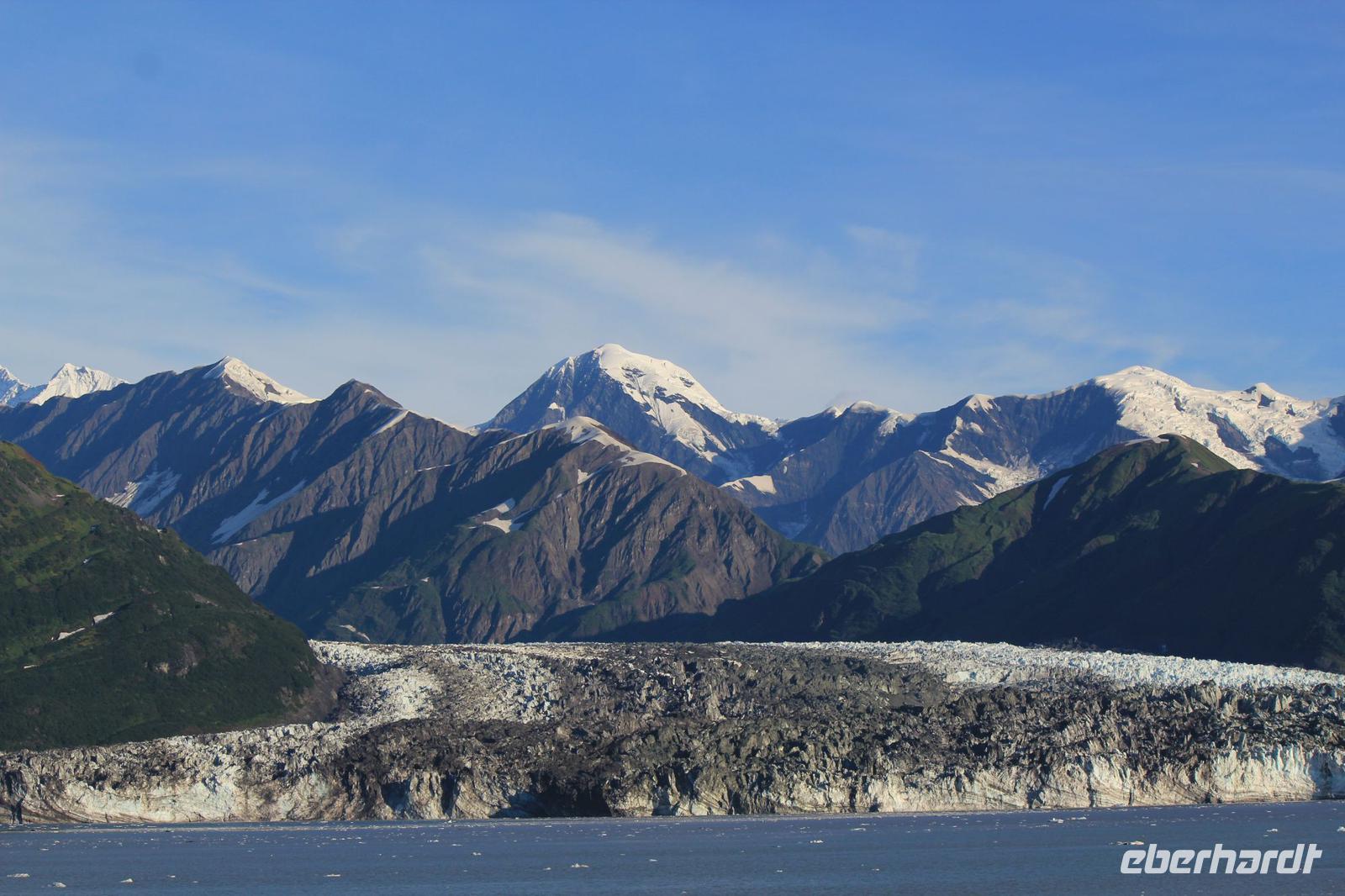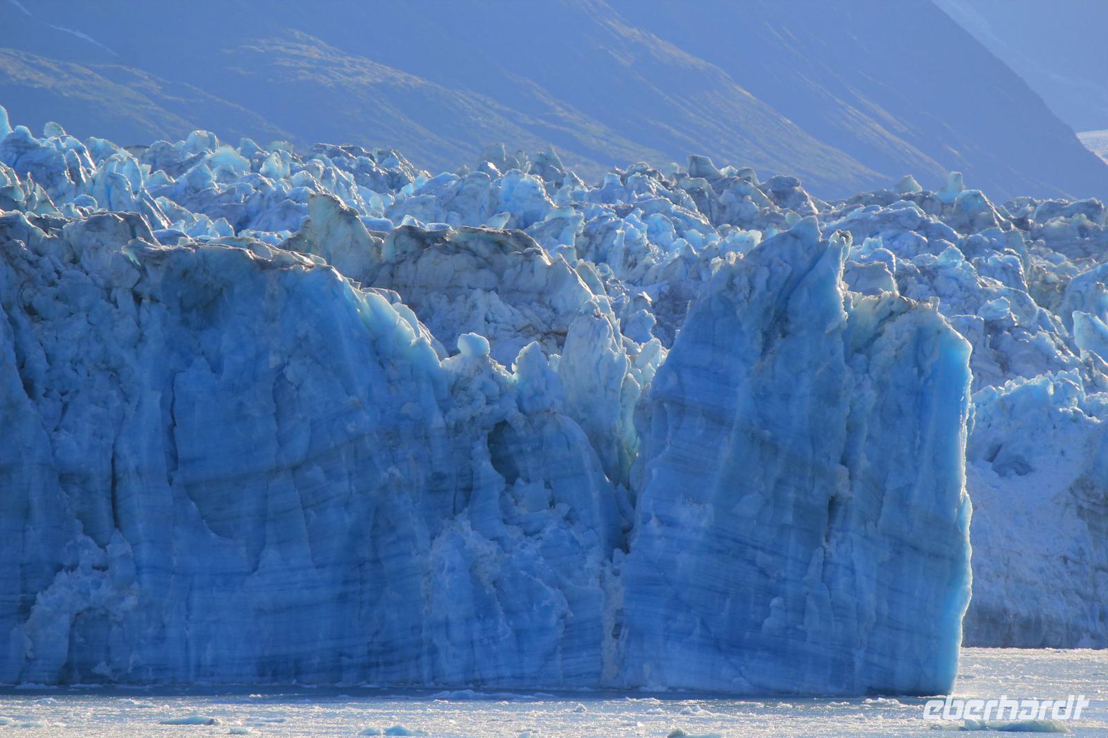 Unser heutiger Tag auf See beginnt mit einem wahren Schauspiel der Natur: Vorhang auf für den Hubbard-Gletscher! Ab 7 Uhr stehen scheinbar alle 2.000 Passagiere gleichzeig auf Deck, um ja nichts zu verpassen! Das Schiff gleitet langsam durch den gewaltigen Fjord, der mit seinen schneebedeckten Bergen bereits ein Augenschmaus für sich ist, und die Plätze an der Reling werden immer rarer. Unsere unerwartet wendige „Radiance oft he Seas" manövriert sich nun bis auf weniger als 200 Meter an die gewaltigen Eismassen heran, die sich langsam und mit gewaltiger Kraft vom Yukon Territorium dem Russell Fjord entgegenschleppen. Mit 10 km Breite und 122 km Länge ist der am nördlichen Ende der Yakutat Bay gelegene Hubbard-Gletscher Alaskas längster Strom aus Eis! Ein kühler Wind weht uns um die Ohren, aber das hält uns keineswegs davon ab dieses Szenario so lange wie möglich zu beobachten. Die Sonne setzt die Eismassen erst so richtig in Szene und lässt den Gletscher in einem wunderschönen Blau glitzern! Unter lautem Getöse kalbt der Gletscher immer wieder und lässt riesige Eisbrocken knarzend ins Meer stürzen. Diese schickt er nun als türkisblau schillernde Eisblöcke aufs offene Meer hinaus. Kapitän Goran lässt unser Schiff mehrmals um die eigene Achse drehen, so dass sich einem jeden die besten Ausblicke bieten.