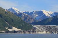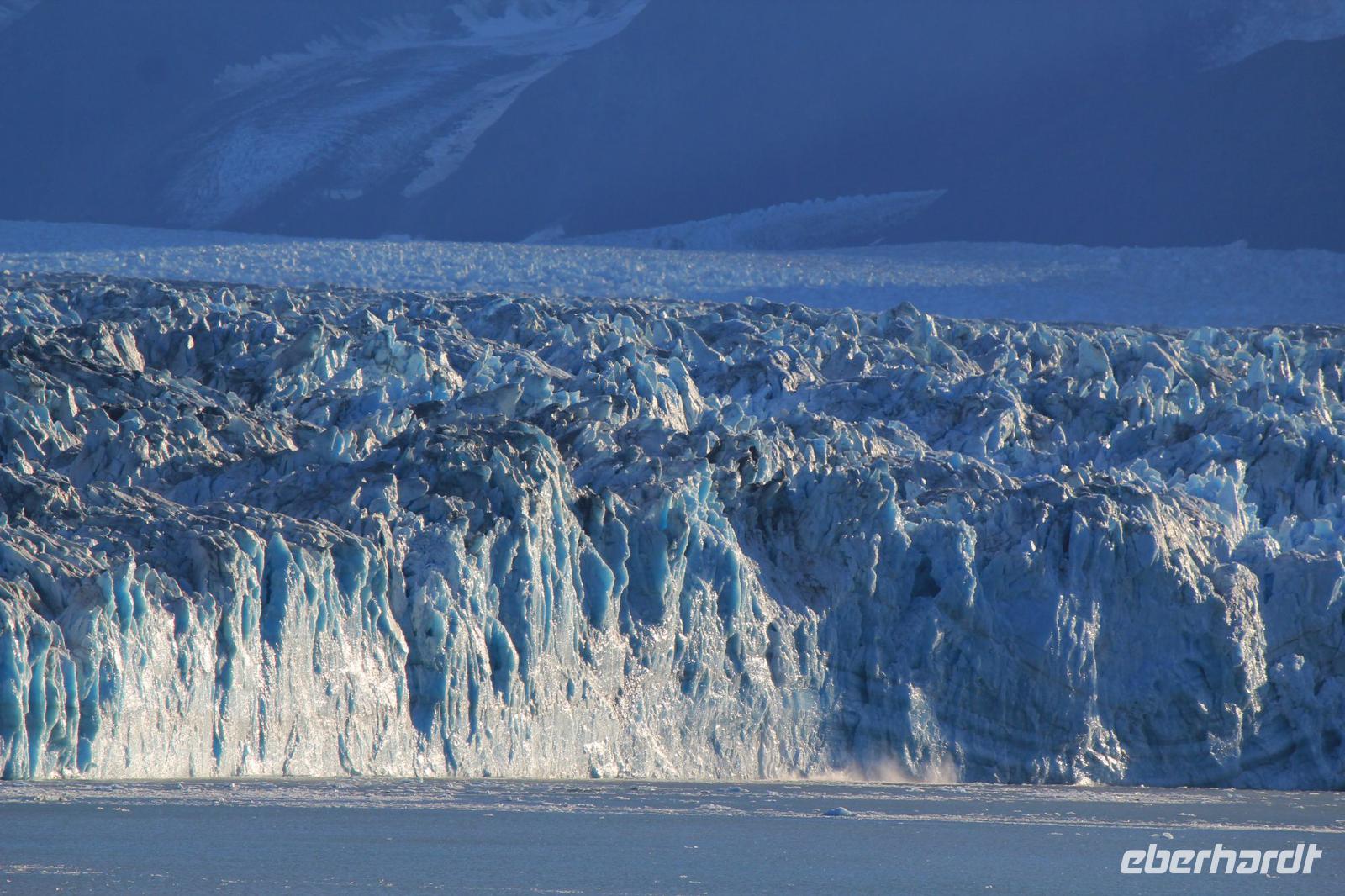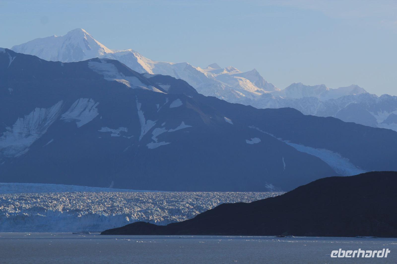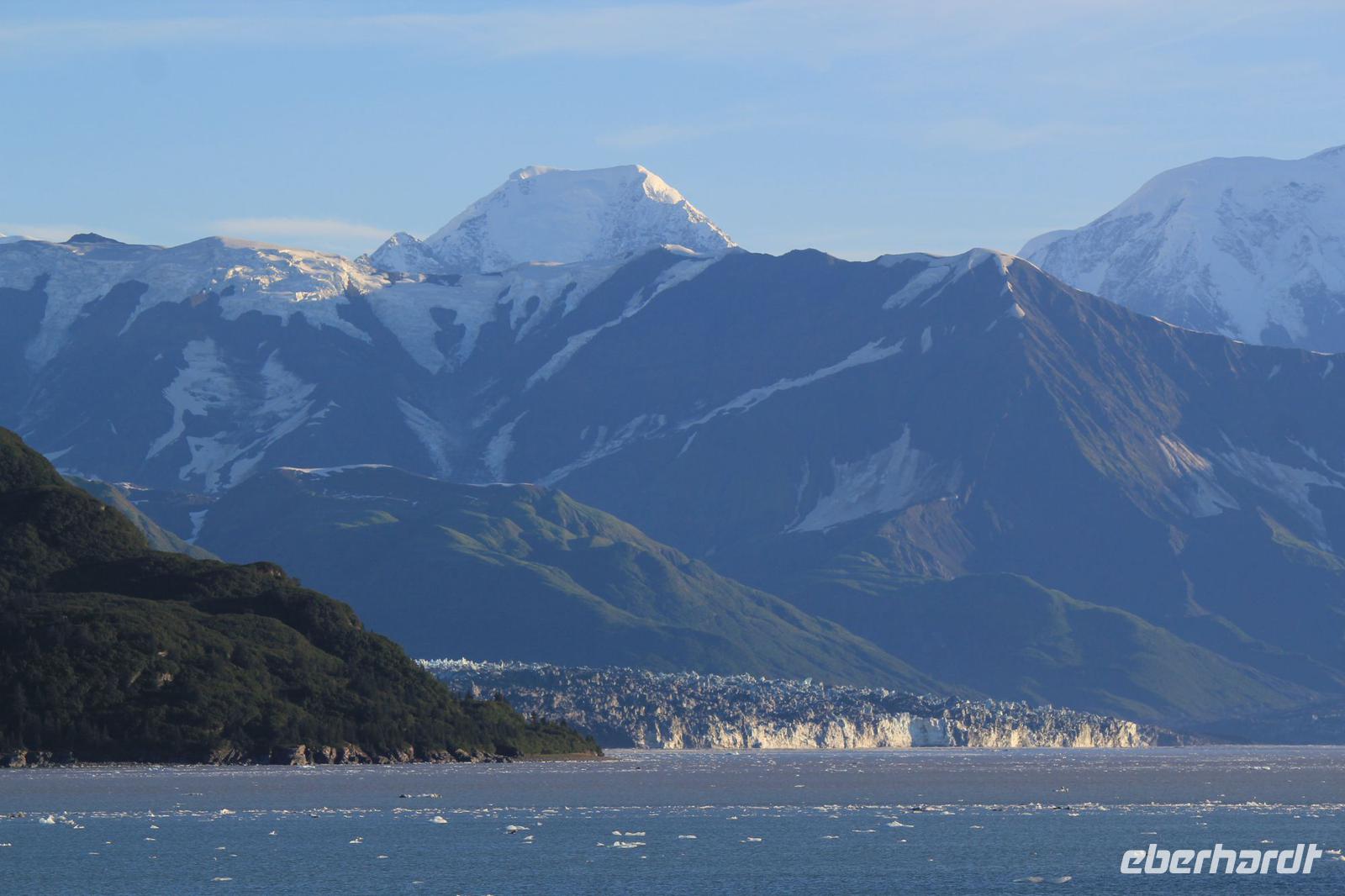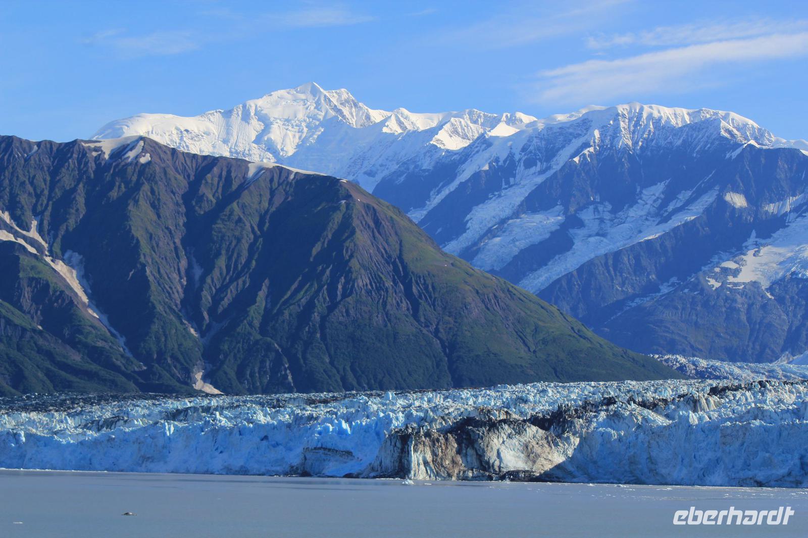 Unser heutiger Tag auf See beginnt mit einem wahren Schauspiel der Natur: Vorhang auf für den Hubbard-Gletscher! Ab 7 Uhr stehen scheinbar alle 2.000 Passagiere gleichzeig auf Deck, um ja nichts zu verpassen! Das Schiff gleitet langsam durch den gewaltigen Fjord, der mit seinen schneebedeckten Bergen bereits ein Augenschmaus für sich ist, und die Plätze an der Reling werden immer rarer. Unsere unerwartet wendige „Radiance oft he Seas" manövriert sich nun bis auf weniger als 200 Meter an die gewaltigen Eismassen heran, die sich langsam und mit gewaltiger Kraft vom Yukon Territorium dem Russell Fjord entgegenschleppen. Mit 10 km Breite und 122 km Länge ist der am nördlichen Ende der Yakutat Bay gelegene Hubbard-Gletscher Alaskas längster Strom aus Eis! Ein kühler Wind weht uns um die Ohren, aber das hält uns keineswegs davon ab dieses Szenario so lange wie möglich zu beobachten. Die Sonne setzt die Eismassen erst so richtig in Szene und lässt den Gletscher in einem wunderschönen Blau glitzern! Unter lautem Getöse kalbt der Gletscher immer wieder und lässt riesige Eisbrocken knarzend ins Meer stürzen. Diese schickt er nun als türkisblau schillernde Eisblöcke aufs offene Meer hinaus. Kapitän Goran lässt unser Schiff mehrmals um die eigene Achse drehen, so dass sich einem jeden die besten Ausblicke bieten.