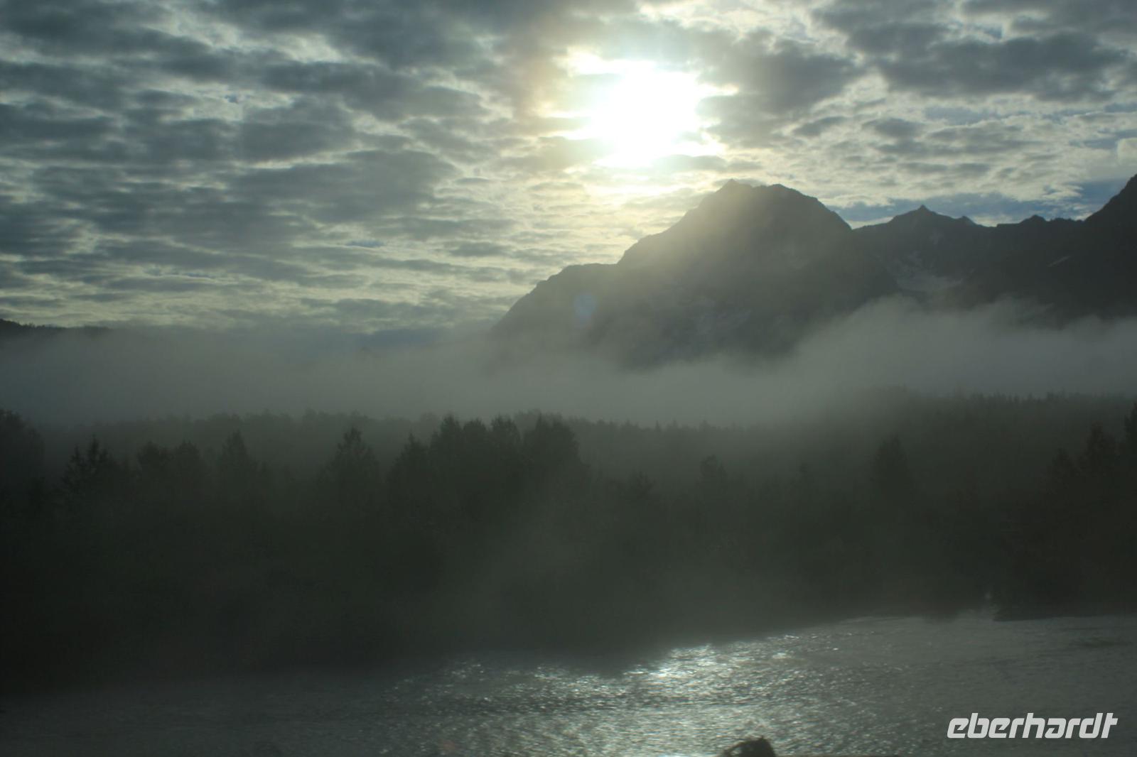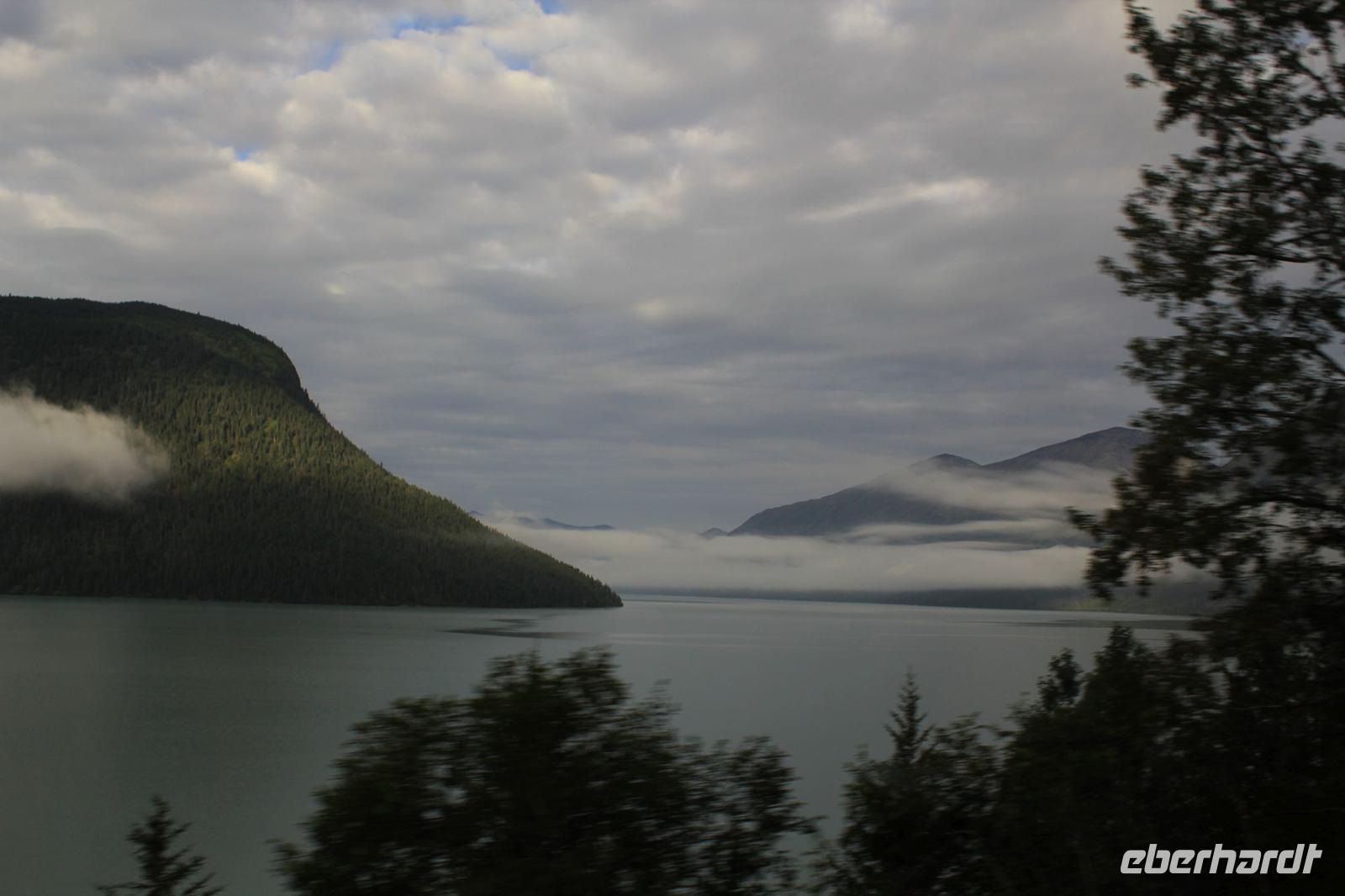Mit der historischen „White Pass & Yukon Eisenbahn", einer der wenigen noch erhaltenen Schmalspurbahnen Amerikas, wollen wir die einstige Goldgräberroute kennenlernen. Bereits um 8:30 Uhr verlassen wir den Bahnhof und der Zug kriecht langsam zum 873 m hoch gelegenen White Pass hinauf, während wir das herrliche Bergpanorama, bestehend aus gewaltigen Schluchten, Bergen und Wasserfällen genießen - zumindest vor unserem geistigen Auge, denn leider zeigt sich der Himmel heute eher von seiner mystischen Seite und verhängt die grandiosen Ausblicke mit seinen Wolken.