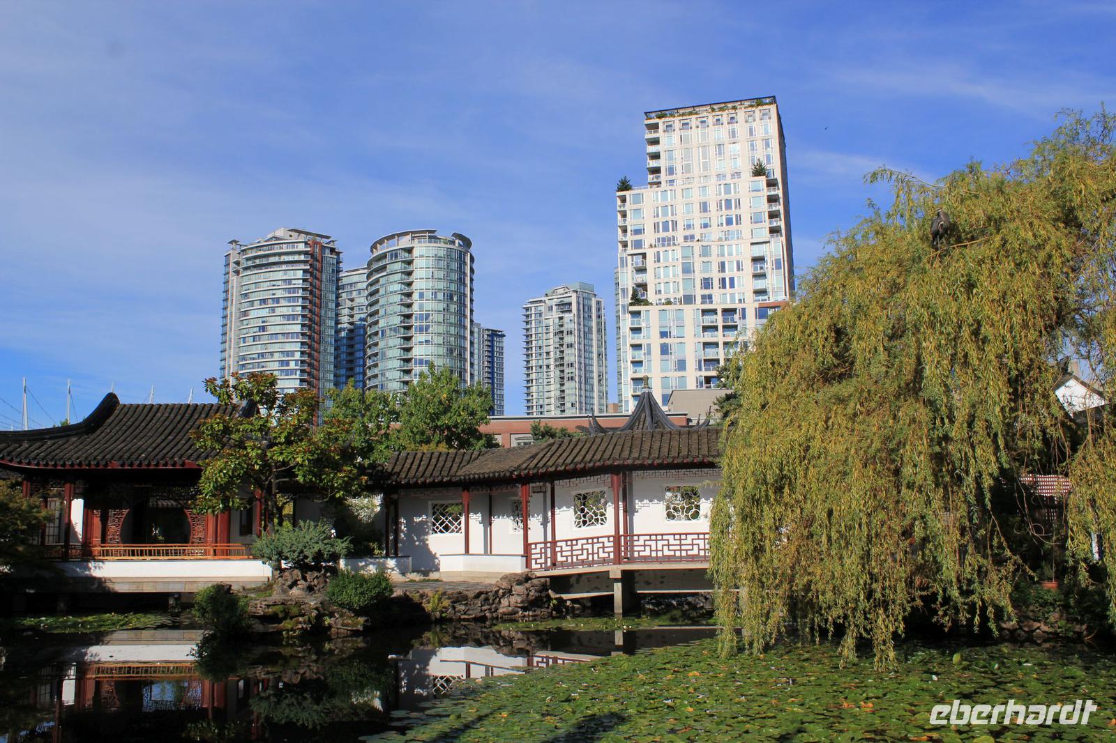 Das perfekte Wetter für eine Stadtrundfahrt erwartet uns heute Morgen! Mit dem Bus geht es zuerst in Richtung Chinatown, bei welchem es sich um eines der größten der Welt handelt. Fast die Hälfte der Bevölkerung in Vancouver ist asiatischer Abstammung und verleiht der Metropole ihr Multi-Kulti-Flair. Durch das Chinatown Gate hindurch gefahren, empfangen uns zahlreiche chinesische Bauelemente, rotgestrichene Häuserfronten sowie ein klassischer chinesischer Garten, den wir uns auch von innen anschauen. Der Dr. Sun Yat Sen Garten schließt sich an das chinesische Kulturzentrum an. Hier trifft asiatische Historie auf westliche Moderne. Die glitzernden Hochhausfassaden türmen über den kleinen Pavillons und dem mit Seerosen und Bambus gezierten Teich.