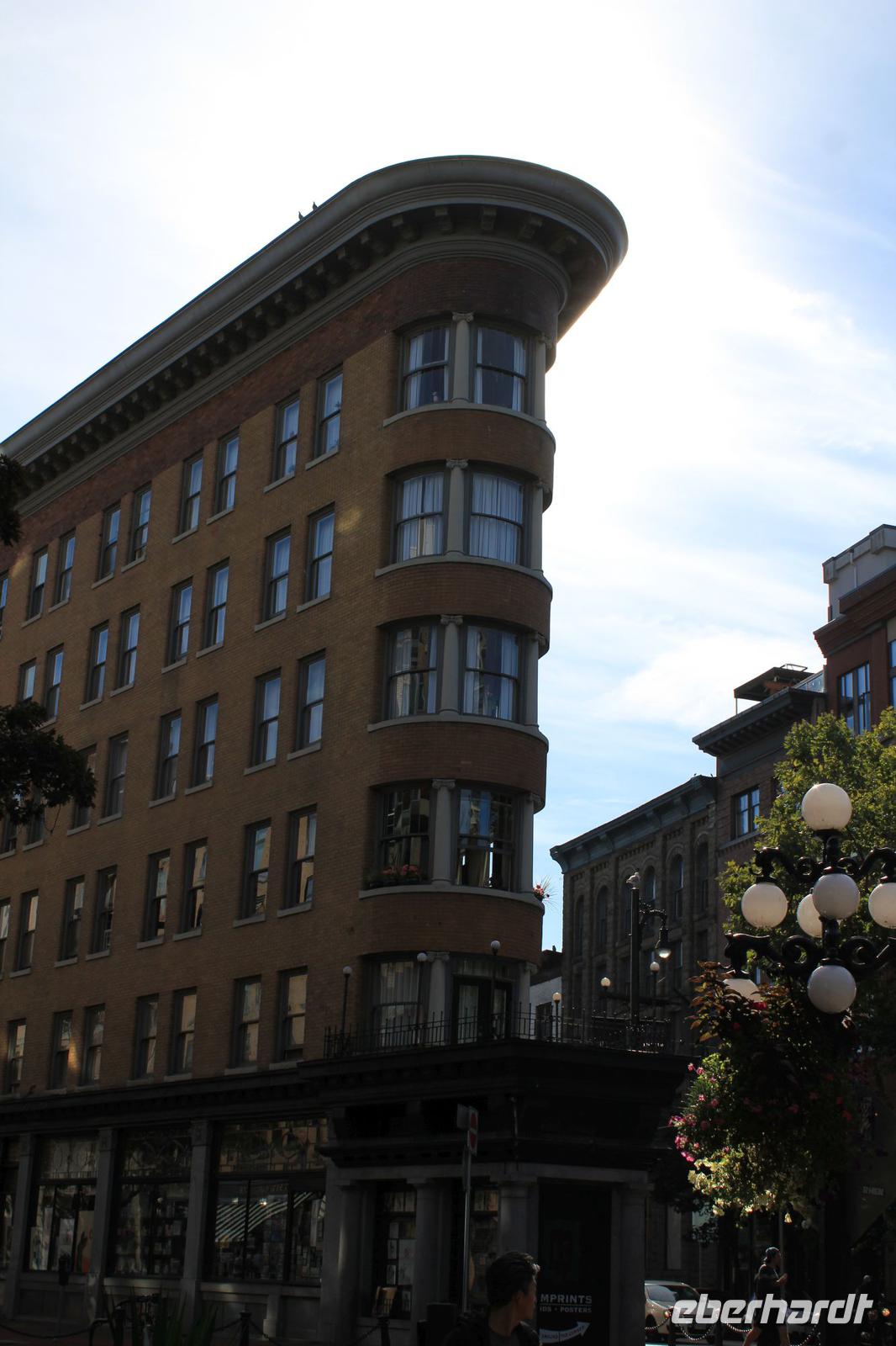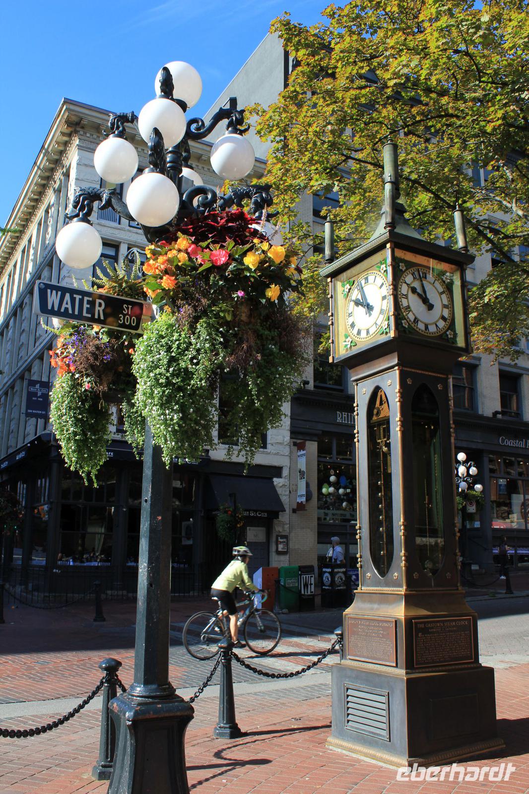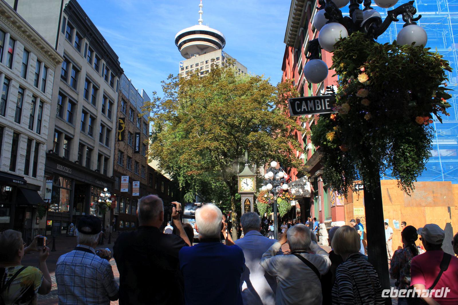 Unser nächste Ziel ist das älteste Viertel der jungen Stadt: Gastown. Auf einem Whiskeyfass thront am Anfang der Water Street Mr. „Gassy Jack" in Form einer gusseisernen Statue. Er eröffnete 1867 eine Whiskeybar für die durstigen Arbeiter des Sägemühlenwerkes und so wurde der Beginn einer Stadtgeschichte geschaffen: mit einem Sägemühlenwerk und einer WhiskeybarJ. Liebevoll restaurierte Gebäude aus viktorianischer Zeit beherbergen heute niedliche Restaurants, Cafés und Geschäfte. Alte Gaslaternen, Kopfsteinpflaster und bunte Blumenkübel prägen das Bild des Viertels weiterhin. Wir schlendern gemeinsam zur namenhaften Steam Clock. Die in den 1870-er Jahren erbaute Dampfuhr spielt jede volle Stunde, Dampf ausblasend, ein Lied, zur Belustigung der Touristen -also warten auch wir bis es 10 Uhr schlägt.