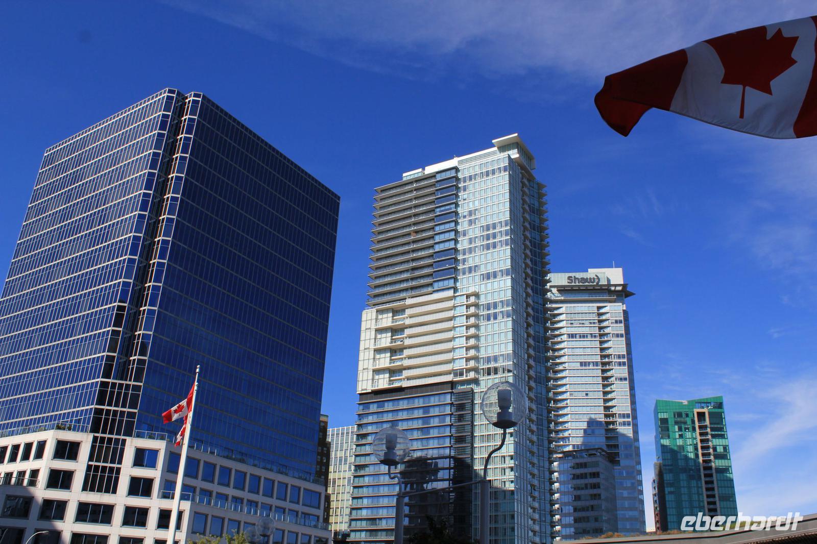 Zur Mittagszeit versorgen wir uns in einem großen Supermarkt und machen kurzerhand ein Buspicknick! Denn kurz darauf wollen wir bei einem letzten Fotostopp am Cook Inlet einen wunderschönen Blick auf die Skylines von Anchorage werfen. Auf den letzten Metern zum Flughafen wird dann unser Puls plötzlich noch einmal in die Höhe getrieben: direkt am Straßenrand steht tatsächlich eine ausgewachsene Elchkuh mit ihren 2 Jungen! Friedlich grasend lassen sich die 3 weder von den Autos noch von uns, beinah hyperventilierenden Touristen, stören. Wir können unser Glück kaum fassen! Jetzt können wir gutgestimmt in unser Flugzeug steigen und mit Air Canada über den Pazifik nach Vancouver fliegen. Herzlich Willkommen in der „lebenswertesten Stadt der Welt!". Die Perle am Pazifik soll Ziel unserer letzten Erkundungen in Kanada sein und wir sind sehr gespannt darauf was uns hier erwartet! Herrlich liegt das Stadtzentrum der 2,3 Millionen Metropole auf einer Halbinsel und im Hintergrund bilden die schneebedeckten Ketten der Küstenberge eine imposante Kulisse. Reiseleiter Peter begrüßt uns und begleitet vom Sonnenuntergang fahren wir nach einem langen Tag zu unserem Hotel direkt am False Creek.
