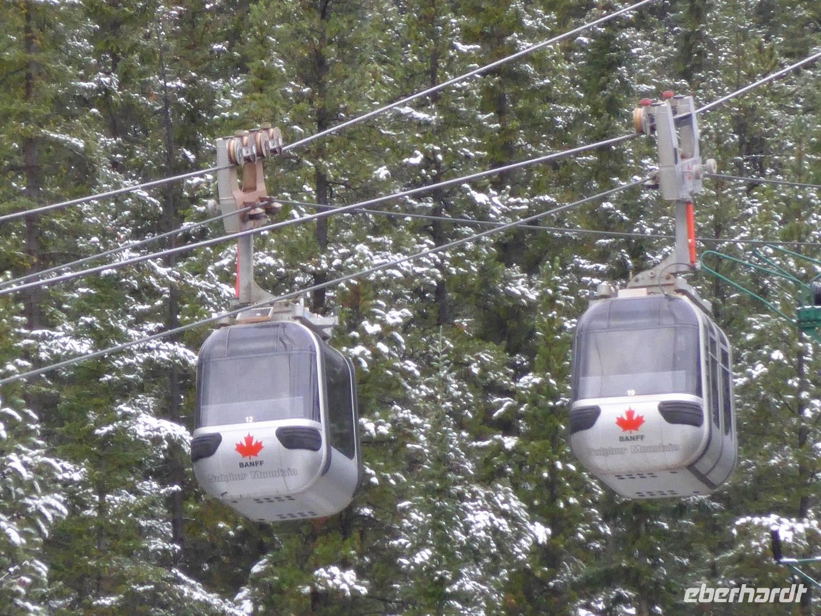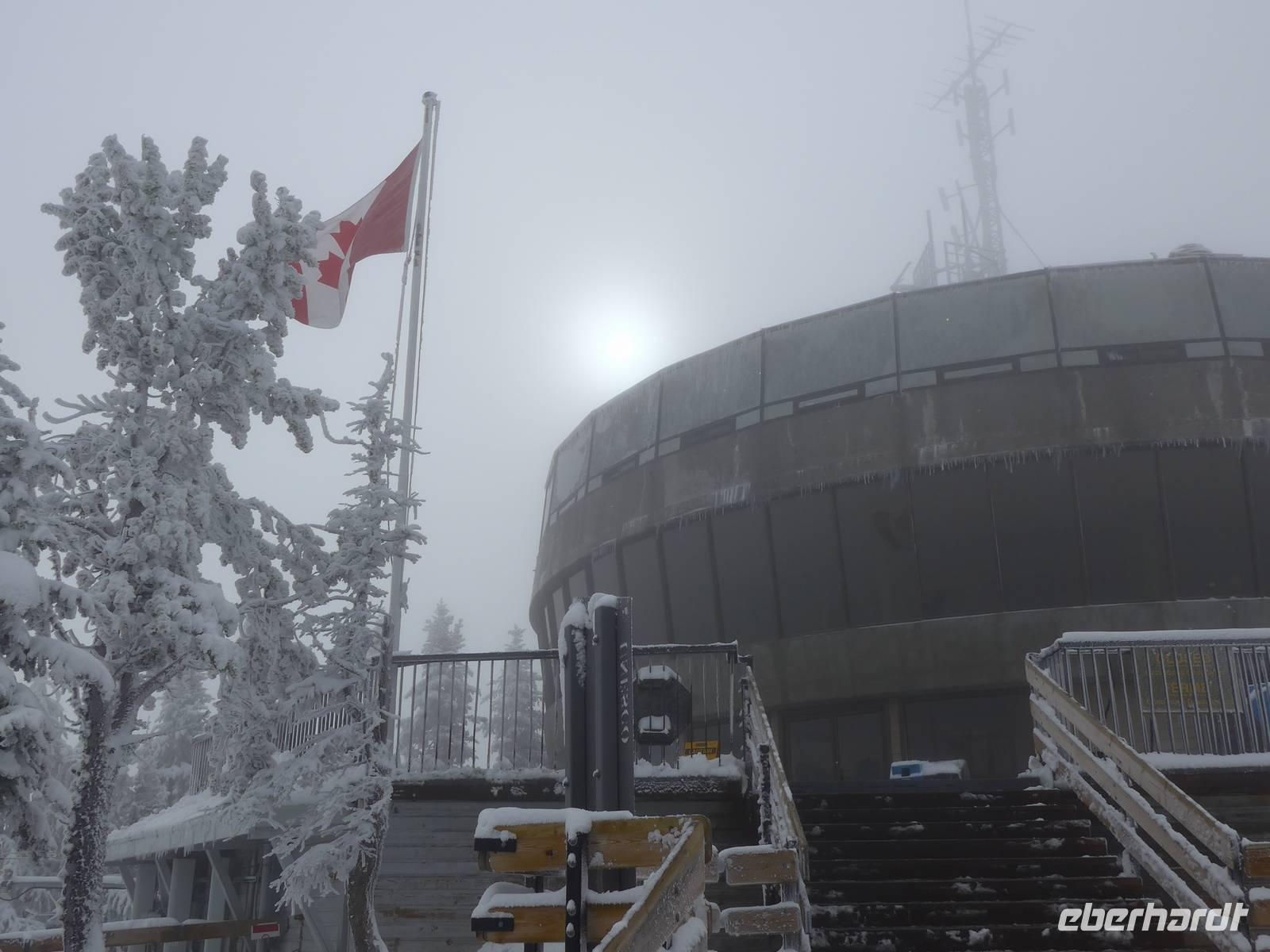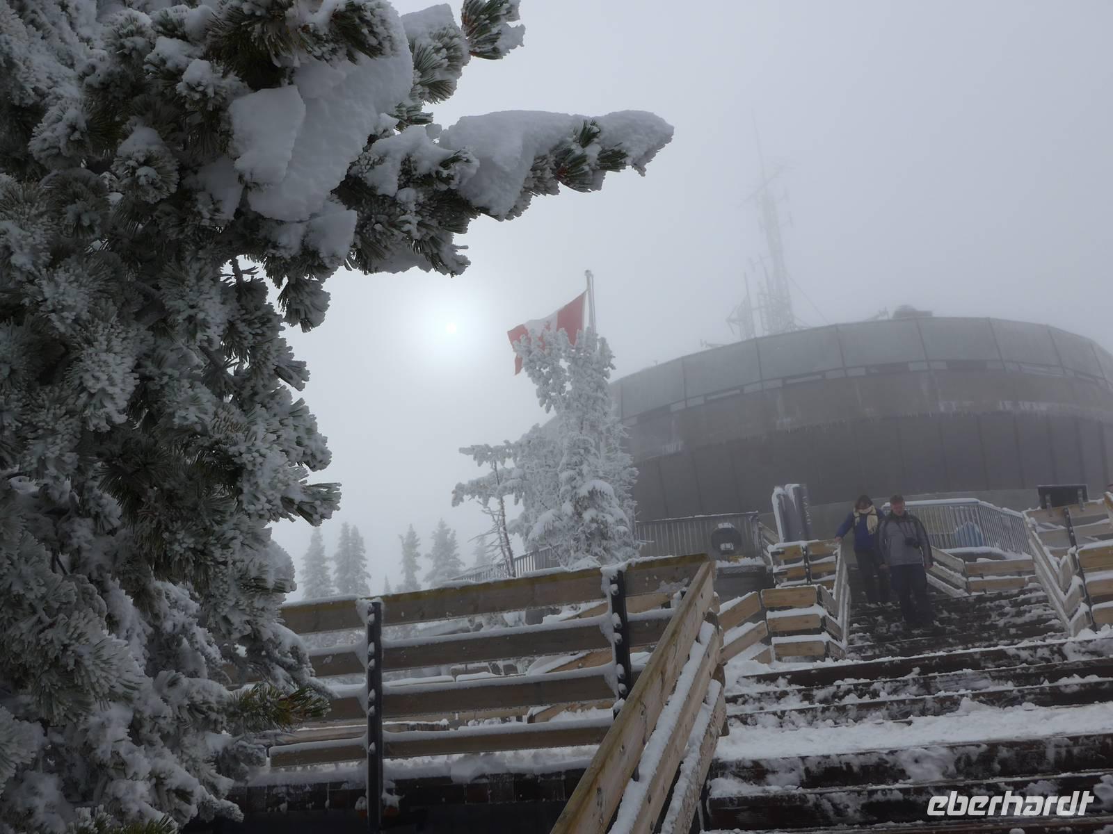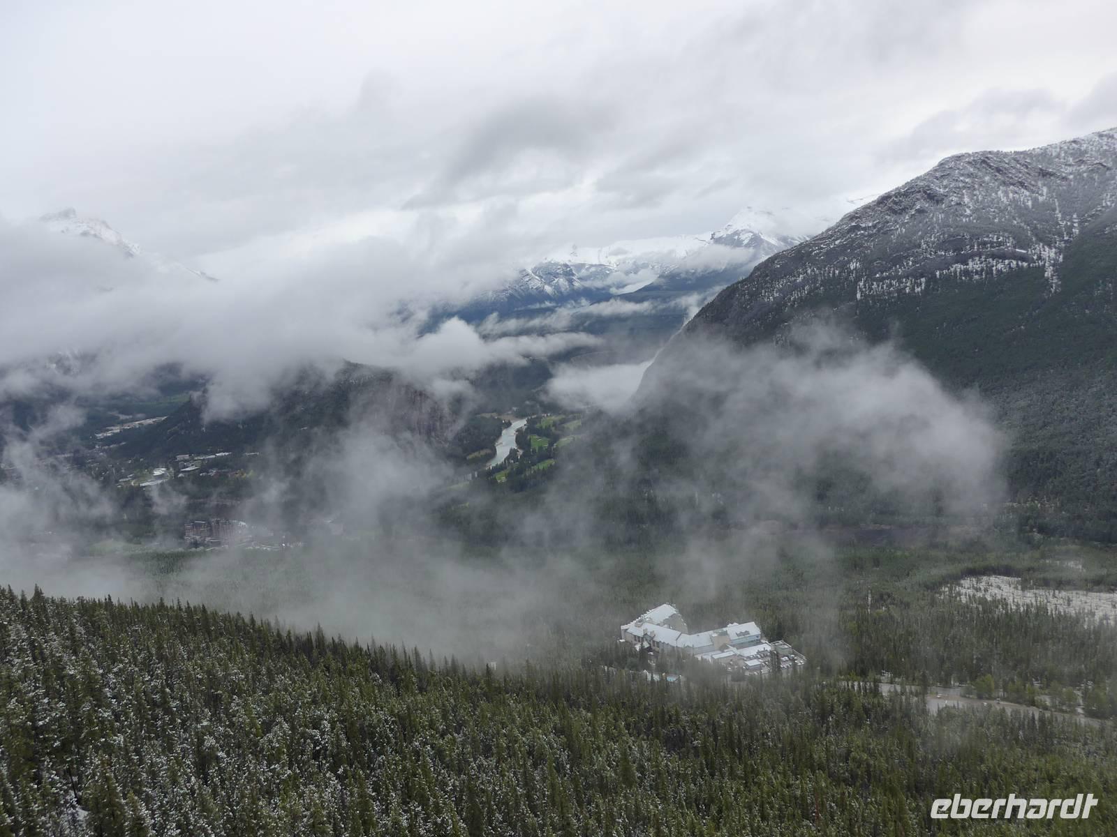 Aufwachen mit Überraschung - wenig ist von den Bergen zu sehen, doch das was man sah hüllte sich in ein Weiß wie Puderzucker. Heute einmal eine besondere Form des Frühstückens. Mit leeren Magen ging es mit der Gondel hinauf zum Sulphur Mountain. In 2270 Meter Höhe liegt die Bergstation.