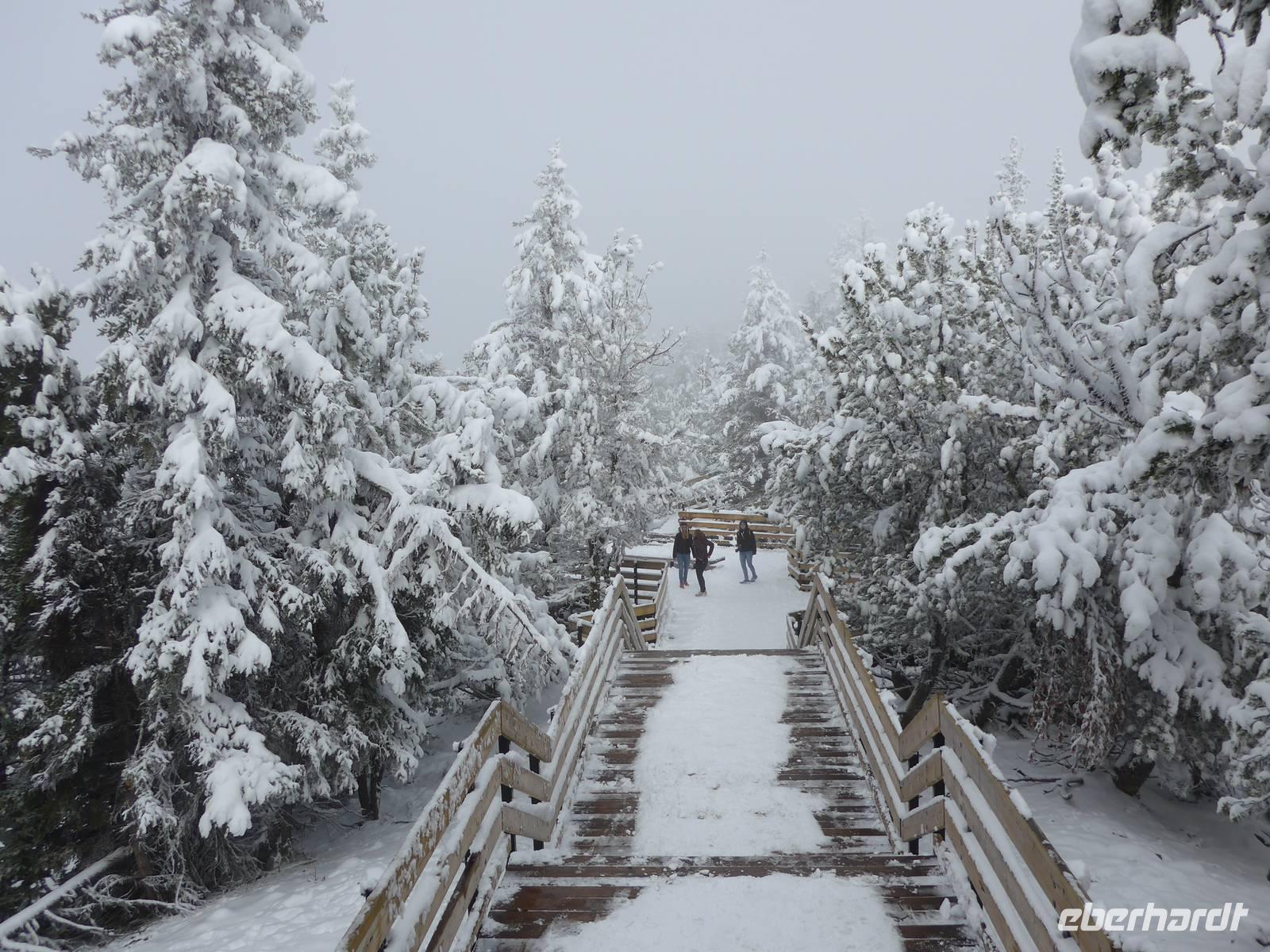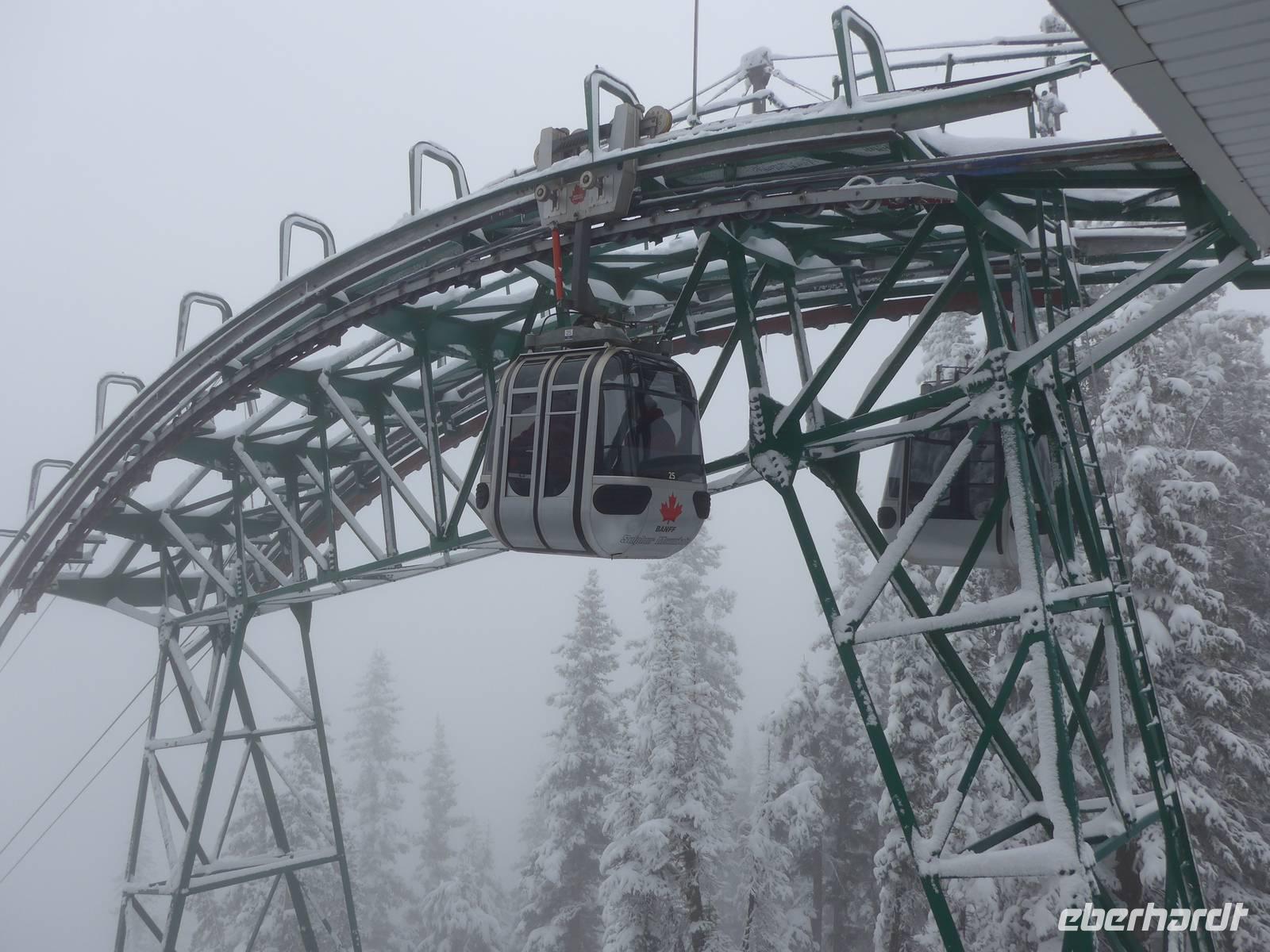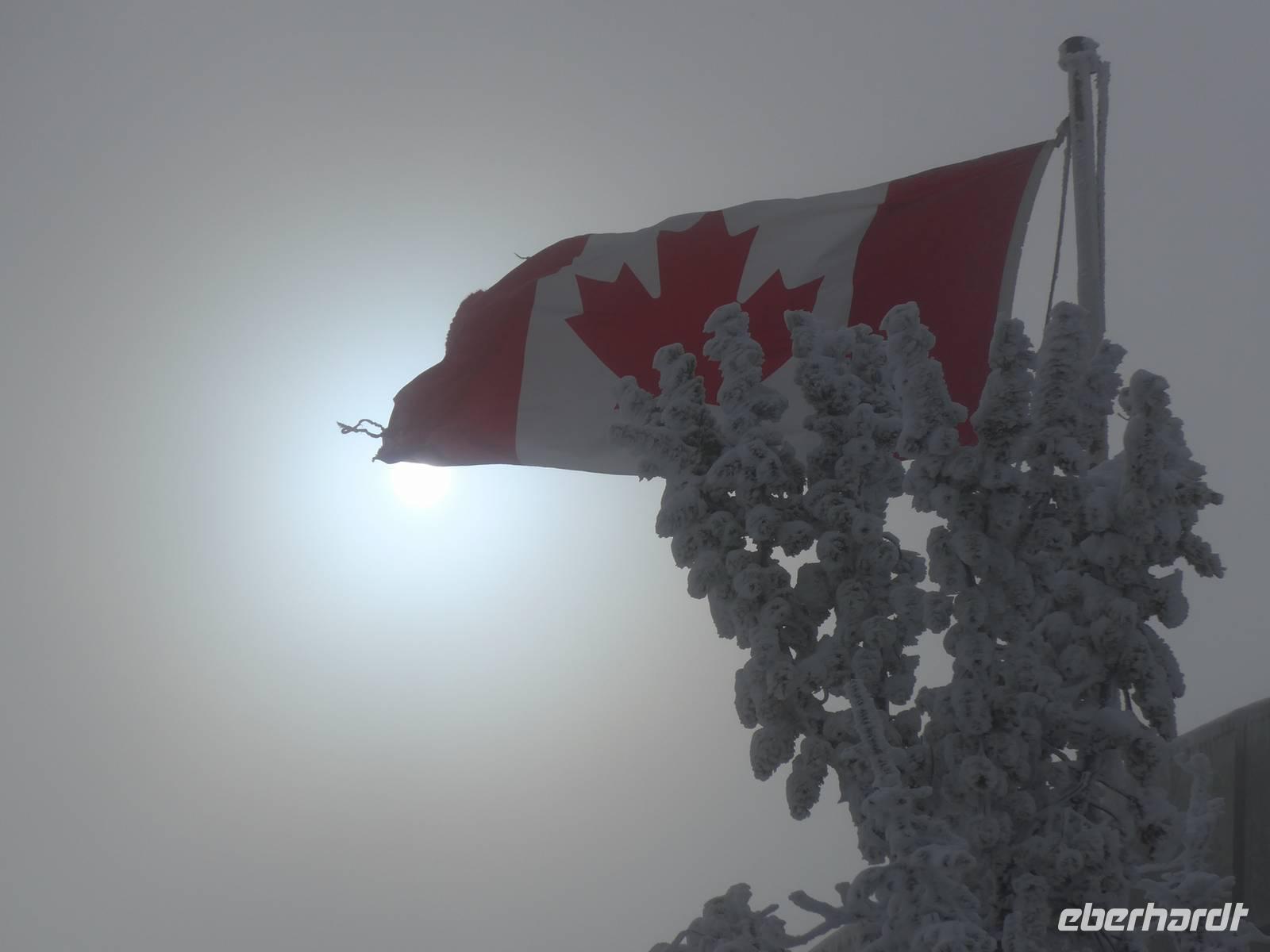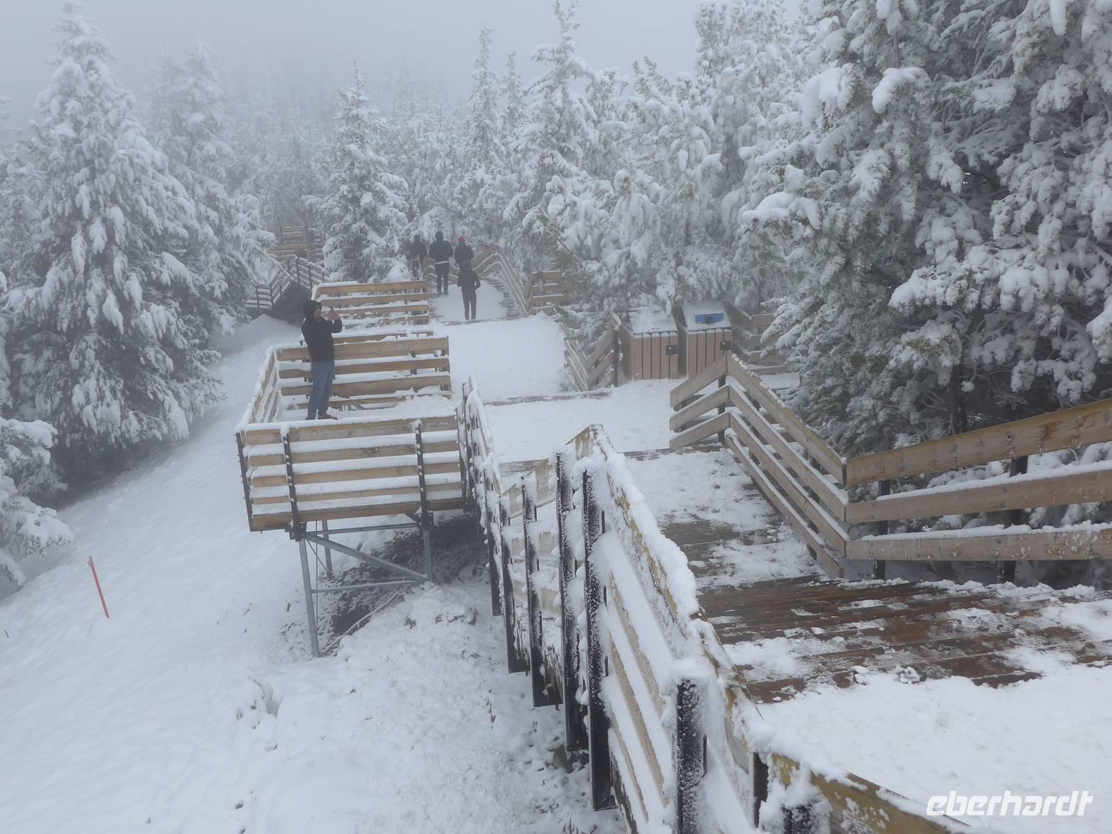 Aufwachen mit Überraschung - wenig ist von den Bergen zu sehen, doch das was man sah hüllte sich in ein Weiß wie Puderzucker. Heute einmal eine besondere Form des Frühstückens. Mit leeren Magen ging es mit der Gondel hinauf zum Sulphur Mountain. In 2270 Meter Höhe liegt die Bergstation.