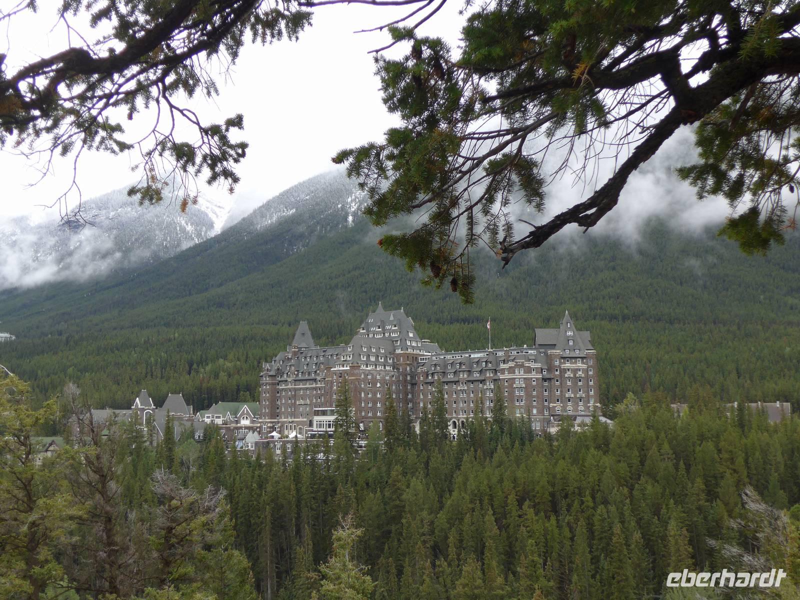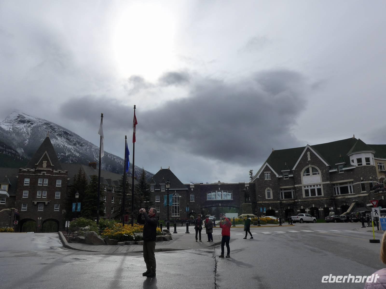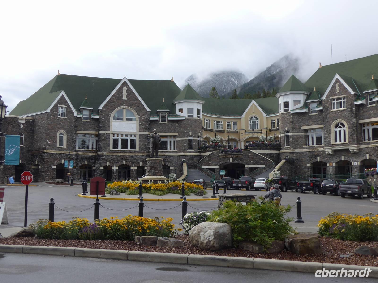 Nach einer erholsamen Nacht kann nun das Abenteuer Kanada beginnen. Nach heißen Sommer u. Waldbränden ist der Regen vielleicht für die Einheimischen eine willkommene Abwechslung - nicht für uns, aber wir lassen uns die Stimmung nicht vermiesen. Unser Motto: „Nicht das Wetter ist schlecht, sondern nur die Ausrüstung und was heute runter kommt, kommt morgen nicht mehr!" Wir begannen den Tag mit einer Stadtrundfahrt durch Calgary. Calgary, die auch als „Ölhauptstadt" Kanadas bezeichnet wird, hat eine ganze Menge zu bieten. Vorbei an der Gründungstätte der Stadt, dem Fort Calgary und so mancher weiteren Sehenswürdigkeit erblickten wird auch das riesige Rodeogelände. Jedes Jahr findet im Juli ein Volksspektakel statt bei dem das Rodeo natürlich im Mittelpunkt steht. Kein Wunder, dass diese Stadt auch die „Stadt der Cowboys" genannt wird und die Rinderzucht neben Erdöl- u. Erdgas eine wichtige Rolle in dieser Provinz spielt. Natürlich durfte ein Besuch des Calgary Towers, der mit seinen mehr als 190 Meter eine fantastischen Blick auf die Stadt ermöglicht, nicht fehlen. Das höchste Gebäude Albertas das „Bow Building" war zum Greifen nahe doch fehlte die Sicht auf die Rocky Mountains in der Ferne. Bei guter Sicht sind sie zum Greifen nahe. Gut das wir die nächsten Tage dort sind - hoffentlich mit besserer Sicht. Aber bevor wir nach Banff aufbrachen, besuchten wir den Olympic-Park mit seiner Sprungschanze u. Bobbahn. Schnell kamen die Erinnerungen an die Olympischen Spiele von 1988. Nachdem wir die Stadtgrenze hinter uns gelassen hatten folgten wir dem endlosen Weg der Prärie. Und plötzlich ohne die Andeutung von Vorgebirgen sollten wir von Berggipfel, von denen viele die 3000 Meter überschritten, umgeben sein. Der Nebel verhinderte dies - nur vereinzelt konnten wir erkennen, dass auf den Gipfeln frischer Schnee lag. Die atemberaubende Bergkette der Rocky Mountains, die vor mehr als 60 Millionen Jahren entstand und durch Eiszeiten geformt und gestaltet wurden sollten nun unseren weiteren Weg bis zum Hotel in Banff begleiten. Leider nur in Gedanken und mit viel Phantasie folgten wir dieser Vorstellung. Wir fuhren geradewegs hinein in den 3. Ältesten Nationalpark der Welt, der mehr als 2 Dutzend Berggipfel über 3000 Meter beherbergt und jedes Jahr von mehr als 4 Millionen Besuchern aufgesucht wird. Herrlich eingebettet im Bow Tal schlägt sich der gleichnamige Fluss durch Bergwiesen u. Nadelwälder. Fotostopp am Bow Wasserfall mit seinem Flusslauf in türkisblaue Farbe. Die senkrecht abfallenden Felswände und die moosbewachsenen Ebenen zierten diese Landschaft und schon der erste Tag verzauberte uns mit seiner Schönheit, die viele nur von Postkarten oder Fernsehberichten kannten. Kurz vor Ankunft im Hotel noch ein Abstecher vorbei am legendären Fairmont Banff Springs Hotel. Im Stil eines schottischen Märchenschlosses erbaut diente es als Herberge des frühen Eisenbahntourismus. Bis zum Abendessen hatte man noch genügend Zeit den Rundgang zur Mittagszeit weiter fortzusetzen.