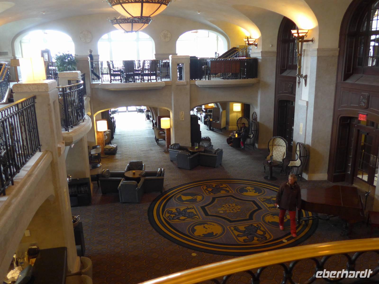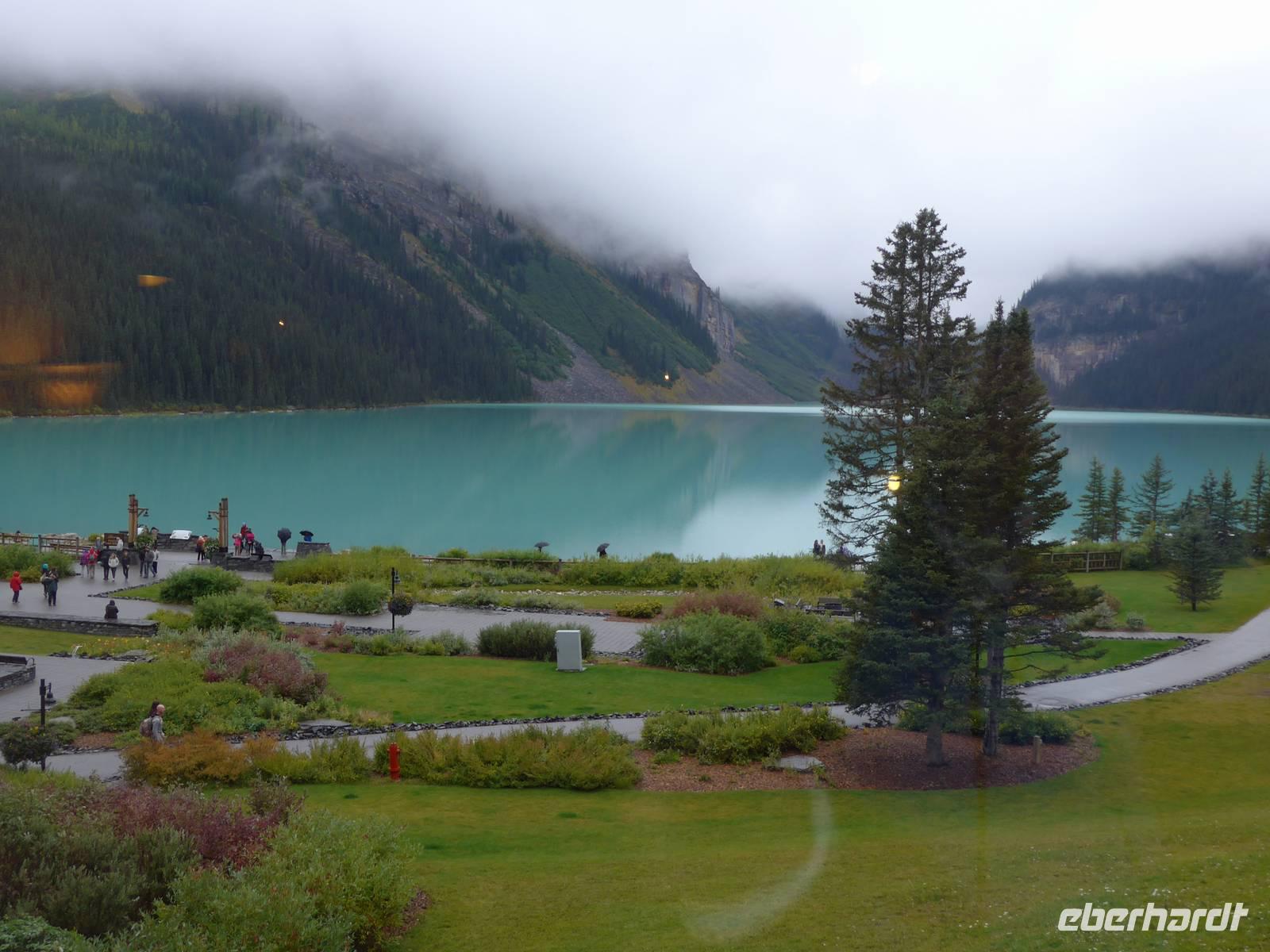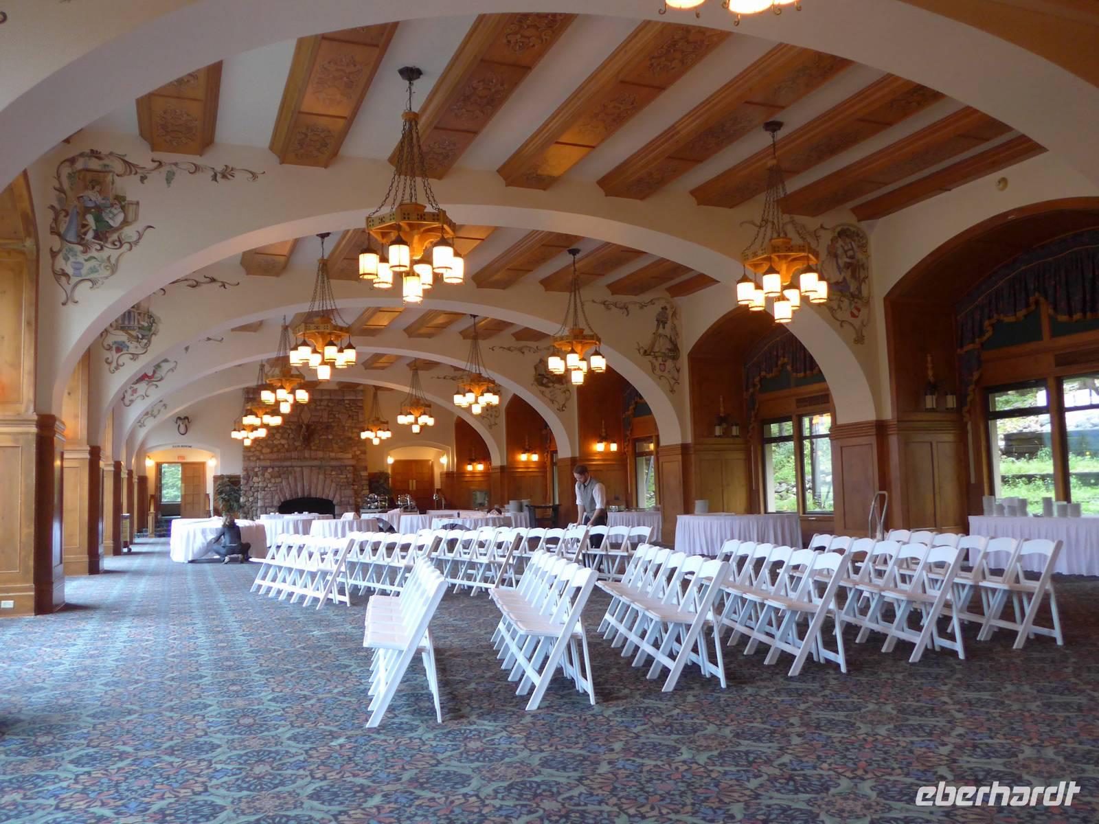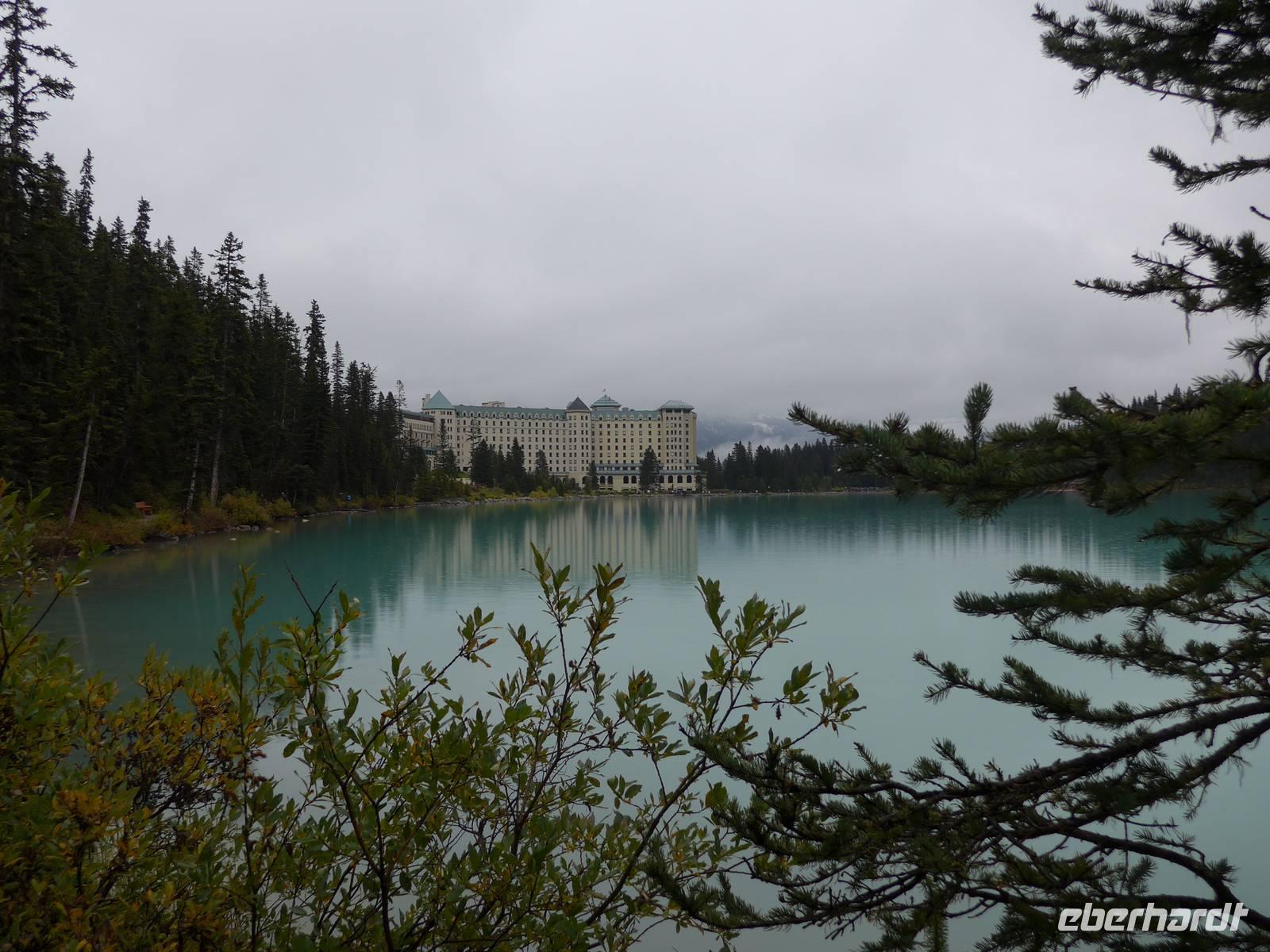 Nach einer erholsamen Nacht kann nun das Abenteuer Kanada beginnen. Nach heißen Sommer u. Waldbränden ist der Regen vielleicht für die Einheimischen eine willkommene Abwechslung - nicht für uns, aber wir lassen uns die Stimmung nicht vermiesen. Unser Motto: „Nicht das Wetter ist schlecht, sondern nur die Ausrüstung und was heute runter kommt, kommt morgen nicht mehr!" Wir begannen den Tag mit einer Stadtrundfahrt durch Calgary. Calgary, die auch als „Ölhauptstadt" Kanadas bezeichnet wird, hat eine ganze Menge zu bieten. Vorbei an der Gründungstätte der Stadt, dem Fort Calgary und so mancher weiteren Sehenswürdigkeit erblickten wird auch das riesige Rodeogelände. Jedes Jahr findet im Juli ein Volksspektakel statt bei dem das Rodeo natürlich im Mittelpunkt steht. Kein Wunder, dass diese Stadt auch die „Stadt der Cowboys" genannt wird und die Rinderzucht neben Erdöl- u. Erdgas eine wichtige Rolle in dieser Provinz spielt. Natürlich durfte ein Besuch des Calgary Towers, der mit seinen mehr als 190 Meter eine fantastischen Blick auf die Stadt ermöglicht, nicht fehlen. Das höchste Gebäude Albertas das „Bow Building" war zum Greifen nahe doch fehlte die Sicht auf die Rocky Mountains in der Ferne. Bei guter Sicht sind sie zum Greifen nahe. Gut das wir die nächsten Tage dort sind - hoffentlich mit besserer Sicht. Aber bevor wir nach Banff aufbrachen, besuchten wir den Olympic-Park mit seiner Sprungschanze u. Bobbahn. Schnell kamen die Erinnerungen an die Olympischen Spiele von 1988. Nachdem wir die Stadtgrenze hinter uns gelassen hatten folgten wir dem endlosen Weg der Prärie. Und plötzlich ohne die Andeutung von Vorgebirgen sollten wir von Berggipfel, von denen viele die 3000 Meter überschritten, umgeben sein. Der Nebel verhinderte dies - nur vereinzelt konnten wir erkennen, dass auf den Gipfeln frischer Schnee lag. Die atemberaubende Bergkette der Rocky Mountains, die vor mehr als 60 Millionen Jahren entstand und durch Eiszeiten geformt und gestaltet wurden sollten nun unseren weiteren Weg bis zum Hotel in Banff begleiten. Leider nur in Gedanken und mit viel Phantasie folgten wir dieser Vorstellung. Wir fuhren geradewegs hinein in den 3. Ältesten Nationalpark der Welt, der mehr als 2 Dutzend Berggipfel über 3000 Meter beherbergt und jedes Jahr von mehr als 4 Millionen Besuchern aufgesucht wird. Herrlich eingebettet im Bow Tal schlägt sich der gleichnamige Fluss durch Bergwiesen u. Nadelwälder. Fotostopp am Bow Wasserfall mit seinem Flusslauf in türkisblaue Farbe. Die senkrecht abfallenden Felswände und die moosbewachsenen Ebenen zierten diese Landschaft und schon der erste Tag verzauberte uns mit seiner Schönheit, die viele nur von Postkarten oder Fernsehberichten kannten. Kurz vor Ankunft im Hotel noch ein Abstecher vorbei am legendären Fairmont Banff Springs Hotel. Im Stil eines schottischen Märchenschlosses erbaut diente es als Herberge des frühen Eisenbahntourismus. Bis zum Abendessen hatte man noch genügend Zeit den Rundgang zur Mittagszeit weiter fortzusetzen.