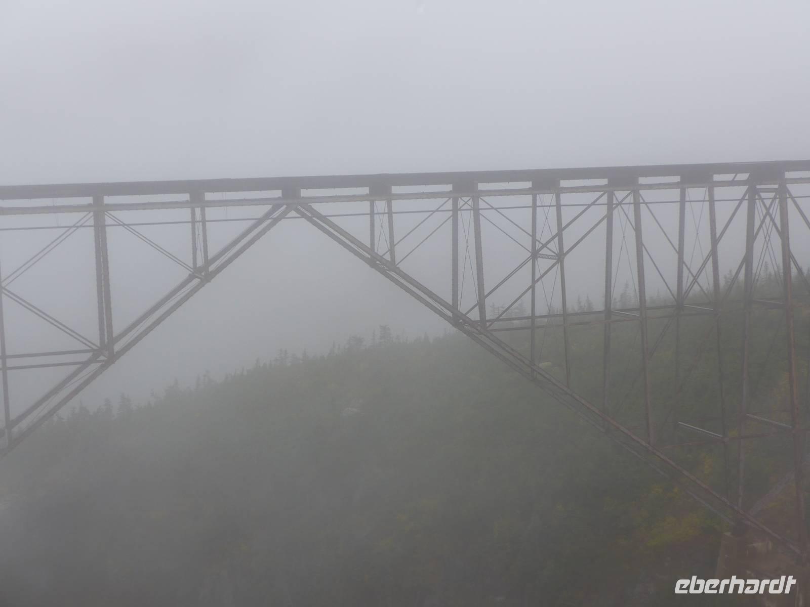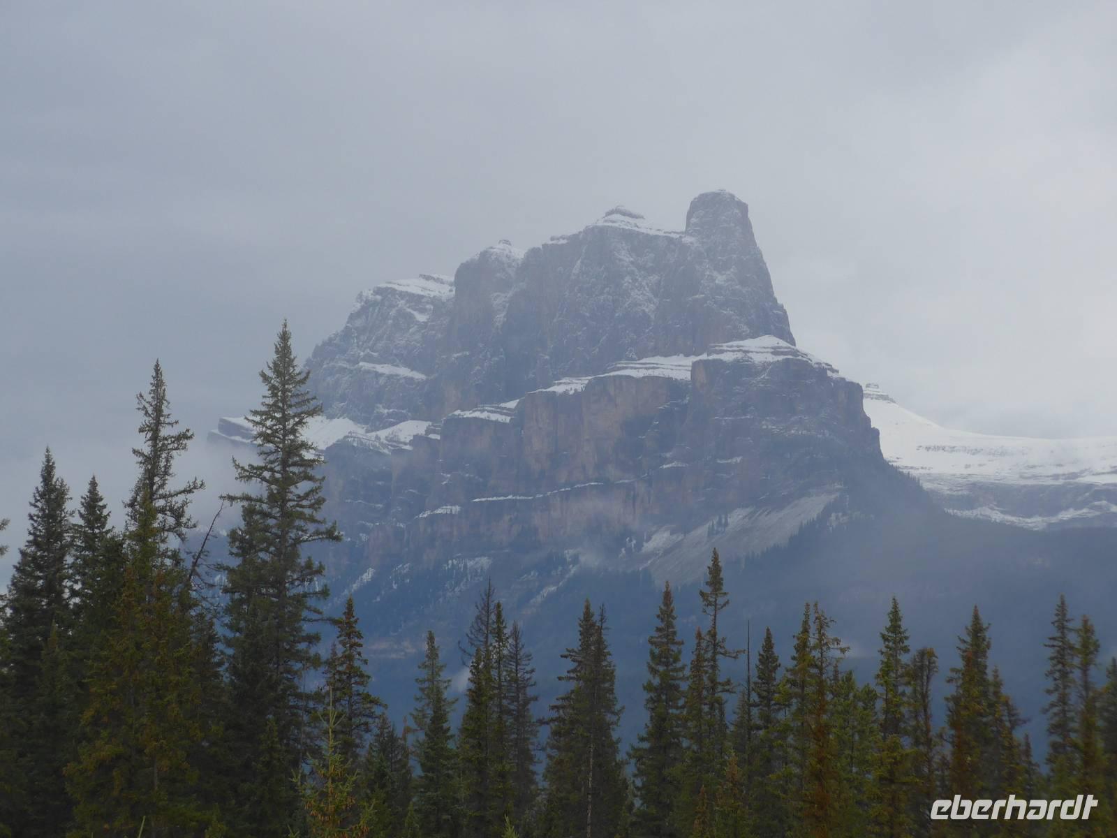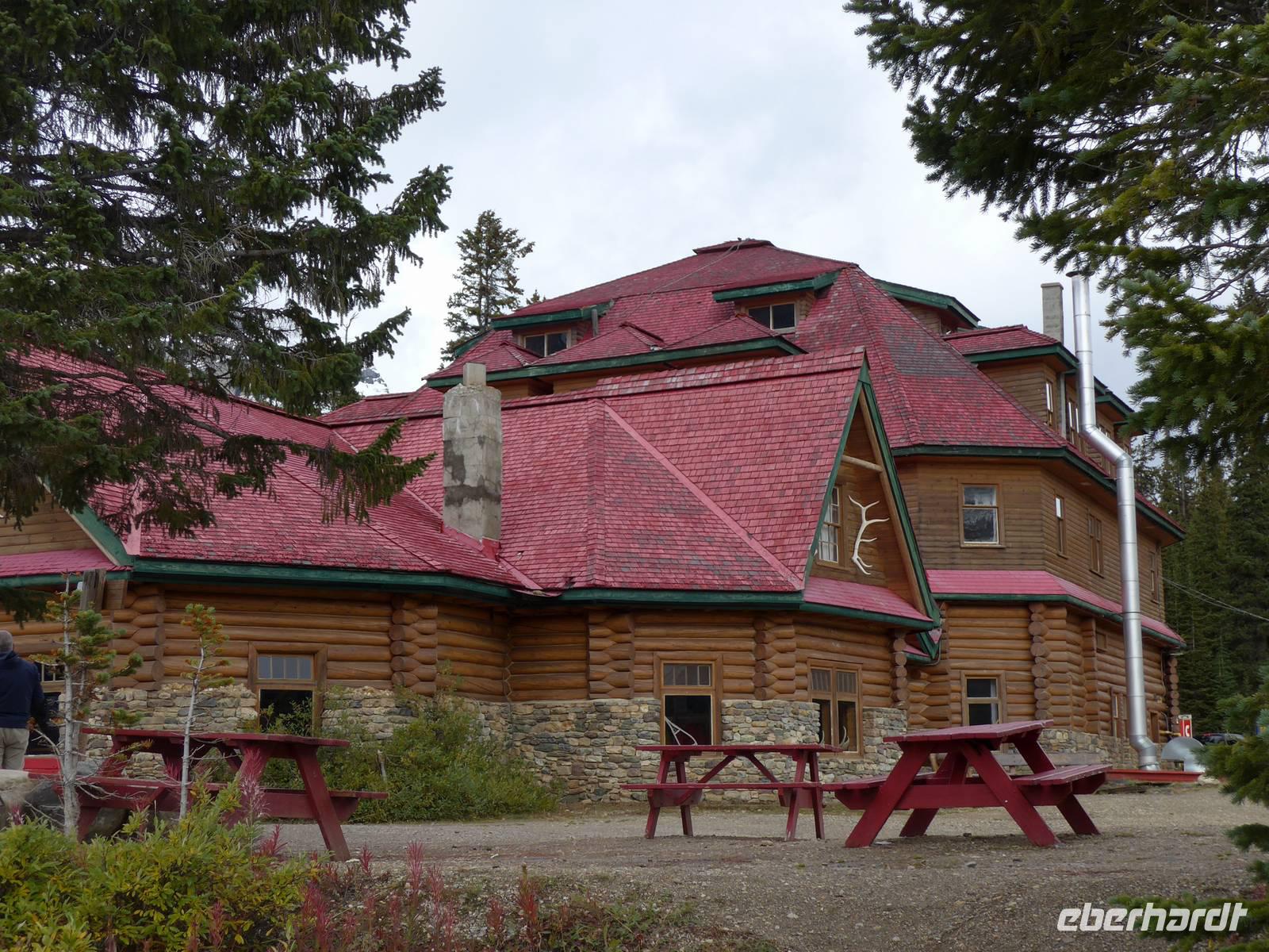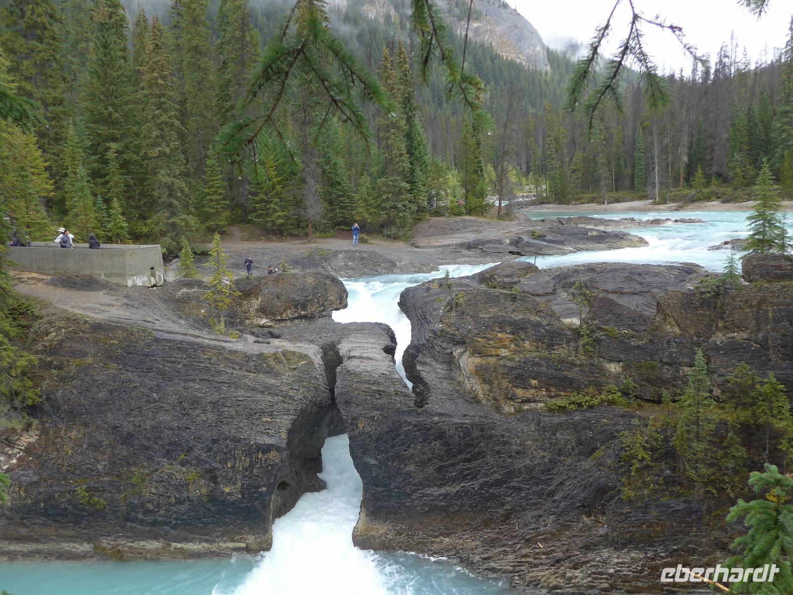 Auffahrt mit kleinen Aufhellungen war uns ein Ausblick am Gipfel verwehrt. Entschädigung war die erste Schneeballschlacht der Saison und das in Eis gehüllte Gipfelhaus. Einen Moment vergaß man den Hunger doch die Kälte trieb alle schließlich ins Restaurant, wo ein herrliches Frühstück auf uns wartete. Noch schnell einen Rundgang (schemenhaft war kurzzeitig die Sonne sogar sichtbar) ging es wieder talwärts. Die Gipfel waren nicht zu sehen, doch der Rundgang durch das Banff-Spring-Hotel entschädigte ein wenig. Nun begann die Rundfahrt durch den Banff- u. Yoho-Nationalpark. Wir erlebten unendliche Wälder, blaugrüne Seen sowie mächtige Wasserfälle. Im Yoho-Nationalpark, der der Vierte im Bunde der Nationalparks Kanadas ist, erreichen wir über den Kicking Horse Pass den Spiraltunnel. Wenn man geduldig wartet und einem das Glück holt ist, kann man hier Güterzüge sehen, die so lange sind, dass beide Seiten des Zuges aus dem Tunnel noch heraussehen. Uns blieb jedoch dieses Glück verwehrt - Montagebilder halten diesen Augenblick wach. Weiter geht es zu den nächsten Naturschönheiten. Wir erlebten zunächst den Emerald Lake mit seinem fast unnatürlichen türkisfarbigen Wasser. Anschließend die natürliche Brücke, die der Kicking Horse Fluss aus einer Felsbarierre förmlich aufgefresst hatte. Nun ging es wieder zurück in den Banff-Nationalpark und mit vielen Eindrücken kehrten wir zum Hotel zurück. Einige nutzten den Halt in Banff für eine Shopping-Tour. Bei so vielen Eindrücken hatten wir uns dann das Abendessen redlich verdient.