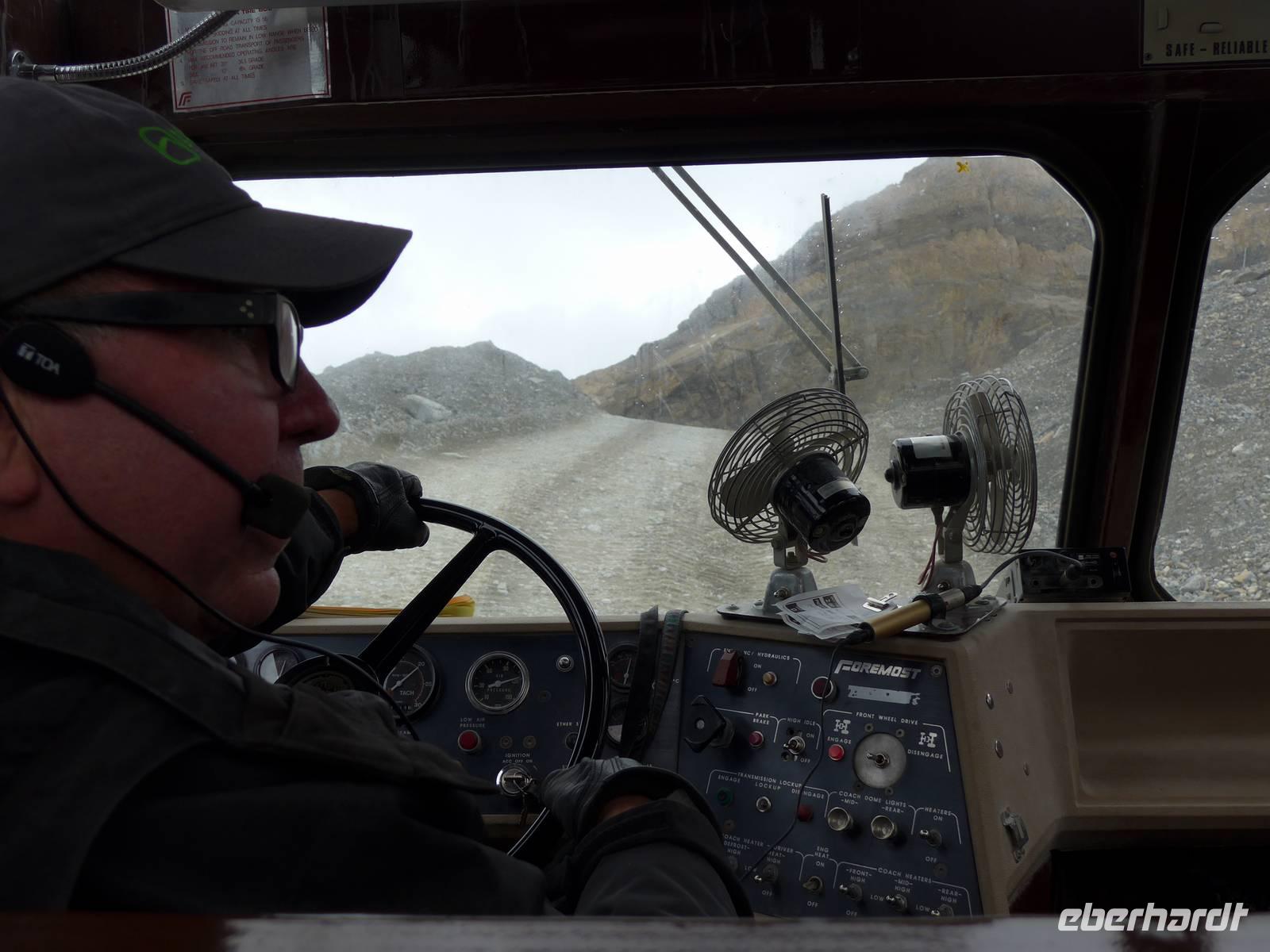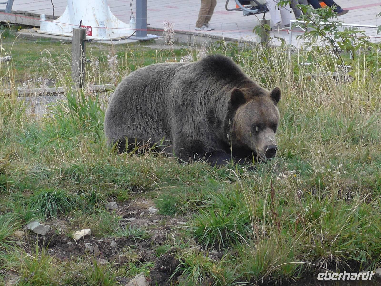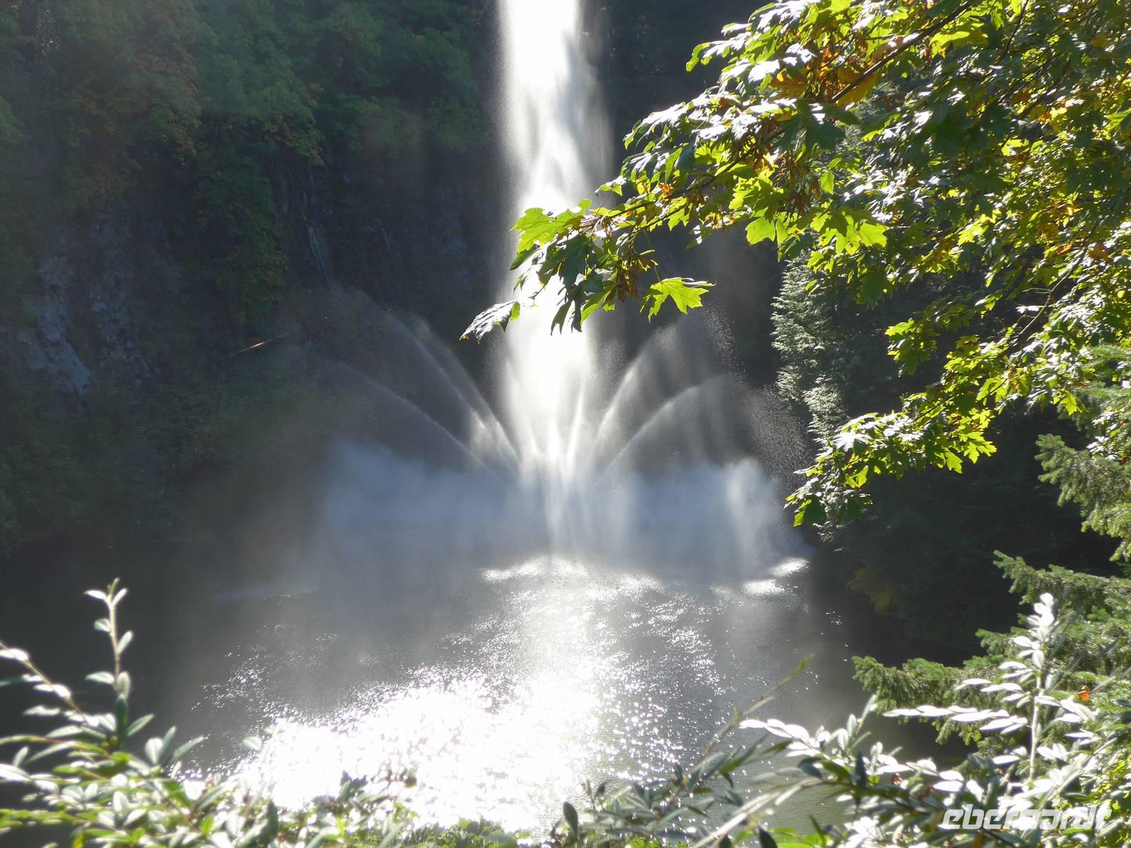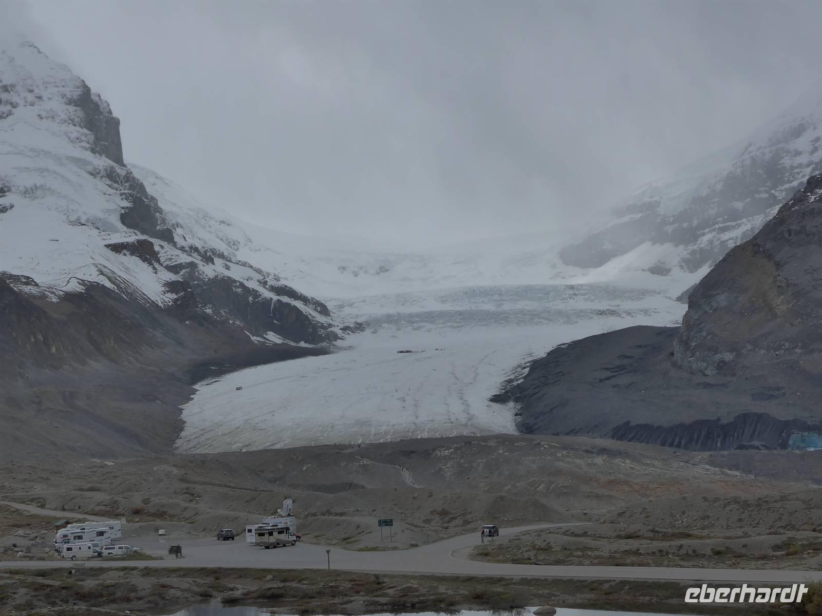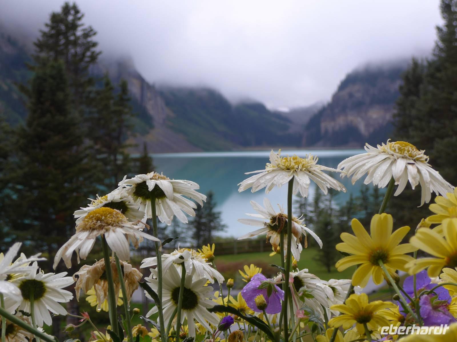 Auffahrt mit kleinen Aufhellungen war uns ein Ausblick am Gipfel verwehrt. Entschädigung war die erste Schneeballschlacht der Saison und das in Eis gehüllte Gipfelhaus. Einen Moment vergaß man den Hunger doch die Kälte trieb alle schließlich ins Restaurant, wo ein herrliches Frühstück auf uns wartete. Noch schnell einen Rundgang (schemenhaft war kurzzeitig die Sonne sogar sichtbar) ging es wieder talwärts. Die Gipfel waren nicht zu sehen, doch der Rundgang durch das Banff-Spring-Hotel entschädigte ein wenig. Nun begann die Rundfahrt durch den Banff- u. Yoho-Nationalpark. Wir erlebten unendliche Wälder, blaugrüne Seen sowie mächtige Wasserfälle. Im Yoho-Nationalpark, der der Vierte im Bunde der Nationalparks Kanadas ist, erreichen wir über den Kicking Horse Pass den Spiraltunnel. Wenn man geduldig wartet und einem das Glück holt ist, kann man hier Güterzüge sehen, die so lange sind, dass beide Seiten des Zuges aus dem Tunnel noch heraussehen. Uns blieb jedoch dieses Glück verwehrt - Montagebilder halten diesen Augenblick wach. Weiter geht es zu den nächsten Naturschönheiten. Wir erlebten zunächst den Emerald Lake mit seinem fast unnatürlichen türkisfarbigen Wasser. Anschließend die natürliche Brücke, die der Kicking Horse Fluss aus einer Felsbarierre förmlich aufgefresst hatte. Nun ging es wieder zurück in den Banff-Nationalpark und mit vielen Eindrücken kehrten wir zum Hotel zurück. Einige nutzten den Halt in Banff für eine Shopping-Tour. Bei so vielen Eindrücken hatten wir uns dann das Abendessen redlich verdient.