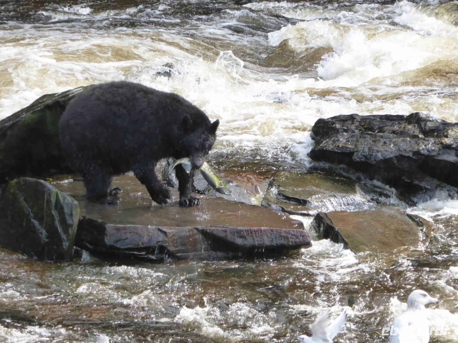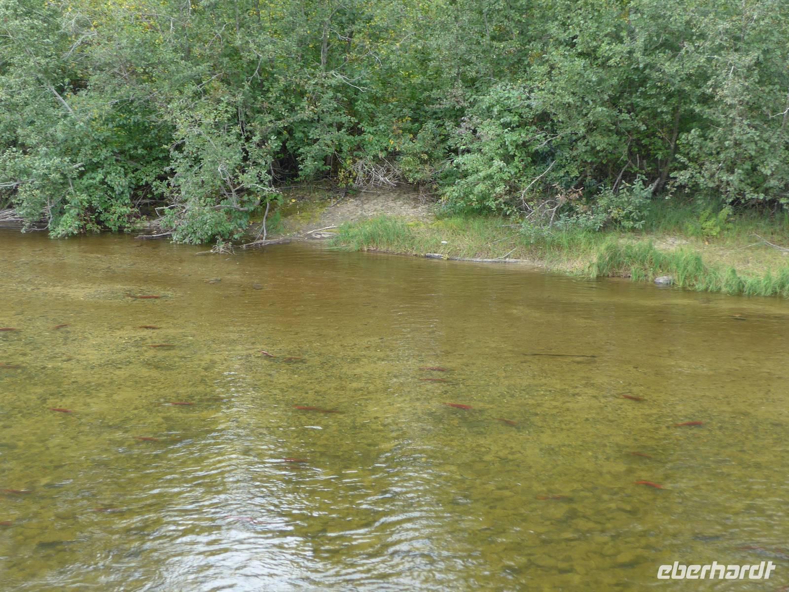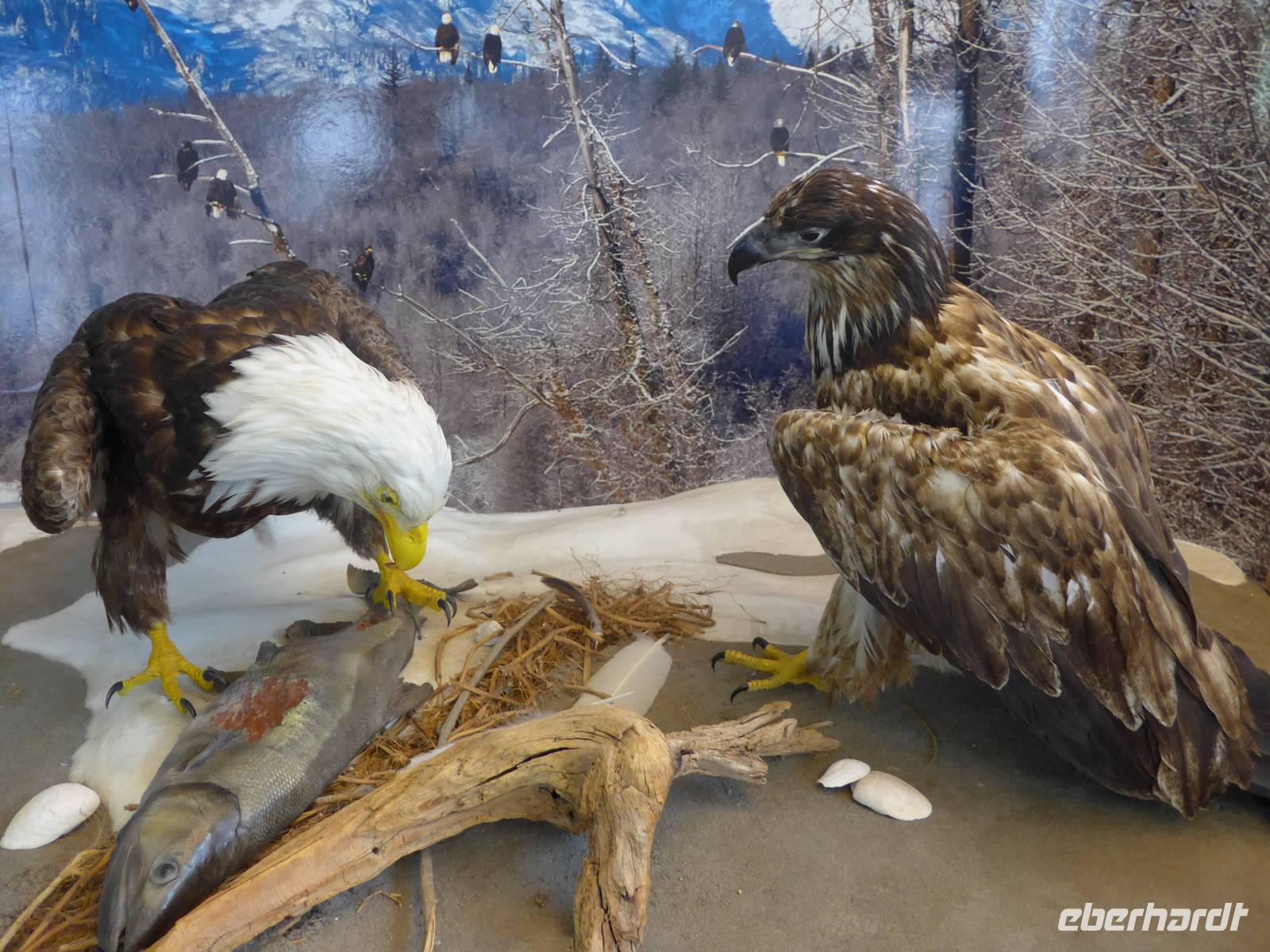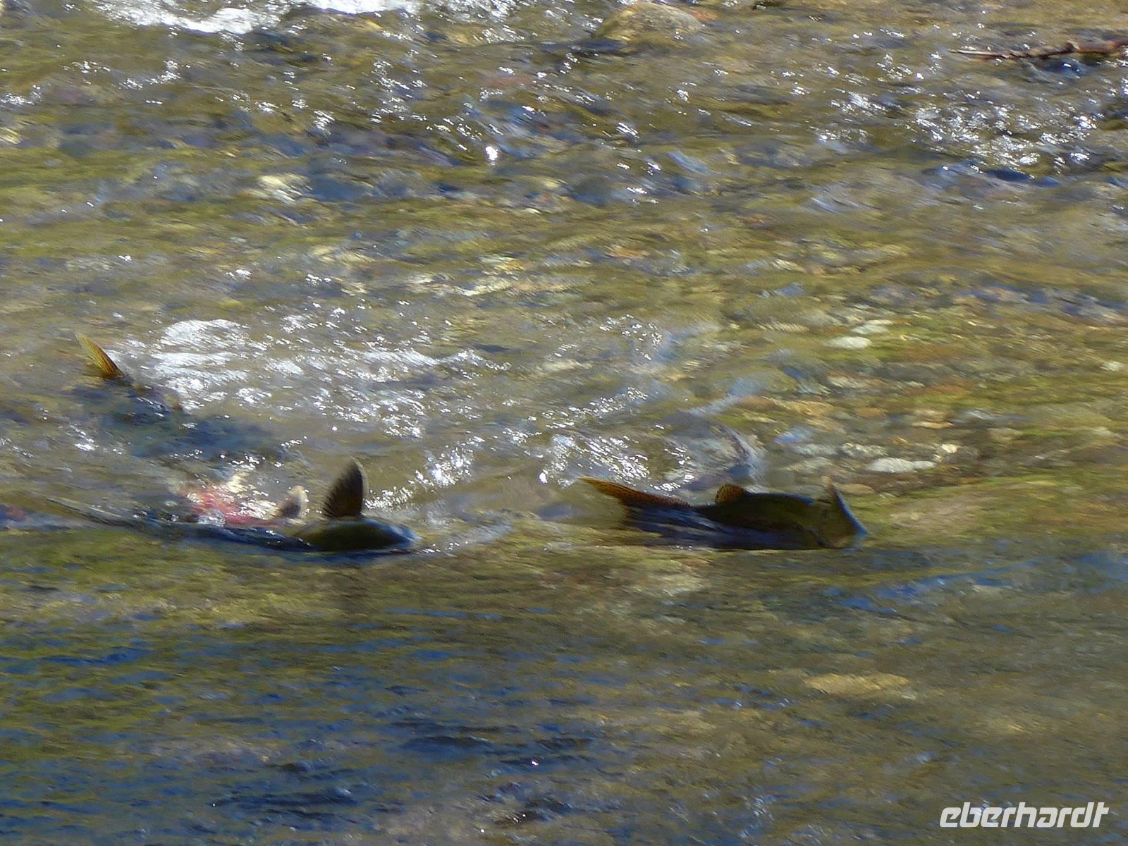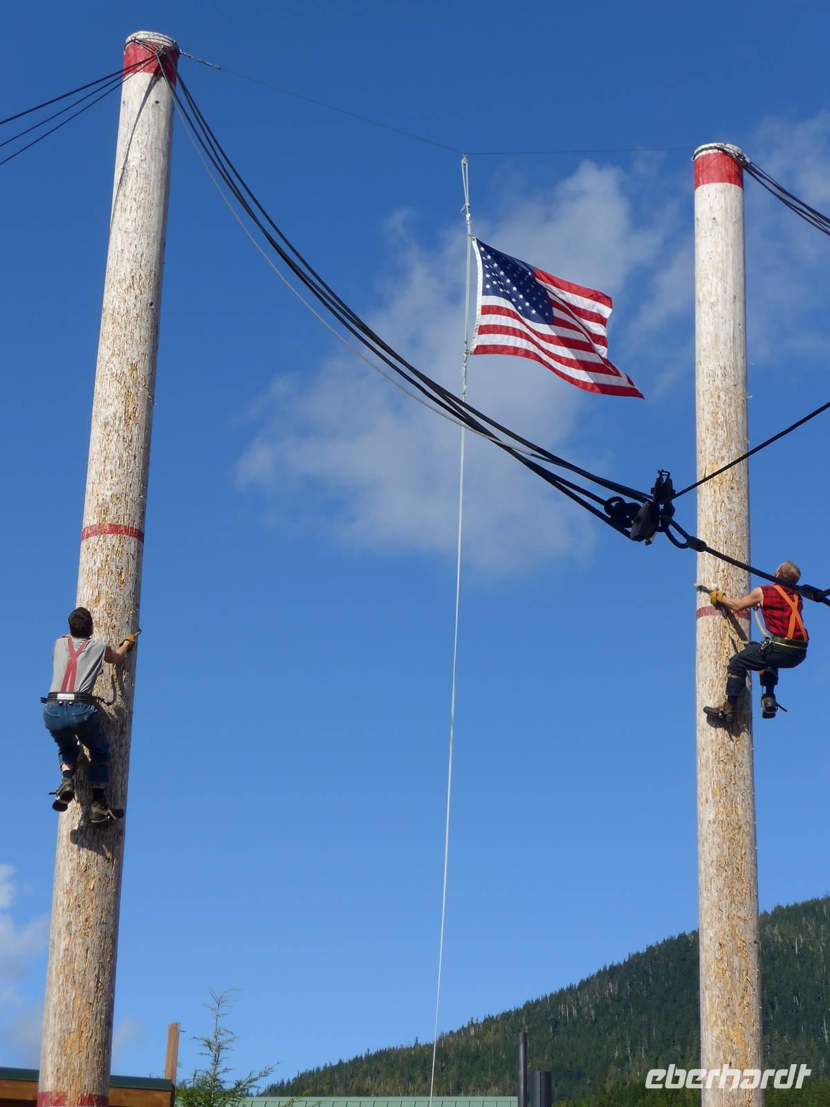 Nun erlebten wir ein typisch amerikanisches Entertainment. Lumberjack Show ein großes Schild am Eingang machte uns darauf aufmerksam. Wir erlebten dann, wie Holzfäller gegeneinander in verschiedenen Disziplinen, wie z. B. Baumstammsägen, Baumstamm hochklettern oder Axtwerfen antraten und nebenbei auch noch flotte Sprüche klopften. Das Spektakel wurde mit Anfeuerungsrufen der Besucher begleitet u. alle waren sich einig. Die Jungs in ihren Latzhosen haben viel von ihrem Können gezeigt. Am Ende der sehr belustigenden und amüsanten Show, die eben so richtig amerikanisch war, ging es zum Saxman Native Village etwas außerhalb der Stadt. Im Besucherzentrum wurde uns die Tradition u. Stammesregeln näher gebracht. Im Langhaus erlebten wir die Tradition der Natives in Form von Tänzen. Blickfang waren die bunten Trachten - deren Motive natürlich einen tieferen Sinn hatten. Danach erzählte jeder Totempfahl vor dem Langhaus stehend, egal ob restauriert oder neue, eine Geschichte - ob Adresse, Erinnerung an „Schlachten" oder Andenken in Symbolen ist vieles darin zu lesen. Impossante Kunstwerke, die liegend bearbeitet werden und dann in einer feierlichen Zeremonie aufgestellt werden. Hergestellt wurden alle aus der roten Zeder oder wie die Indianer sagen aus dem „tree of life" (Baum des Lebens) und sie erzählen oftmals die Familienchronik der einzelnen Clans. In der Schnitzwerkstatt konnten wir den Künstlern, die ihr Handwerk verstanden über die Schulter schauen. Ob Restauration alter Totempfähle oder neue Eigenkreationen - ist diese Werkstatt eine gute Anlaufstelle. Kunstwerke stehen u.a. auch in Juneau. Wieder im Zentrum lockte die Creekstreet. Entlang der auf Stelzen im Wasser errichteten Creek Street ging es durchs einstige Rotlichtviertel der Stadt. An so mancher Tafel erfuhren wir viel über die einstigen Bewohner. Immer wieder zog es uns aber in Richtung Geländer. Wie magisch betrachteten wir das Wasser. Lachse schwimmen neben bereits verendeten „Kameraden". Vereinzelt konnte man noch das Lachsspringen an einer renovierungsbedürftigen Lachstreppe beobachten, wie sie die Stromschnellen überwanden. Ein Tag geht zu Ende - mehr Sonne als Regen - eher ungewöhnlich für diese Stadt - wird sie auch die „Regenstadt" Alaskas genannt. Beim Abendessen war das Erlebnis mit Bären, das einige Gäste im Rahmen ihres Ausfluges hatten, Gesprächsthema Nummer eins. ,Und jeder der heute Abend Fisch aß, dachte vielleicht an die Lachse und ihren mühevollen Heimweg zur Geburtsstätte.