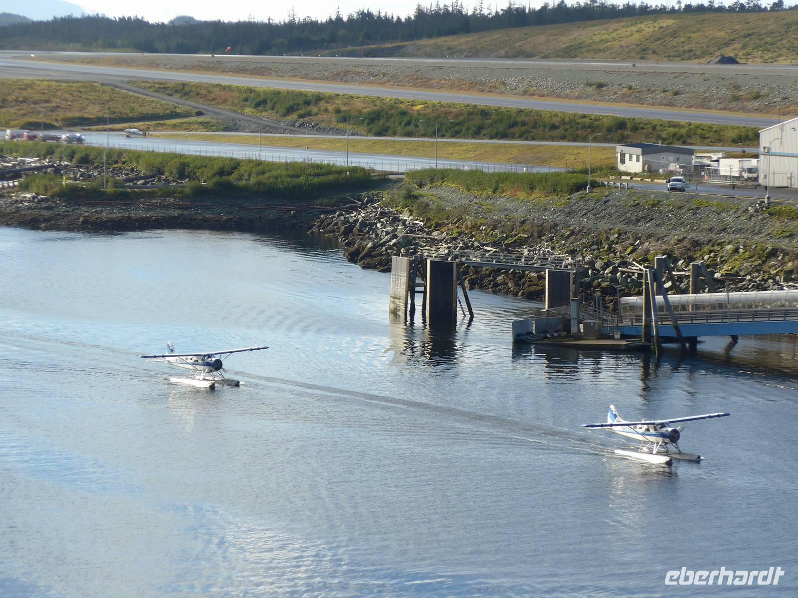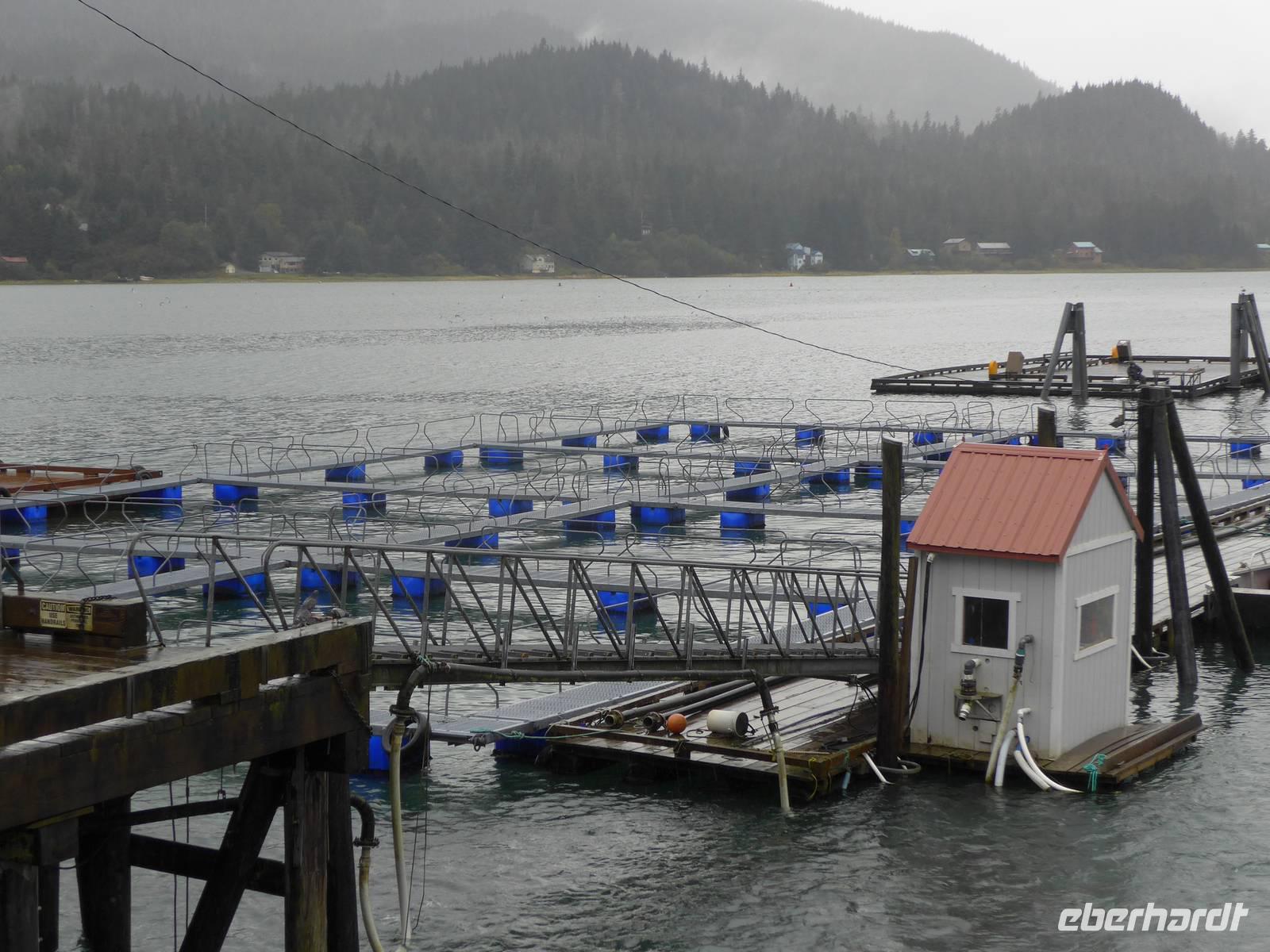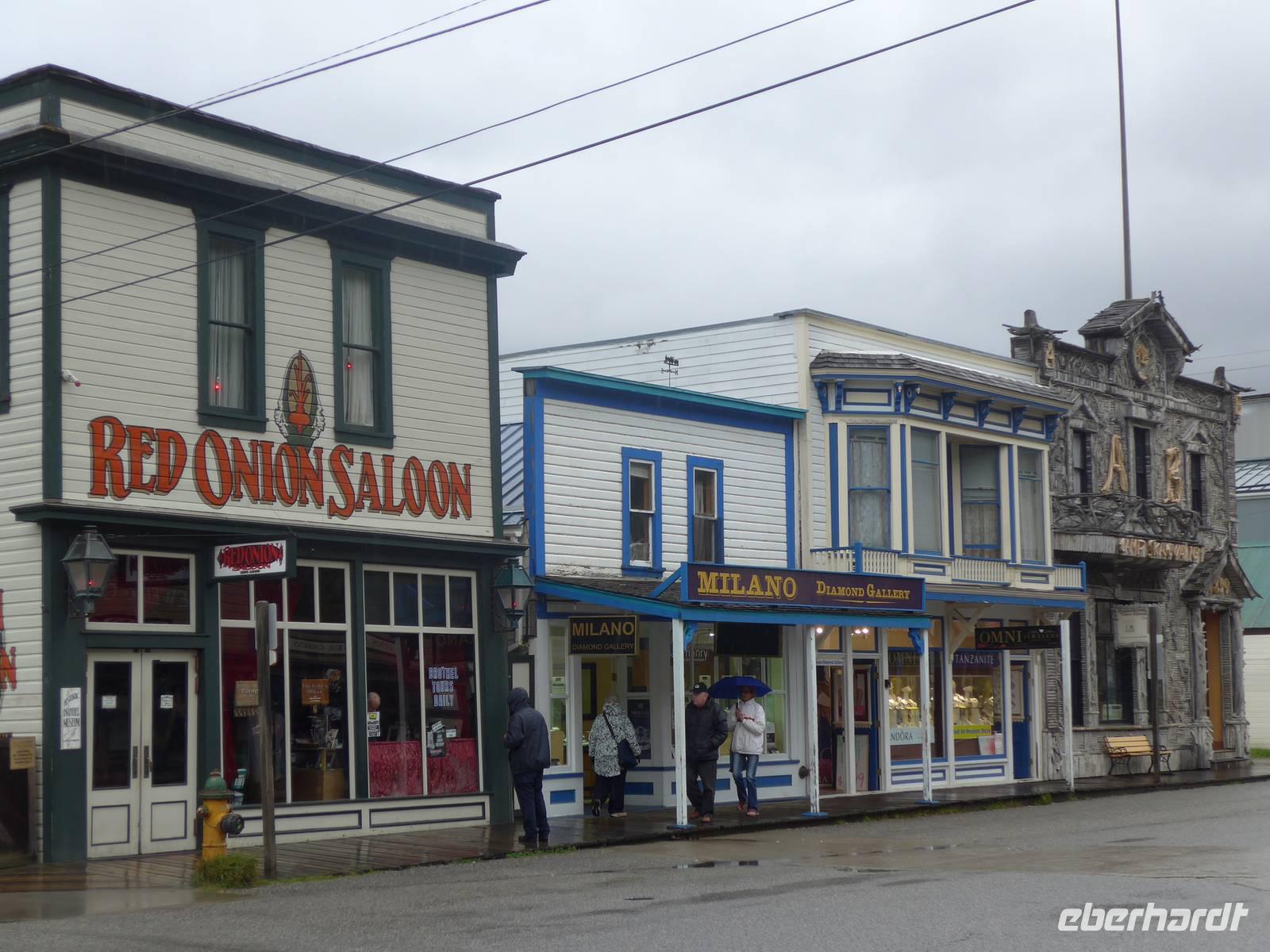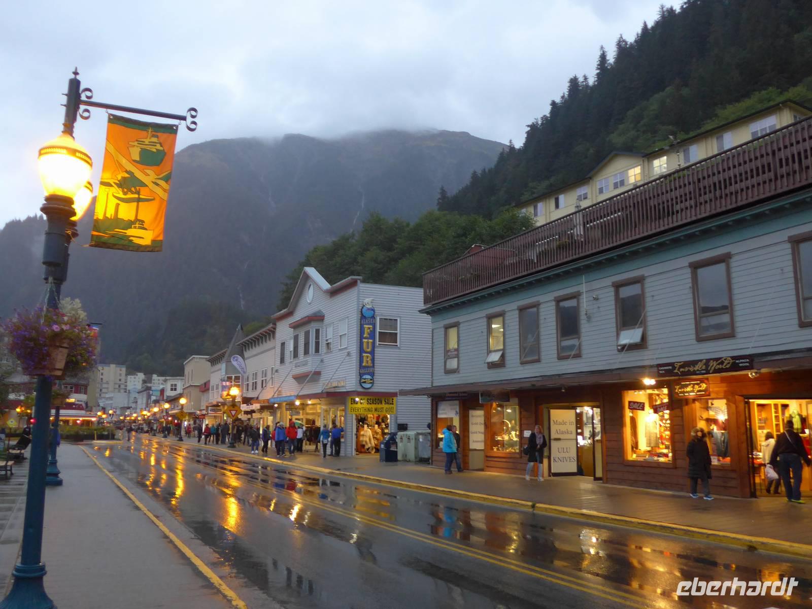 Juneau ist die Hauptstadt Alaskas, die nur per Schiff oder per Helikopter erreichbar, denn sie ist ohne Straßenanschluss. Einst durch den Goldrausch war sie blühende Goldgräberstadt, die sich dann zur einer modernen Siedlung wandelte. Sie liegt mit ihren bunten Häuschen, der schmalen Einkaufsstraße und dem hübschen Hafenbecken umrahmt von hohen Bergen am Gastineau Kanal. Nach unserem gestrigen Seetag erreichten wir diesen Ort nachmittags. Das große Kreuzfahrtschiff mit Passagieren und Crewmitgliedern ließen wir zurück und machten uns auf zu unserem Eberhardt-Exklusiv-Ausflug. Höhepunkte durften wir am heutigen Tag in kleiner Gruppe erleben. Zunächst ging es zu einer Lachsfarm. Die Lachsaufzuchtfarm ist wichtig für die Lachspolulation, denn aufgrund Sportfischerei und reger Gewerbefischerei muss so das Gleichgewicht erhalten werden. Dazu werden jährlich 130 Millionen Lachse von der Station in die Freiheit entlassen. Aber nur 1-2 Millionen finden den Weg „nach Hause". Bei der Besichtigung wurde uns das Gelände mit den Aufzuchtbecken gezeigt und wir erfuhren alles was man zum Lachs wissen sollte. Als Höhepunkt nun die Fahrt zum Mendenhall-Gletscher. Auf dem 4000 Km² großem Juneau Eisfeld befinden sich insgesamt 38 große und über 100 kleinere Gletscher. Dem mehr als 12 Km langen und 2,4 Km breiten Mendenhall-Gletscher mit seinem bis zu 550 Meter dicken Eis kamen wir also heute ganz nahe. Trotz trüben Wetter und Regen schimmerte der Gletscher in seinen typisch blauen Farben. Eingebettet zwischen saftig grünen Wäldern bot der mit treibenden Eisschollen versehene See fantastische Bilder. Als Unterstand diente das Besucherzentrum. Aber nicht nur deswegen lohnt der Besuch, sondern eine gute Ausstellung mit Erläuterung von Ranger und ein Film waren den Besuch wert. Schade, dass uns der Gletscher nicht so begrüßte wie auf den Filmaufnahmen! Den Abschluss des heutigen Tages bildete der Besuch im Red Dog Saloon. Sägespäne am Boden erinnert an die Zeit, als man dort noch mit den Pferden an der Theke vorbei schaute. Ein Glas Alaska Amer oder Guinness und dann ging es mit dem Shuttle-Bus zum Schiff, wo schon das Abendessen auf uns wartete.