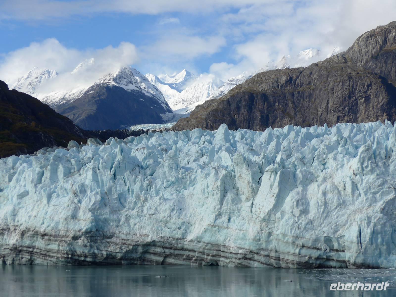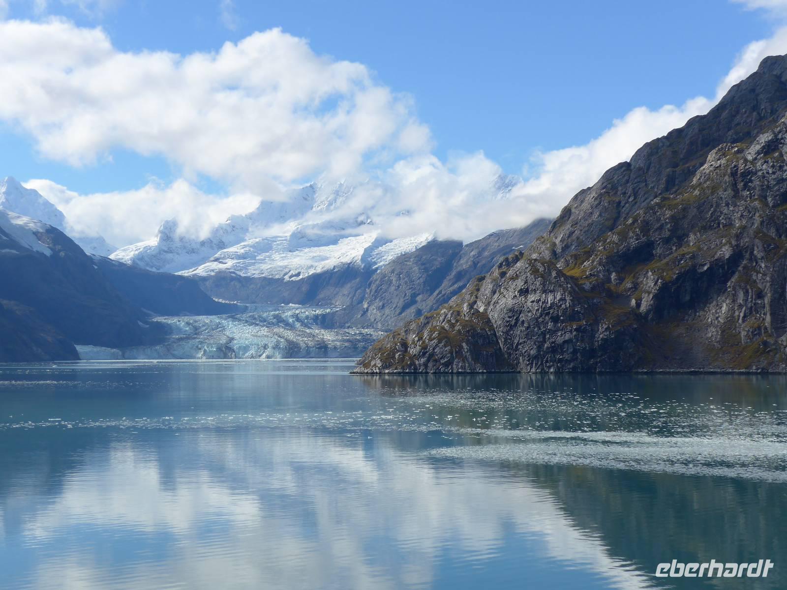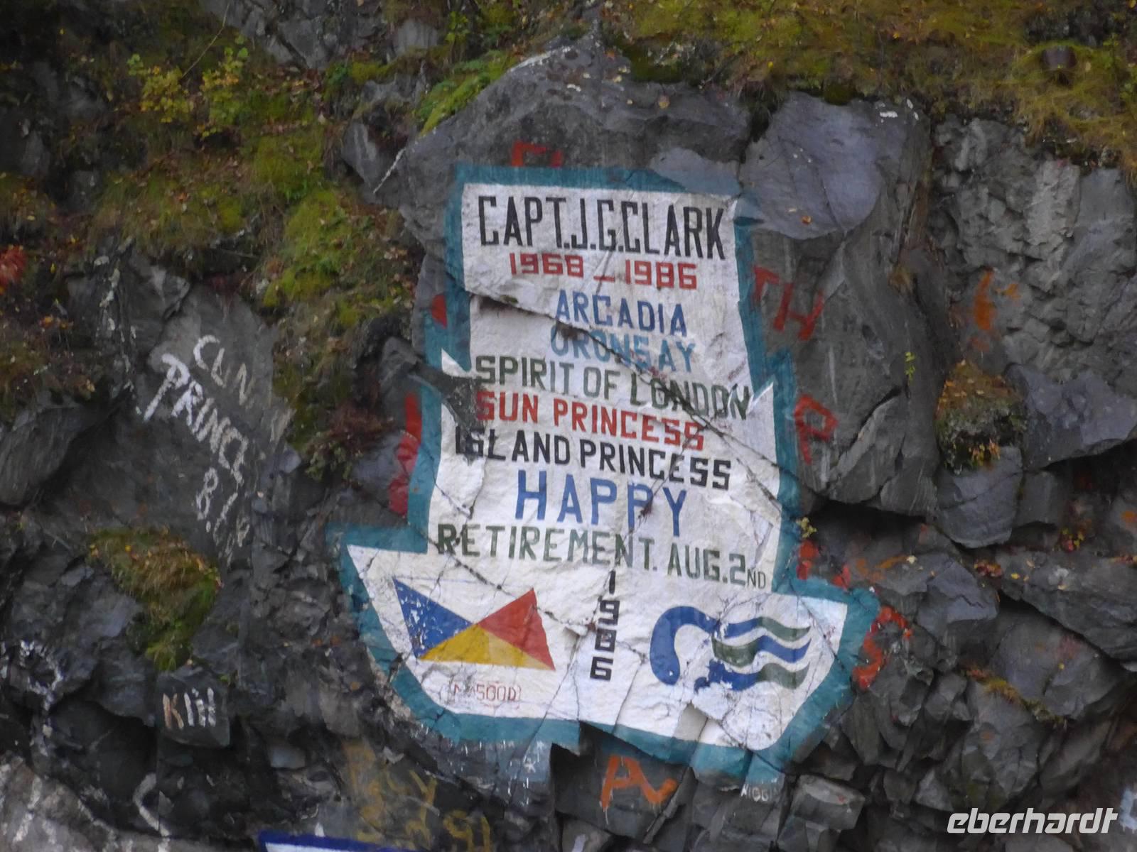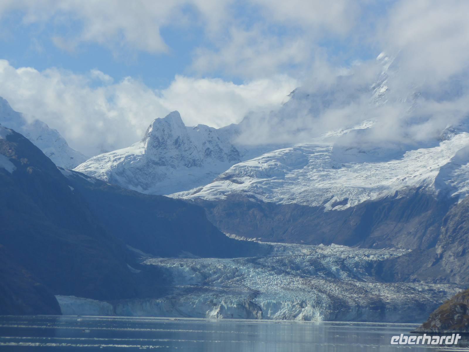 Juneau ist die Hauptstadt Alaskas, die nur per Schiff oder per Helikopter erreichbar, denn sie ist ohne Straßenanschluss. Einst durch den Goldrausch war sie blühende Goldgräberstadt, die sich dann zur einer modernen Siedlung wandelte. Sie liegt mit ihren bunten Häuschen, der schmalen Einkaufsstraße und dem hübschen Hafenbecken umrahmt von hohen Bergen am Gastineau Kanal. Nach unserem gestrigen Seetag erreichten wir diesen Ort nachmittags. Das große Kreuzfahrtschiff mit Passagieren und Crewmitgliedern ließen wir zurück und machten uns auf zu unserem Eberhardt-Exklusiv-Ausflug. Höhepunkte durften wir am heutigen Tag in kleiner Gruppe erleben. Zunächst ging es zu einer Lachsfarm. Die Lachsaufzuchtfarm ist wichtig für die Lachspolulation, denn aufgrund Sportfischerei und reger Gewerbefischerei muss so das Gleichgewicht erhalten werden. Dazu werden jährlich 130 Millionen Lachse von der Station in die Freiheit entlassen. Aber nur 1-2 Millionen finden den Weg „nach Hause". Bei der Besichtigung wurde uns das Gelände mit den Aufzuchtbecken gezeigt und wir erfuhren alles was man zum Lachs wissen sollte. Als Höhepunkt nun die Fahrt zum Mendenhall-Gletscher. Auf dem 4000 Km² großem Juneau Eisfeld befinden sich insgesamt 38 große und über 100 kleinere Gletscher. Dem mehr als 12 Km langen und 2,4 Km breiten Mendenhall-Gletscher mit seinem bis zu 550 Meter dicken Eis kamen wir also heute ganz nahe. Trotz trüben Wetter und Regen schimmerte der Gletscher in seinen typisch blauen Farben. Eingebettet zwischen saftig grünen Wäldern bot der mit treibenden Eisschollen versehene See fantastische Bilder. Als Unterstand diente das Besucherzentrum. Aber nicht nur deswegen lohnt der Besuch, sondern eine gute Ausstellung mit Erläuterung von Ranger und ein Film waren den Besuch wert. Schade, dass uns der Gletscher nicht so begrüßte wie auf den Filmaufnahmen! Den Abschluss des heutigen Tages bildete der Besuch im Red Dog Saloon. Sägespäne am Boden erinnert an die Zeit, als man dort noch mit den Pferden an der Theke vorbei schaute. Ein Glas Alaska Amer oder Guinness und dann ging es mit dem Shuttle-Bus zum Schiff, wo schon das Abendessen auf uns wartete.