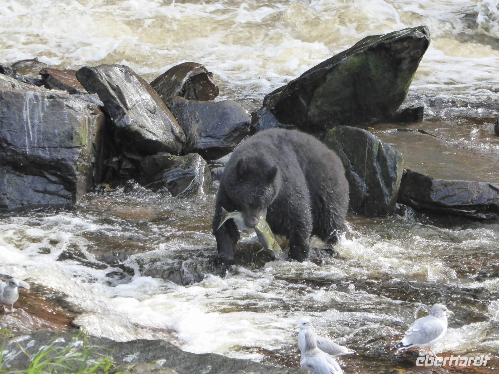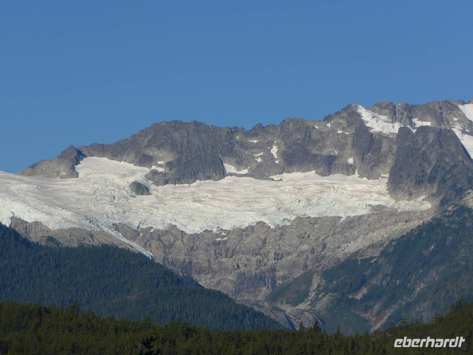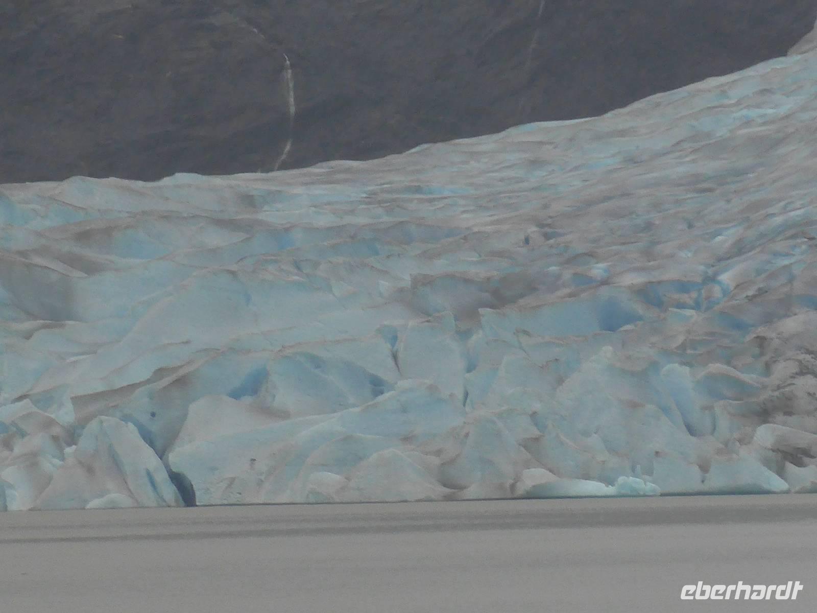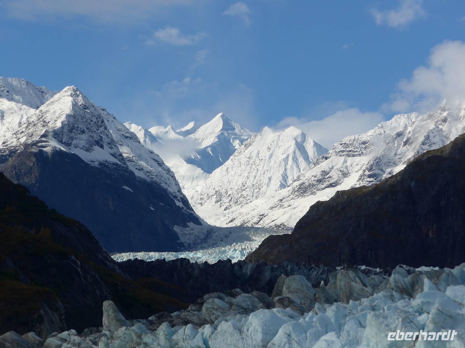 Juneau ist die Hauptstadt Alaskas, die nur per Schiff oder per Helikopter erreichbar, denn sie ist ohne Straßenanschluss. Einst durch den Goldrausch war sie blühende Goldgräberstadt, die sich dann zur einer modernen Siedlung wandelte. Sie liegt mit ihren bunten Häuschen, der schmalen Einkaufsstraße und dem hübschen Hafenbecken umrahmt von hohen Bergen am Gastineau Kanal. Nach unserem gestrigen Seetag erreichten wir diesen Ort nachmittags. Das große Kreuzfahrtschiff mit Passagieren und Crewmitgliedern ließen wir zurück und machten uns auf zu unserem Eberhardt-Exklusiv-Ausflug. Höhepunkte durften wir am heutigen Tag in kleiner Gruppe erleben. Zunächst ging es zu einer Lachsfarm. Die Lachsaufzuchtfarm ist wichtig für die Lachspolulation, denn aufgrund Sportfischerei und reger Gewerbefischerei muss so das Gleichgewicht erhalten werden. Dazu werden jährlich 130 Millionen Lachse von der Station in die Freiheit entlassen. Aber nur 1-2 Millionen finden den Weg „nach Hause". Bei der Besichtigung wurde uns das Gelände mit den Aufzuchtbecken gezeigt und wir erfuhren alles was man zum Lachs wissen sollte. Als Höhepunkt nun die Fahrt zum Mendenhall-Gletscher. Auf dem 4000 Km² großem Juneau Eisfeld befinden sich insgesamt 38 große und über 100 kleinere Gletscher. Dem mehr als 12 Km langen und 2,4 Km breiten Mendenhall-Gletscher mit seinem bis zu 550 Meter dicken Eis kamen wir also heute ganz nahe. Trotz trüben Wetter und Regen schimmerte der Gletscher in seinen typisch blauen Farben. Eingebettet zwischen saftig grünen Wäldern bot der mit treibenden Eisschollen versehene See fantastische Bilder. Als Unterstand diente das Besucherzentrum. Aber nicht nur deswegen lohnt der Besuch, sondern eine gute Ausstellung mit Erläuterung von Ranger und ein Film waren den Besuch wert. Schade, dass uns der Gletscher nicht so begrüßte wie auf den Filmaufnahmen! Den Abschluss des heutigen Tages bildete der Besuch im Red Dog Saloon. Sägespäne am Boden erinnert an die Zeit, als man dort noch mit den Pferden an der Theke vorbei schaute. Ein Glas Alaska Amer oder Guinness und dann ging es mit dem Shuttle-Bus zum Schiff, wo schon das Abendessen auf uns wartete.