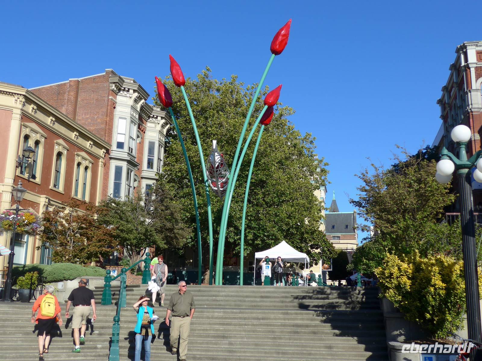 An der Null-Mile ein Fotostopp und dann ging es durch das Villenviertel von Victoria in Richtung Butchart Garden. Einst ein Kalksteinbruch entstand 1904 hier ein gartenarchitektonisches Paradies. Auch nach den zahlreichen Naturerlebnissen wollten wir uns dieses Gartenparadies nicht entgehen lassen. Ist dieser Ort doch seit 2004 zur Nationalhistoric Site of Canada ernannt worden. Zu seiner Schönheit tragen mehr als 50 Gärtner bei. Kein Wunder werden doch jährlich mehr als 1 Million Pflanzen gesetzt. Insgesamt sind aber 500 Leute in Lohn und Brot. Mit seinen 22 ha und fünf Hauptbereichen (Senkgarten, Rosengarten, Japanischer Garten und Mediterraner Garten) konnte jeder ausgieblig diesen nach seinen Vorlieben entdecken. Danach ging es zum Hafen von Swartz Bay und von dort aus setzten wir über zum Festland nach Vancouver. Durch die Scherenlandschaft und schon bald konnten wir vor der majestätischen Kulisse der Küstengebirge die Skyline von Vancouver mit seinen Wolkenkratzern erkennen. Die Glastürme, die das Sonnenlicht reflektieren, lassen die Stadt hell und freundlich erscheinen und verschaffen den Straßen einen besonders lebhaften Glanz. Moderne Appartmentblocks und futuristisch elegante Hotels prägen diesen Teil der Stadt. Besonders auffällig war das Canada Palace, welches immer wieder zahlreiche Besucher anlockt und natürlich durch sein imposantes Dach in Form eines Segels als bemerkenswerter Komplex heraussticht. Bei einer Stadtrundfahrt sollten wir Vancouver näher kennenlernen. Auf dieser Tour sahen wir u. a. weiter das ehemalige Expo-Gelände von 1986, das Olypische Feuer, Chinatown, Gastown mit der Statue des „Gassy Jack" und der Dampfuhr. Natürlich durfte der große steinerne Inuskshuk, das Wahrzeichen der Winterspiele von 2010 nicht fehlen. Am Ende nutzten noch einige die freie Zeit und erlebten die Stadt aufgrund auf eigene Faust. Liebevoll restaurierte Gebäude aus viktorianischer Zeit, sowie alte Gaslaternen, Kopfsteinpflaster und bunte Blumenkübel sind doch ideale Voraussetzungen für einen gemütlichen Bummel durch die Stadt. So neigte sich ein herrlicher Tag dem Ende.