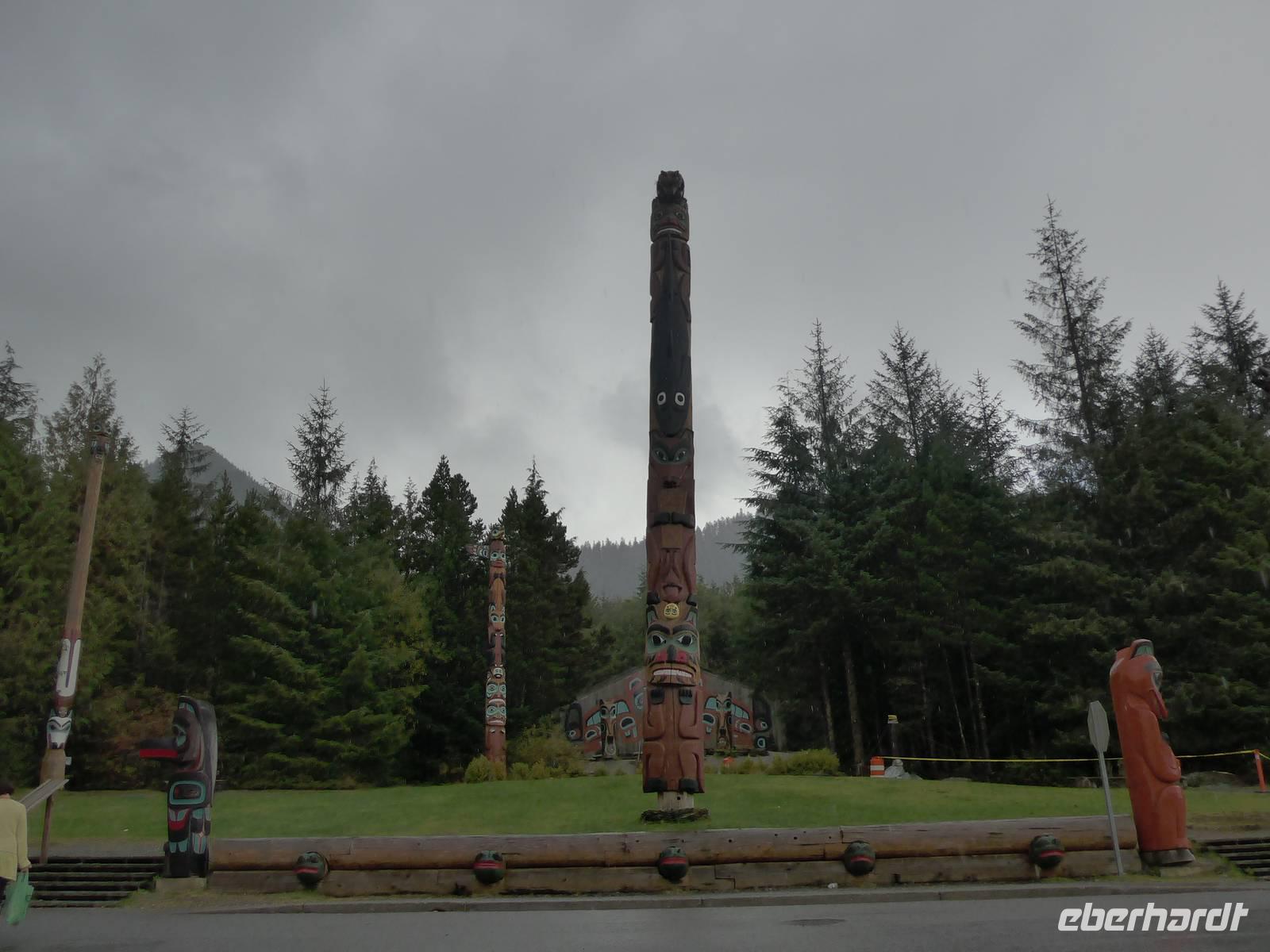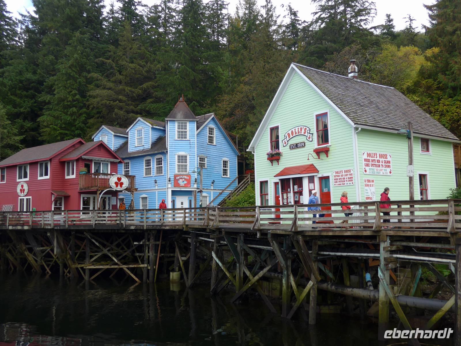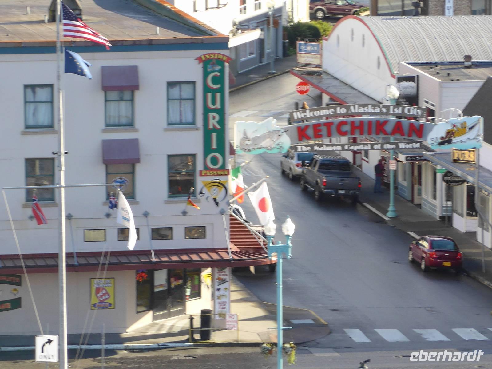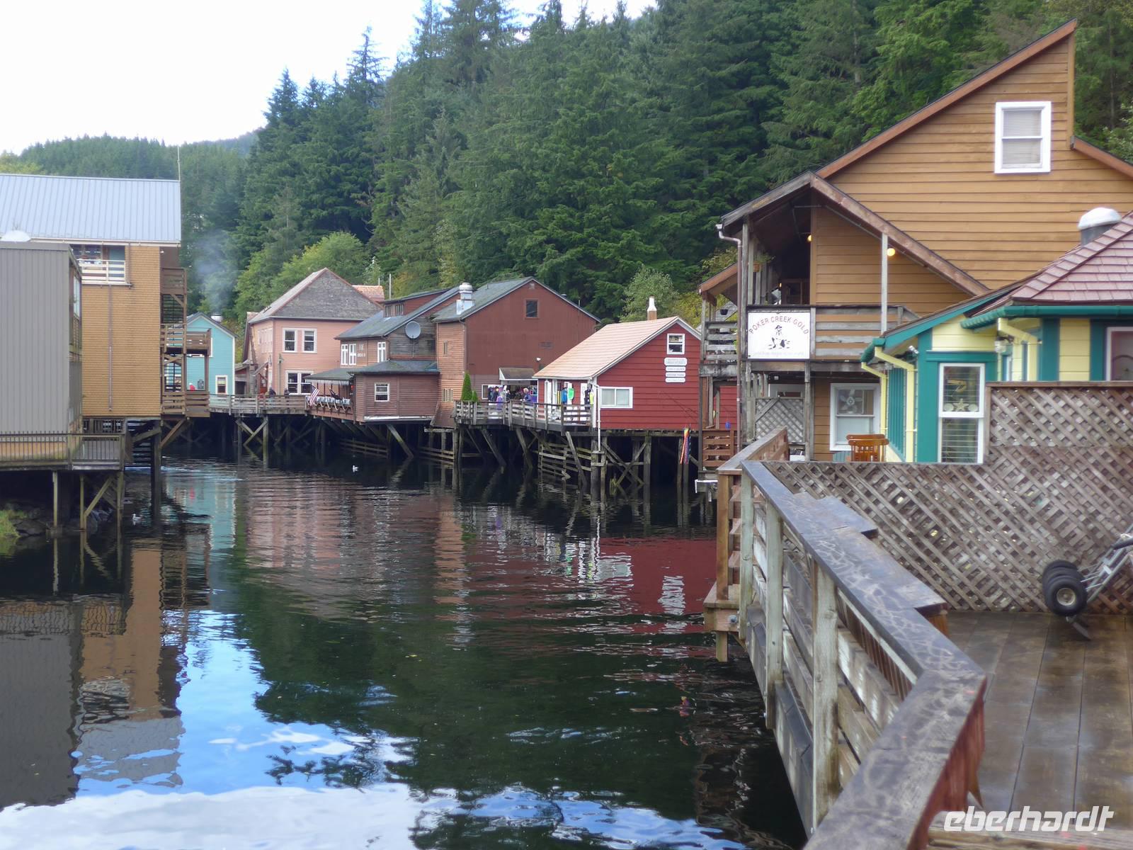 Wir wurden vom kleinen Städtchen Ketchikan, das sich als „Hauptstadt der Lachse" bezeichnet, begrüßt. Da sich dieser Ort auch als der Ort mit der größten Totempfahlsammlung brüstet, sind waren wir auf den Landgang sehr gespannt. Schon vom Schiff aus haben wir eine bunte Stadt wahrgenommen. Schnell von Bord!