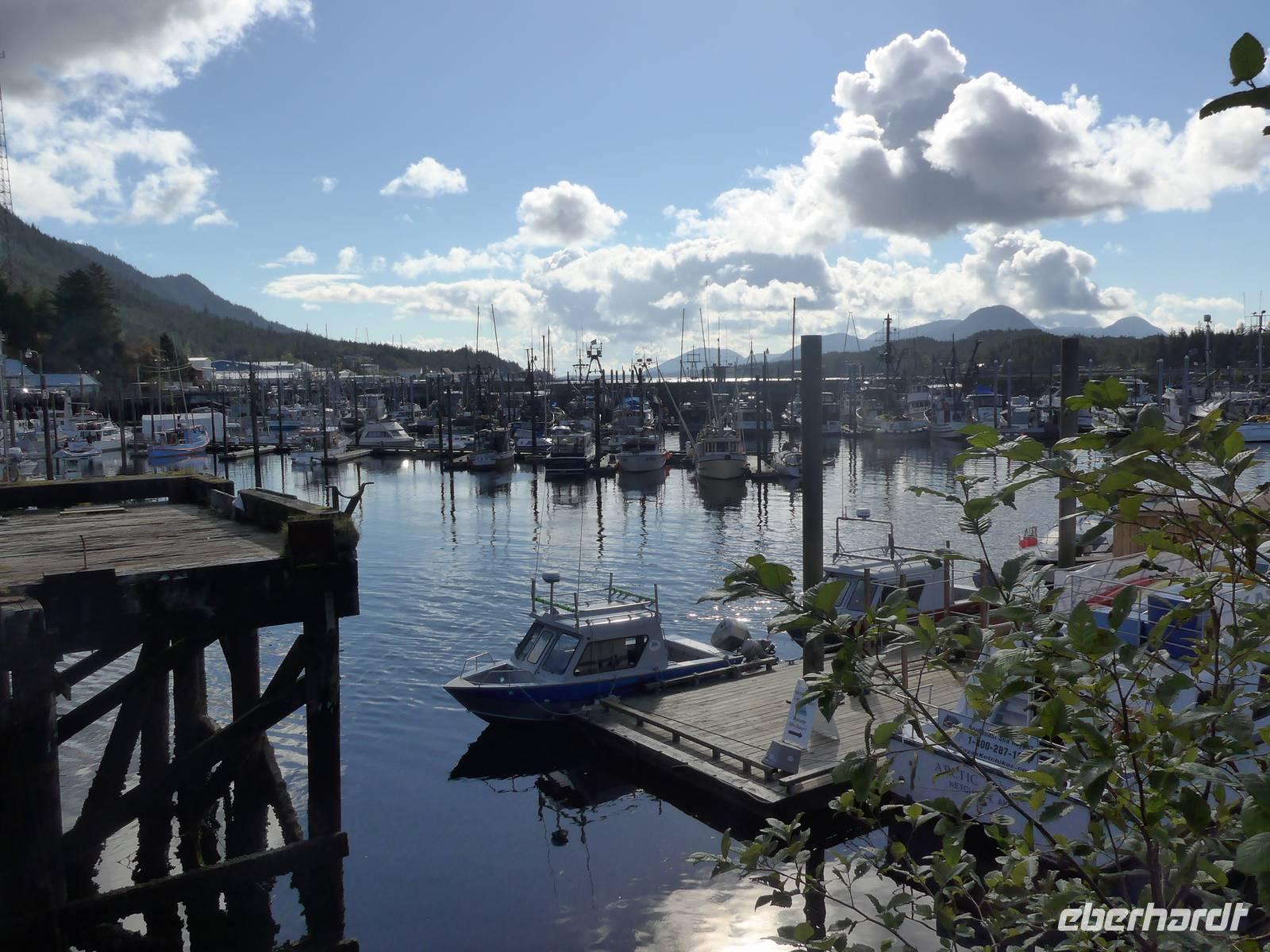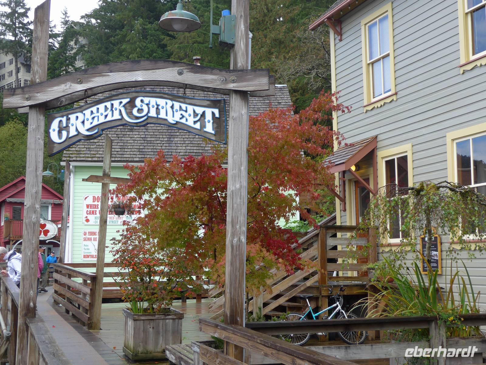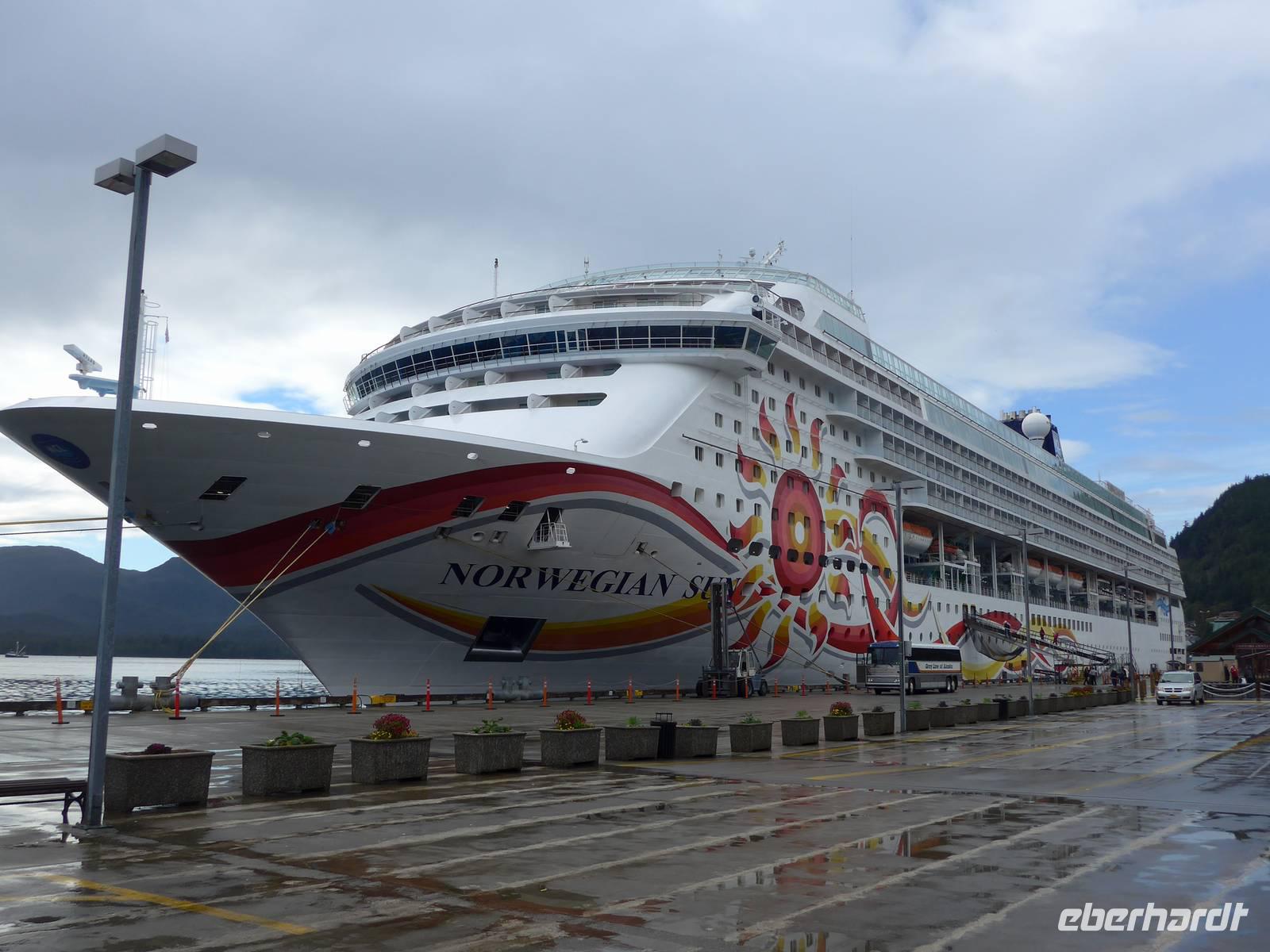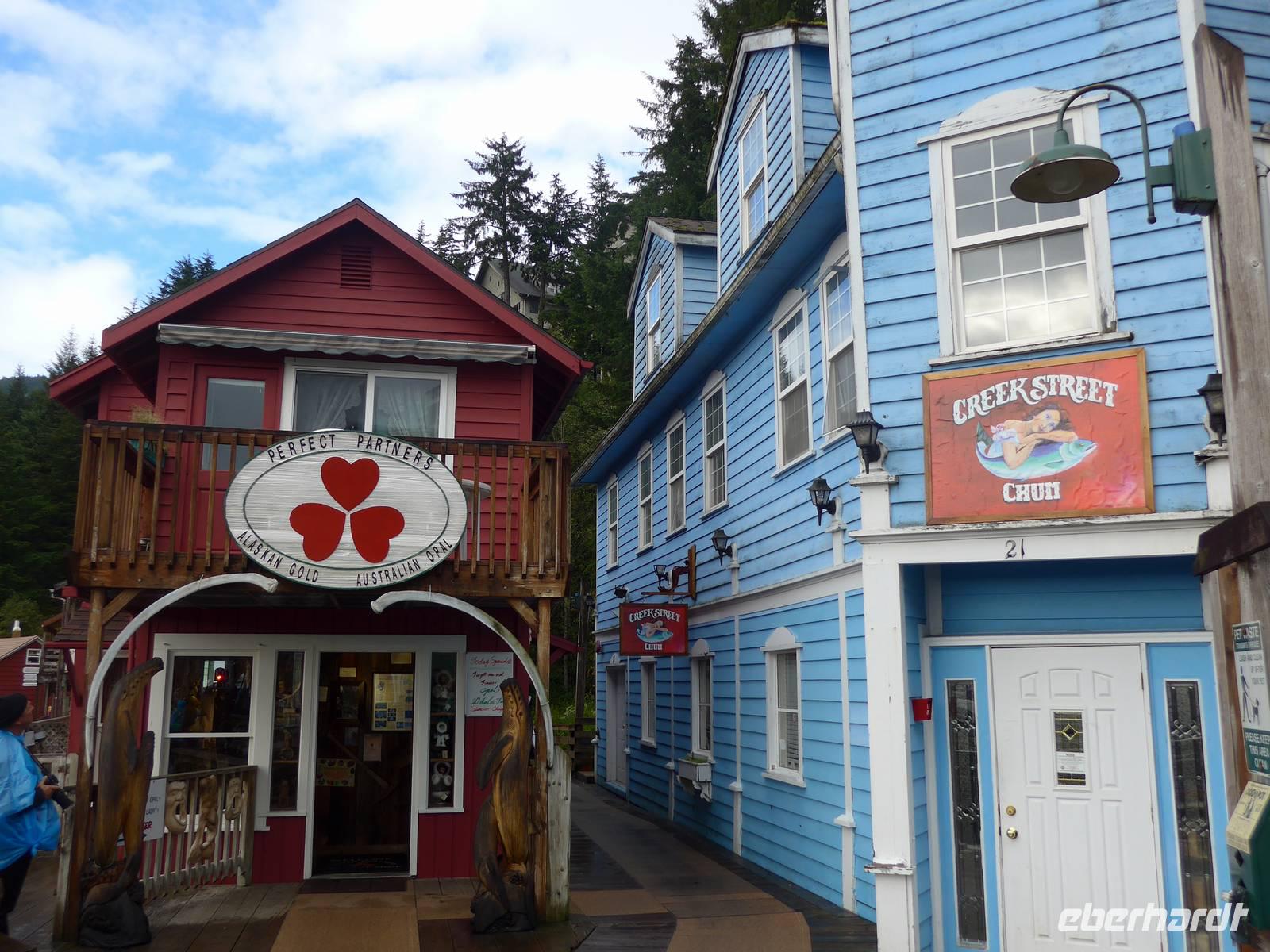 Wir wurden vom kleinen Städtchen Ketchikan, das sich als „Hauptstadt der Lachse" bezeichnet, begrüßt. Da sich dieser Ort auch als der Ort mit der größten Totempfahlsammlung brüstet, sind waren wir auf den Landgang sehr gespannt. Schon vom Schiff aus haben wir eine bunte Stadt wahrgenommen. Schnell von Bord!