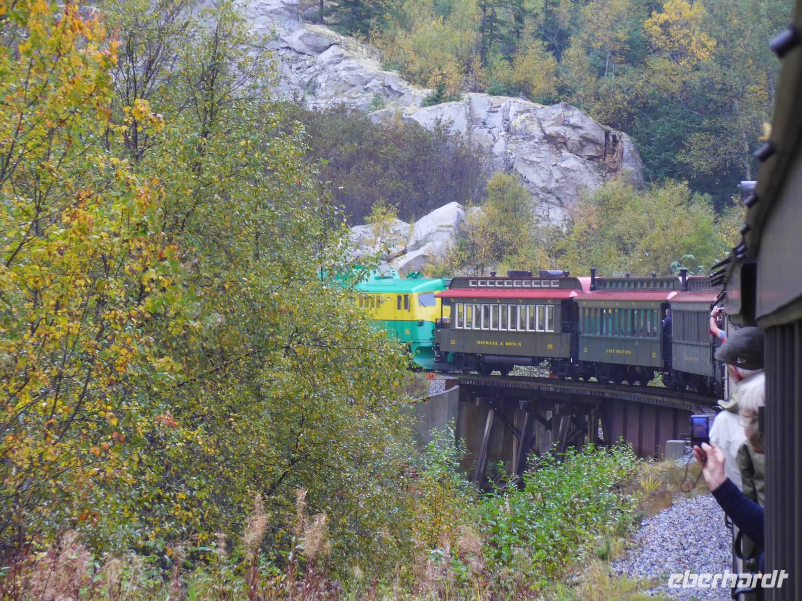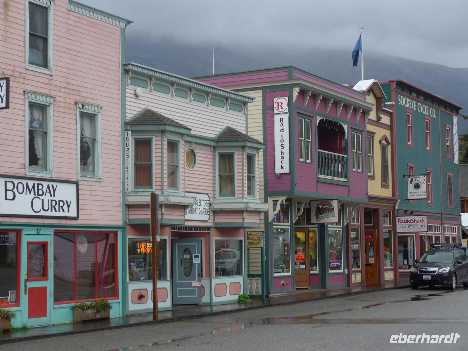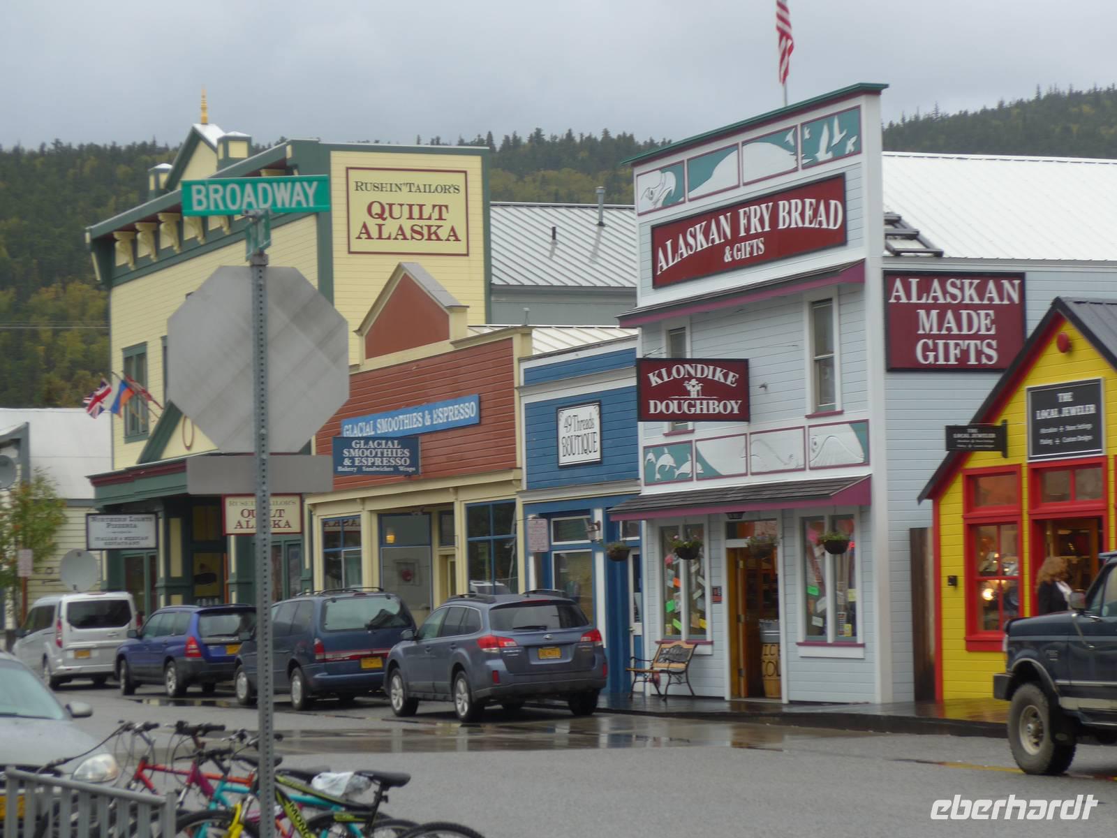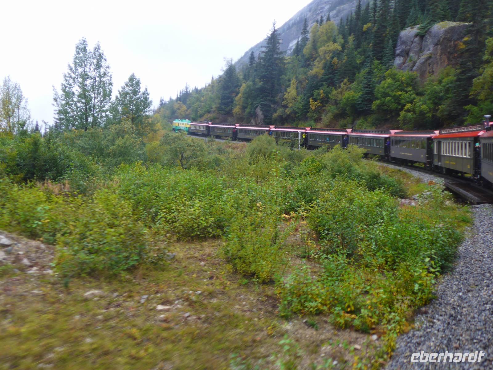 Am Morgen läuft die Norwegian Sun in Skagway ein. Mit dem Fund von Gold in einem Fluss bei Skagway entstand der regelrechte Goldrausch im Yukon-Gebiet und in Alaska.Tausende Männer machten sich von dort aus aus auf, um weiter zum Lake Bennett u. schließlich ins Yukon Territorium zu kommen. Ein beschwerlicher Weg lag bei Frost u. Schnee sowie schwerem Gepäck vor ihnen. Glück und Reichtum wollten sie finden. Viele mussten aber auch mit ihrem Leben bezahlen. Einst hatte die nördlichste Hafenstadt der Insiderpassage 20.000 Einwohner. Heute leben nur noch ca. 1000 hier. Und dennoch - auch heute lebt man vereinzelt vom Goldabbau. Der Tourismus wurde aber der heutige „Goldrausch" der Region. Zahlreich sind die Kreuzfahrtschiffe, die auf ihrer Route hier anlegen. Wir gingen von Bord und bei einem Spaziergang auf dem „Broadway" mit seiner alten Häuserfronten und Saloons fühlte man sich schnell in die Zeit des Goldrausches zurückversetzt. Mittags stand Eisenbahnromantik auf dem Programm. Zug- u. Eisenbahnliebhaber kamen heute auf ihre Kosten. Mit der „White Pass & Yukon-Eisenbahn", die zur Zeit der Klondike Goldrausches von 35.000 Arbeitern in Windeseile erbaut wurde, ist eine der wenigen noch in den USA erhaltenen Schmalspurbahn. Wir verließen den Bahnhof und langsam kriechend geht es in 873 Meter Höhe zum White Pass. Langsam zuckelt der Zug nach oben, vorbei an gewaltigen Schluchten, klapprigen Holzbrücken, schmalen und dunklen Tunnels sowie Bergen und Wasserfällen. Bis zu unserem Ziel passierten wir zahlreiche interessante Orte, u. a. den Goldrauschfriedhof mit dem Grab des legendären Skaway-Gauner Soapy Smith. Rechts thront die Küstenberglandschaft mit Tongas-Nationalwald und hin und wieder entdeckt man noch einen der einstigen Pfade. Nicht umsonst wird diese Strecke auch eine der schönsten Panoramazugstrecken der Welt genannt. Nach unzähligen Fotoklicks und manchmal Steigungen mit zu 3,5% erreichten wir den White-Pass. Einmal die Lokomotive umgedreht und zurück geht es dann nach Skagway. Am Abend zurück an Bord erwartet uns wieder ein köstliches Abendessen.