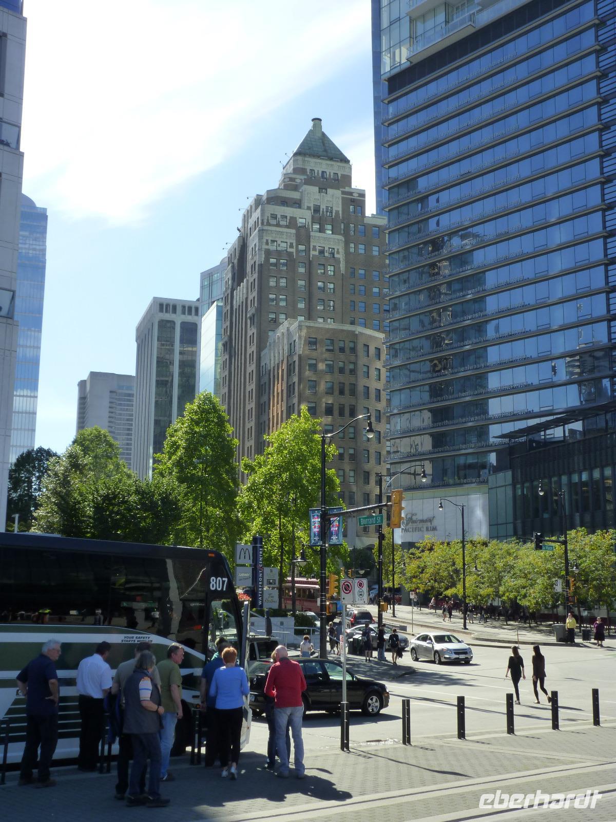 Nachdem wir unser Frühstück diesmal außerhalb des Hotels eingenommen haben, fuhren wir pünktlich weiter in das von Whistler ca. 120 km entfernte Vancouver. Bei Squamish unternahmen wir dann noch einen kleinen Spaziergang zu dem gleichnamigen Wasserfall. In Vancouver angekommen, erreichten wir nach Überqueren der Lions Gate Bridge den Stanley Park, wo wir schöne Aufnahmen u.a. von Vancouver und den Totempfählen (Totem Poles) machen konnten. Vorbei am Rosengarten, der falschen Bucht (False Creek) und über die Burrard St. Bridge erreichten wir Granville Island mit seinem großen Markt und den vielen Kunstgeschäften. Hier nutzten alle Gäste die Zeit, um individuell die Mittagspause zu verbringen. Weiter ging es Richtung Chinatown und einem kleinen Spaziergang zur Dampfuhr und dem Canada Place mit dem alten Bahnhof und der Ablegestelle für die Kreuzfahrtschiffe. Heute waren wir sehr zeitig im Hotel und daher nutzten alle Gäste die bis zum Abendessen zur Verfügung stehende Zeit für individuelle Spaziergänge im Zentrum der Stadt. Zuvor verabschiedeten wir uns von Roy, unserem Busfahrer, der uns von Calgary bis Vancouver immer sicher durch Kanada chauffiert hat. Unser Abendessen nahmen wir dann wieder außerhalb des Hotels ein.