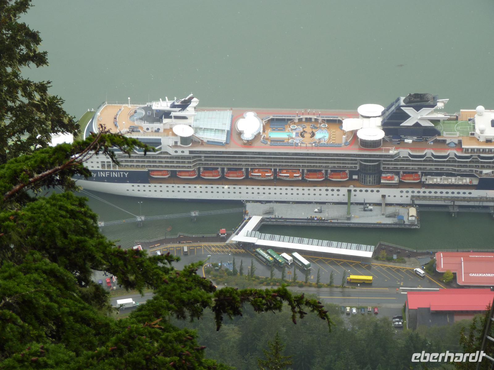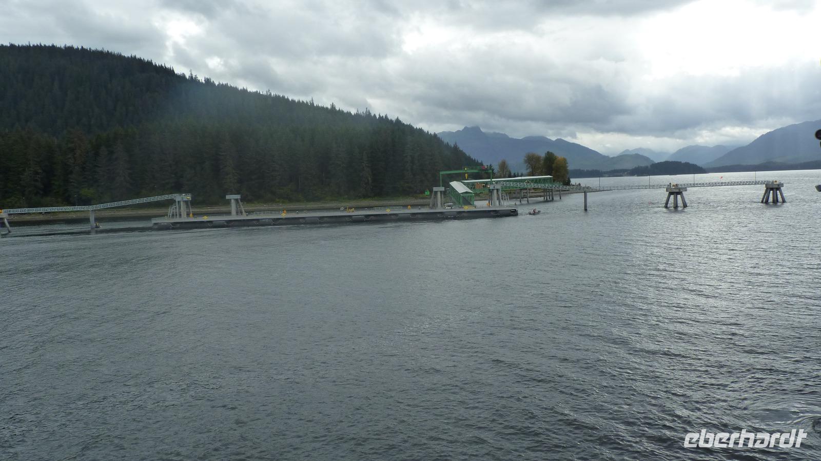 Wir erreichen am Morgen Juneau, die Hauptstadt Alaskas. Leider ist der Wettergott heute nicht auf unserer Seite und es wird den ganzen Tag regnen. Wir lassen uns davon aber nicht groß stören, gehen von Bord und werden schon von Luke, unserem Busfahrer erwartet. Als erstes fahren wir entlang der Küste zum Mendenhall Gletscher, der sich im Gegensatz zu vielen anderen Gletschern in Alaska nur sehr langsam zurückzieht. Trotz des schlechten Wetters können wir schöne Fotos machen und uns anschließend im Besucherzentrum über den Gletscher und das Leben im Tongass National Forest zu informieren. Als nächstes besuchten wir eine Lachsaufzuchtstation, wo wir über die Arbeit der Lachsaufzucht informiert wurden, das Gewimmel von ca. 1 Million kleiner Lachse und im Besucherzentrum in mehreren Aquarien die Meeresbewohner der Region beobachten konnten. Anschließend nutzten alle Gäste noch die direkt am Hafen befindliche Seilbahn, um auf den Mount Roberts zu fahren und dort einen kleinen Spaziergang zu machen oder einfach nur einen Blick von oben auf den Hafen mit unserem Schiff zu machen. Anschließend konnte jeder Gast noch individuell die Zeit zu einer Shoppingtour in Juneau nutzen. Gegen 19:30 Uhr verließ dann unser Schiff Alaskas Hauptstadt.