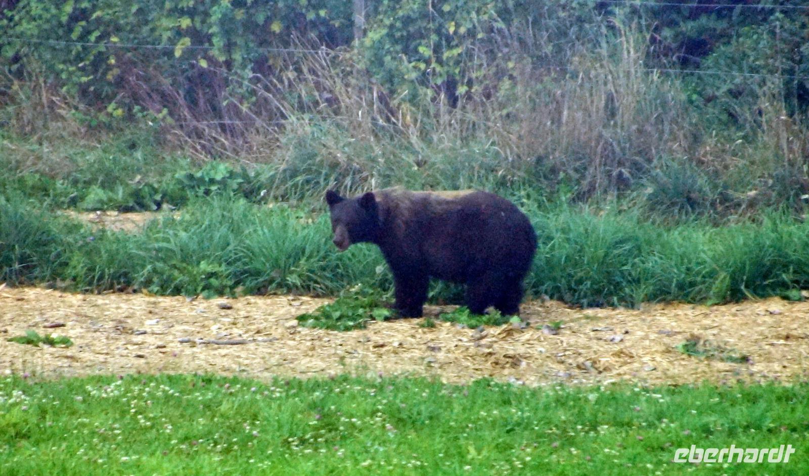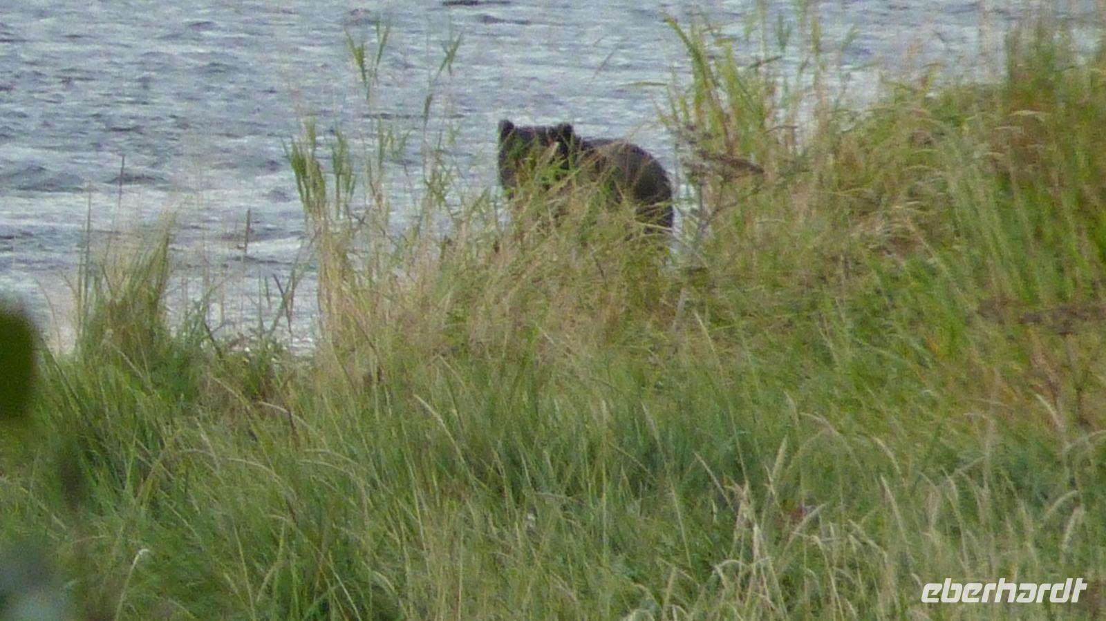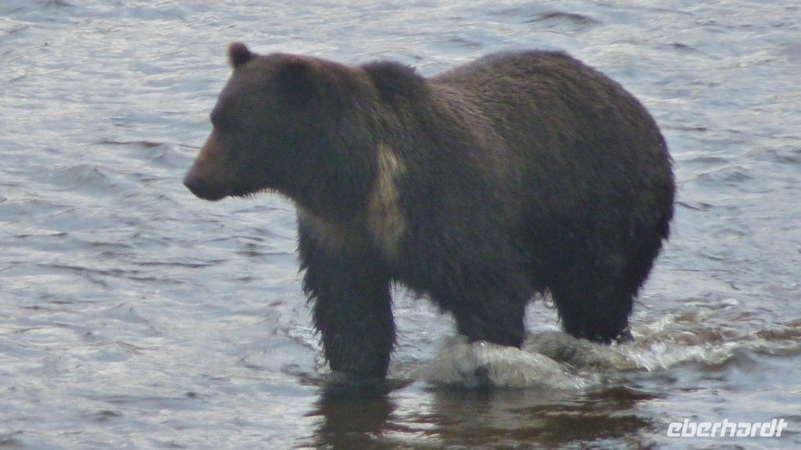 Heute sollten wir unsere ersten Ausflüge in Alaska haben. Wir erreichen gegen 13:30 Uhr Icy Strait Point und viele Gäste beobachten von verschiedenen Decks aus das Anlegen des Schiffes. Ab 14:00 Uhr beginnen dann die verschiedenen Ausflüge. Ich begleite die Gruppe, welche auf Bärensuche gehen will. Kaum haben wir mit unserem Bus den Ort verlassen, steht mitten auf der Straße ein großer Schwarzbär, der sich dann angesichts des großen Buses doch entscheidet, im Gebüsch zu verschwinden. Wir fahren weiter zu unseren Aussichtspunkten, wo es lt. Unserem Guide eine mindestens 50%ige Chance geben soll. Und tatsächlich, nach einigen Minuten des Wartens entdecke ich am Ufer des Flusses etwas Dunkles. Ist das ein Bär? Ja, tatsächlich kommt da in aller Ruhe, immer wieder einen Lachs verspeisender Schwarzbär auf uns zu. Die Fotoapparate kommen nicht mehr zur Ruhe, aber es sollte noch besser kommen. Der Bär ließ sich durch uns überhaupt nicht stören und lief unmittelbar vor uns in 50-60 Meter Entfernung an uns vorbei, so dass wir schönste Aufnahmen von ihm machen konnten. Was für ein tolles Erlebnis! Glücklich und zufrieden mit dem gerade Gesehenen kehrten wir auf unser Schiff zurück und trafen uns mit den anderen Gästen wieder beim gemeinsamen Abendessen, um sich dort auch über das Erlebte des heutigen Tages auszutauschen.