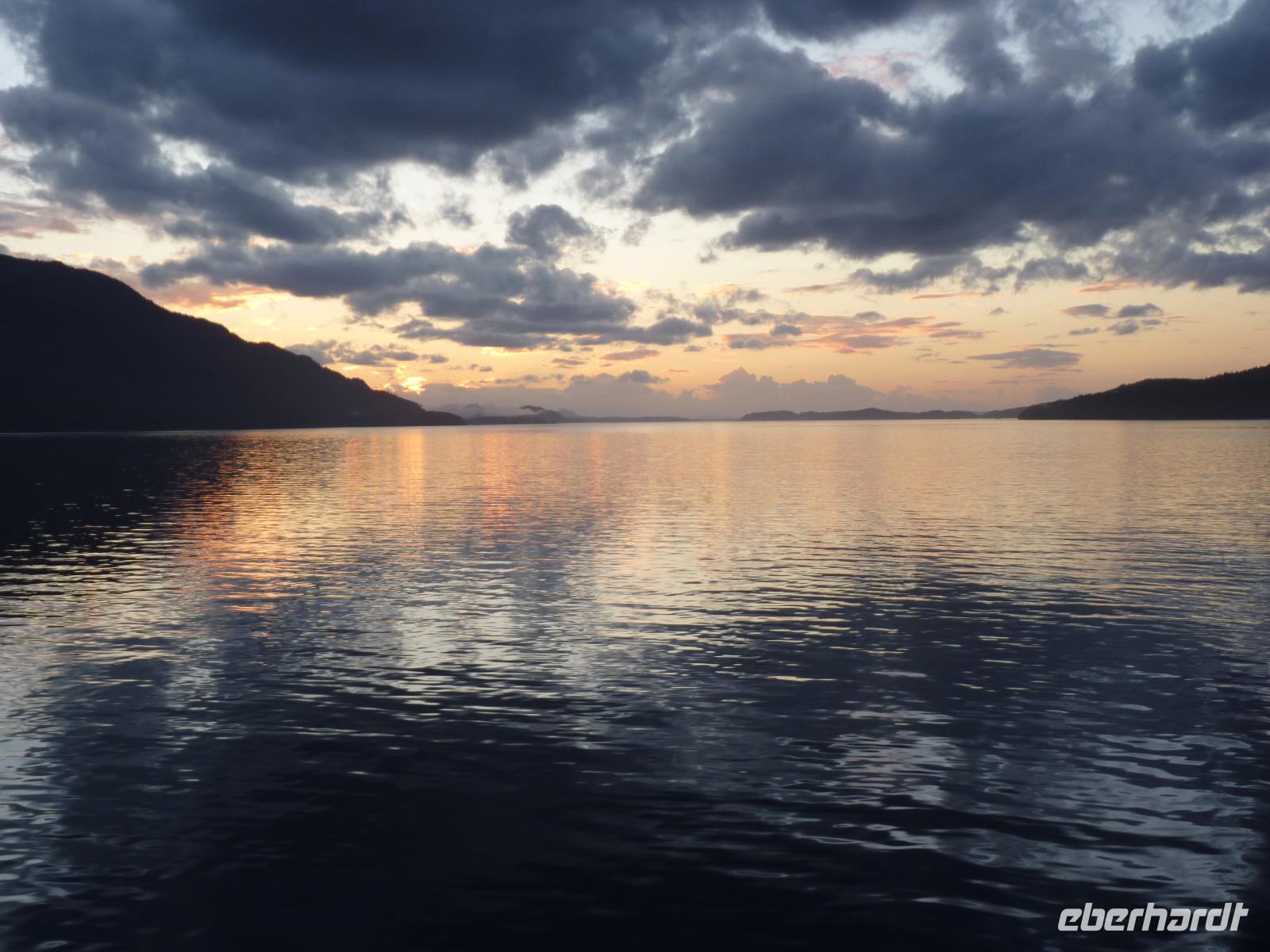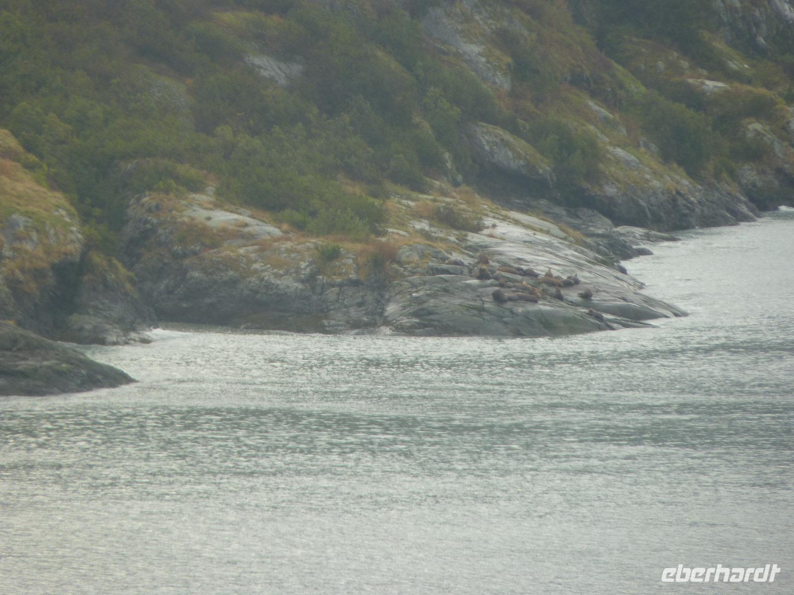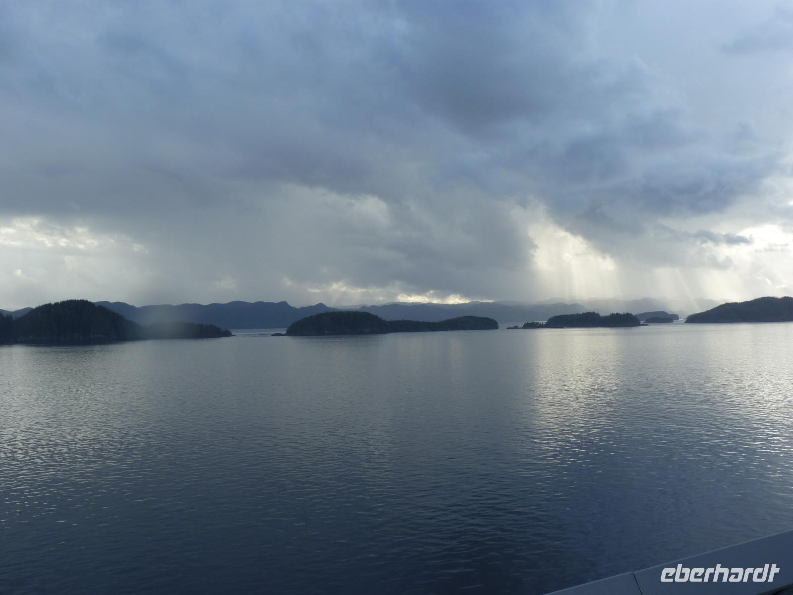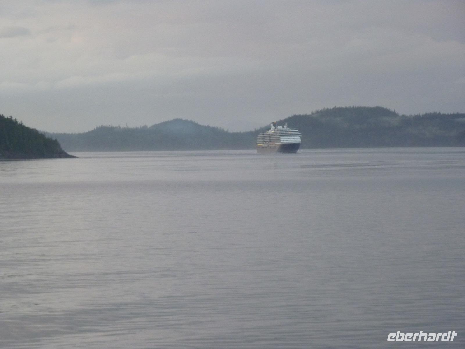 Erstmals während unserer Reise galt es, die Uhren um eine Stunde vorzustellen, so dass wir diesmal eine kürzere Nacht haben sollten. Während des Frühstücks waren erstmals einige Delphine zu beobachten, die unser Schiff eine Zeitlang begleiteten. Gegen 16:00 Uhr fahren wir dann in die Inside Passage ein, welche sicher die schönste Schiffsroute auf unserer 7-tägigen Kreuzfahrt darstellt. Vergleichbar mit der norwegischen Fjordlandschaft ist die Inside Passage durch viele kleine Inseln gekennzeichnet, dies teilweise sehr dicht zusammenliegen und dadurch recht nah an unser Schiff heranreichen. Auch hier sind etliche Delphine und Orca-Wale zu beobachten.