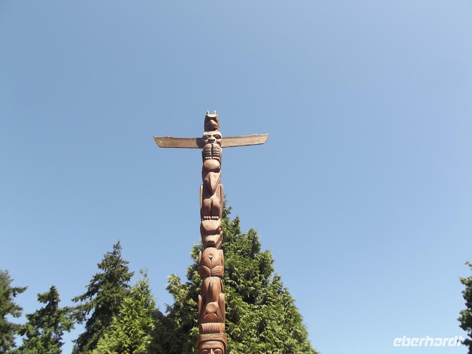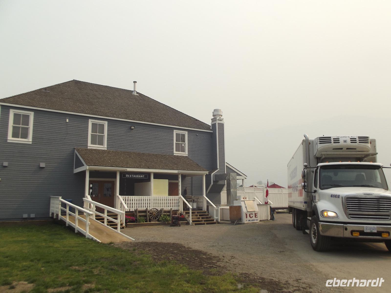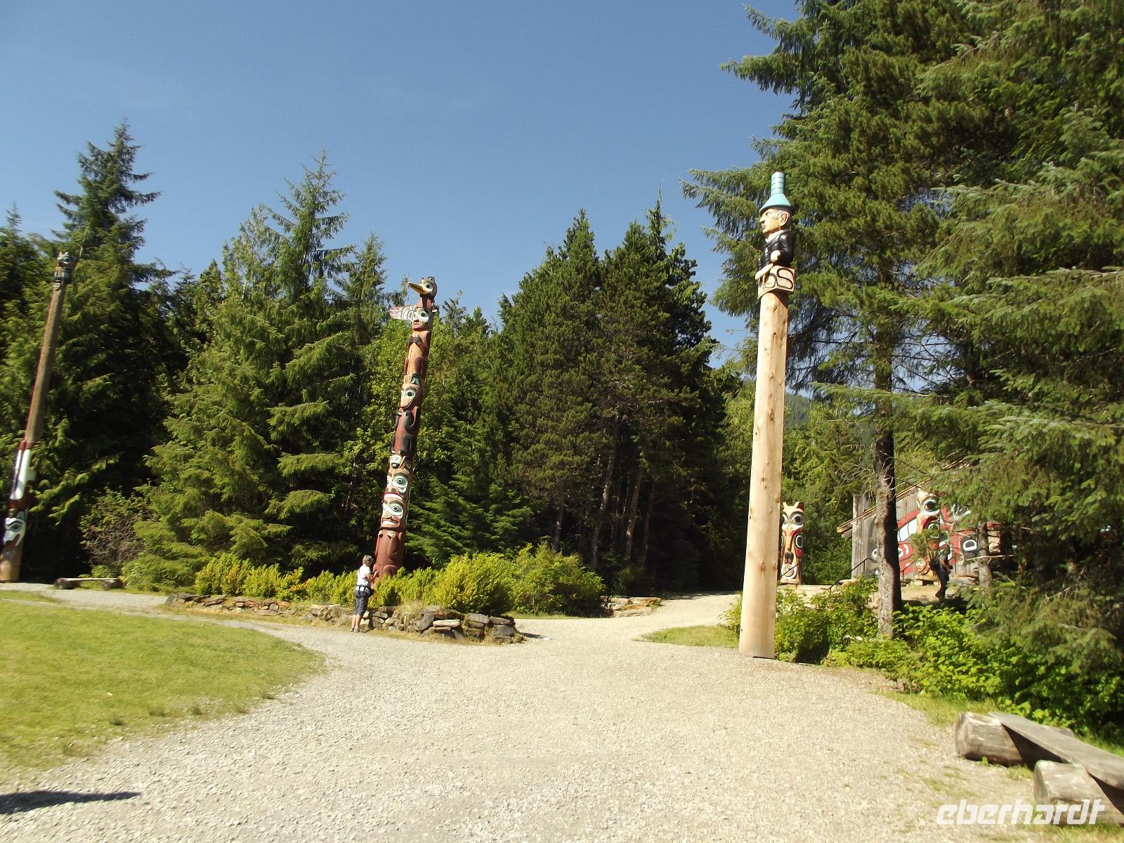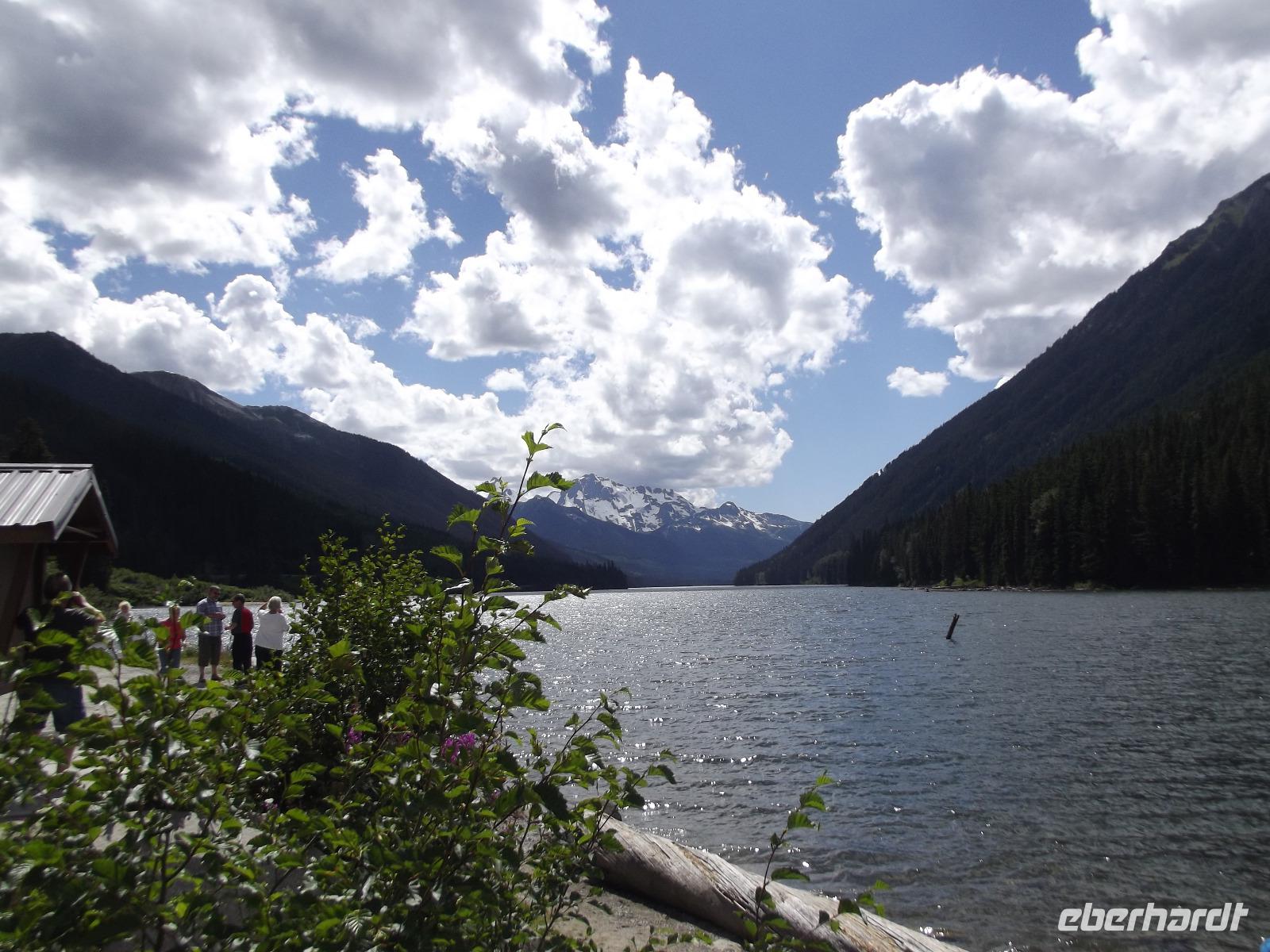 Um halb 8 treffen wir uns zum gemeinsamen Frühstück und müssen leider danach schon wieder abreisen. Der Hund der Hotelbesitzer verabschiedet uns persönlich und läuft eine Runde durch den Bus. Wir starten den Motor und schon geht es los, vorbei an Salbeisträuchern und fruchtbarem Kalkstein. Noch immer ist die Luft sehr rauchig und wir stellen die Klimaanlage aus, um den Geruch zu mindern. Unser Ziel ist die historische Hat Creek Ranch, westlich von Kamloops. Hierfür überqueren wir den Kamloops River und fahren durch das Örtchen Cache Creek. An der Hat Creek Ranch werden wir schon von einer Indianerin und einer Dame im traditionellen Kleid begrüßt und hinter das Haus gebracht, wo unsere Führung über das Gelände beginnt. Der Rundgang beginnt im Wohngebäude, welches einst dem Fellhändler Donald Mc Lean gehörte. Die Ranch wurde teils Ende des 19. Jahrhunderts, teils am Anfang des 20. Jahrhundert gebaut. Donald Mc Lean verhandelte damals mit den Indianern, wurde aber leider erschossen. Seither wechselten die Besitzer der Ranch regelmäßig. In der Küche übersetzt uns die Reiseleiterin, dass der Küchenbereich ca. 1900 gebaut wurde und man zeigt uns, dass in der Küchenlampe noch eine Original-Edison-Glühbirne eingedreht ist. Nachdem wir einmal durch die Räumlichkeiten geschlendert sind, darf die Reisegruppe mit einer alten Kutsche zum Indianerdorf fahren, welches sich wenige Gehminuten vom Wohnhaus befindet. Wir besichtigen unter anderem ein Kekuli - ein Indianer-Wohnhaus in einen Hügel integriert. Um die Gruppe zu ehren, singt eine Indianerin ein traditionelles Volkslied und wir dürfen einen Saft der sogenannten Soapberry (=Seifenbäume) probieren. Am frühen Nachmittag müssen wir weiter und machen einen kleinen Fotostopp am Fraser River und fahren zwischen dem Kaskadengebirge und dem Küstengebirge hindurch. Noch ein Fotostopp am Duffy Lake und dann geht die Reise durch das Darcy Indianer Reservat. Schließlich erreichen wir das Skigebiet Whistler und nutzen unsere Freizeit, um die schöne Innenstadt zu erkunden. Der Name Whistler kommt von den Murmeltieren, die in den Bergen um die Ortschaft herum leben. So langsam knurren unsere Mägen und wir genießen unser Abendessen an diesem warmen Sommerabend.
