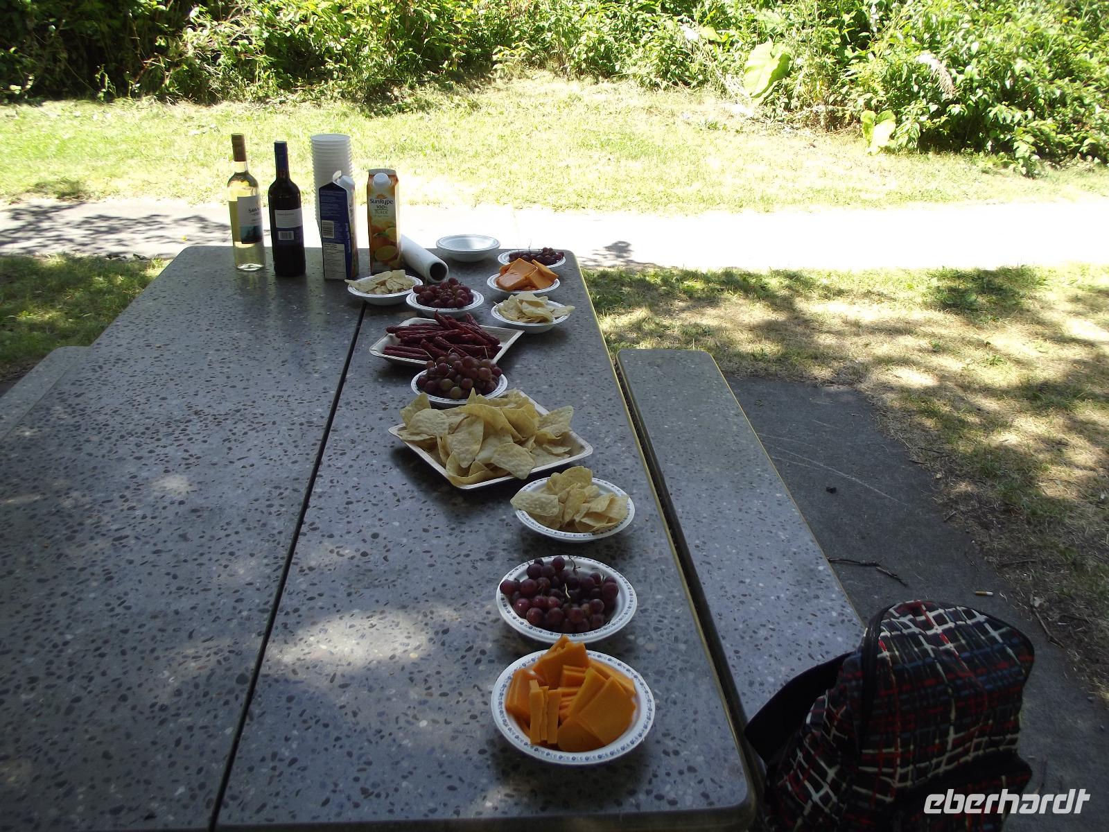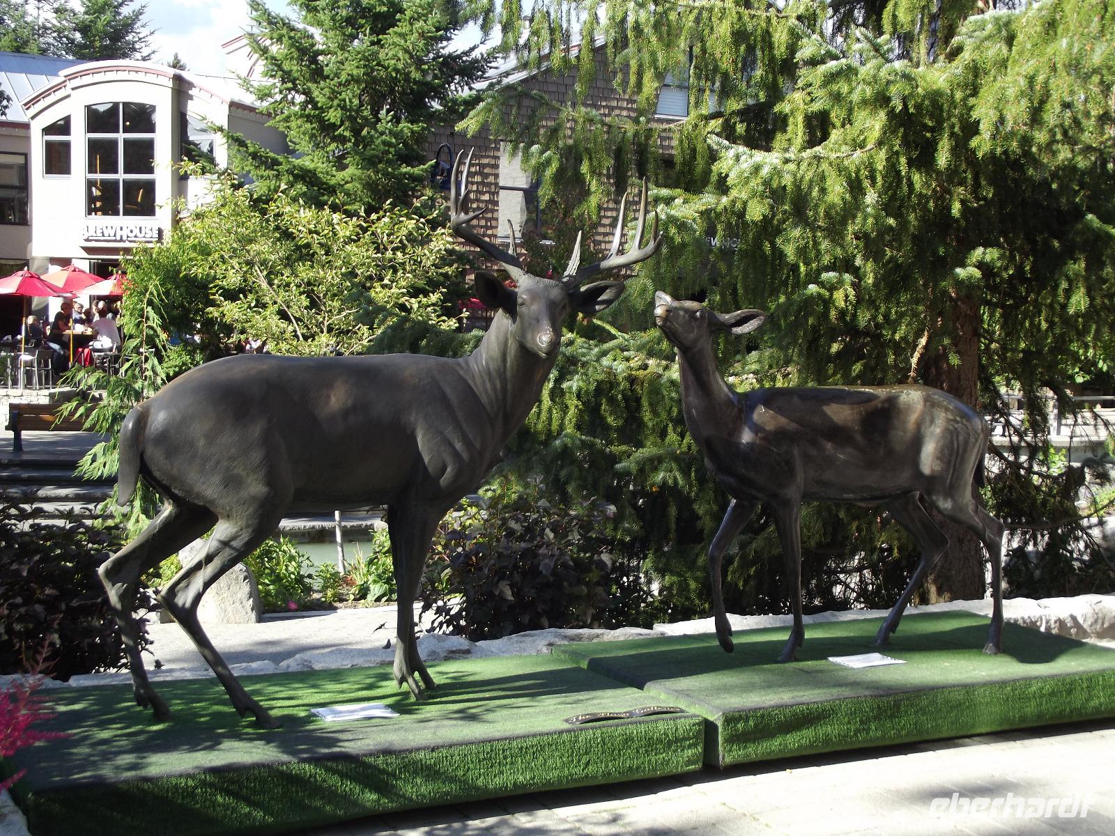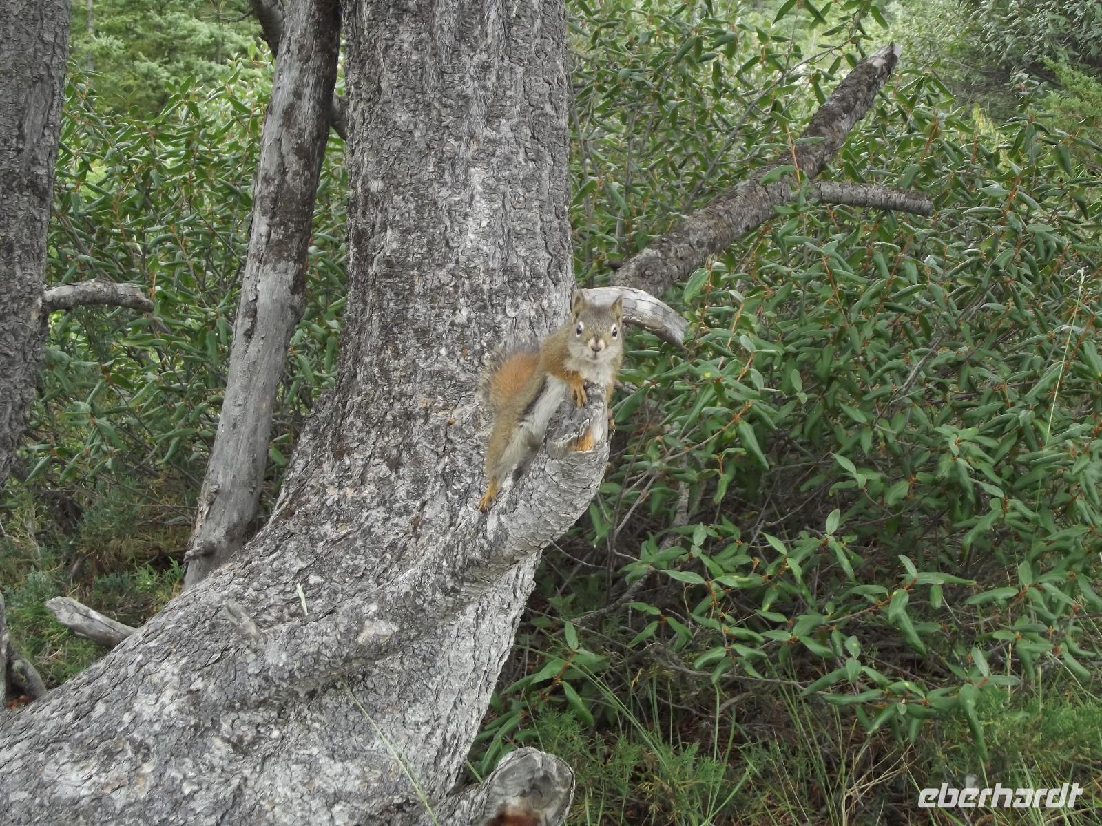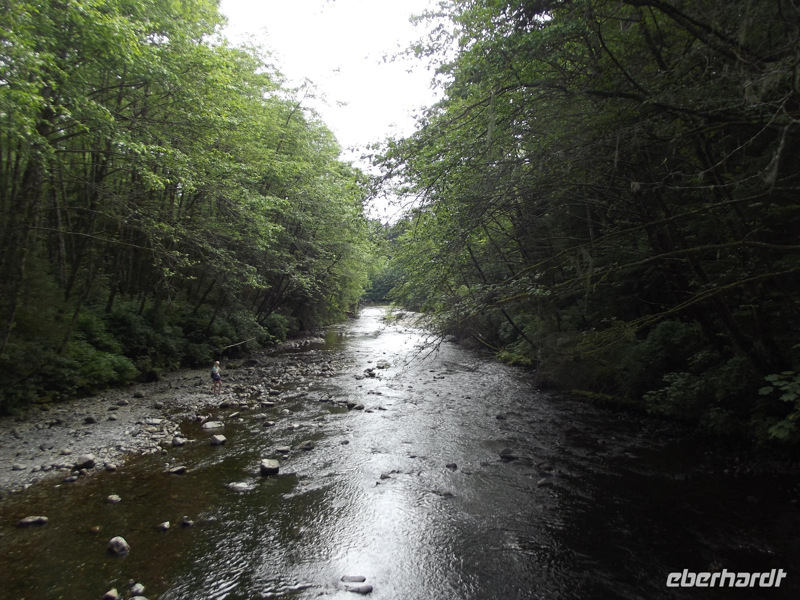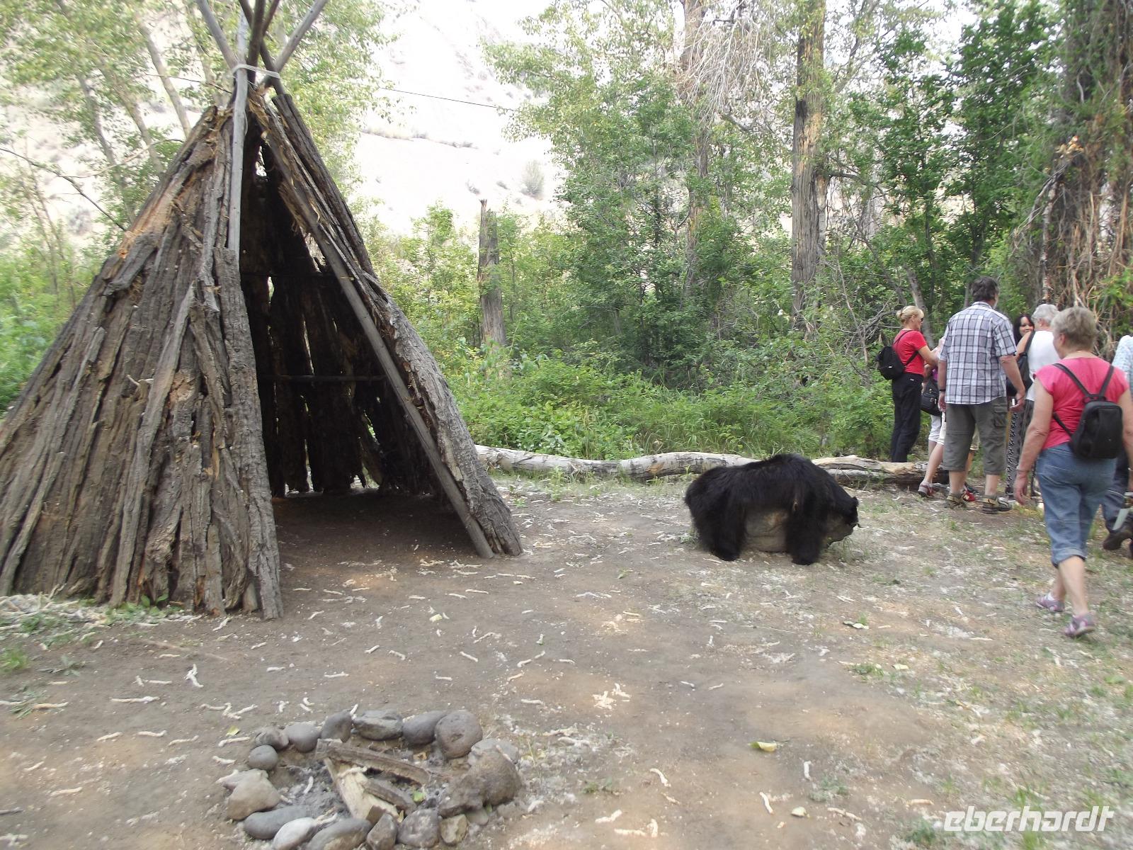 Um halb 8 treffen wir uns zum gemeinsamen Frühstück und müssen leider danach schon wieder abreisen. Der Hund der Hotelbesitzer verabschiedet uns persönlich und läuft eine Runde durch den Bus. Wir starten den Motor und schon geht es los, vorbei an Salbeisträuchern und fruchtbarem Kalkstein. Noch immer ist die Luft sehr rauchig und wir stellen die Klimaanlage aus, um den Geruch zu mindern. Unser Ziel ist die historische Hat Creek Ranch, westlich von Kamloops. Hierfür überqueren wir den Kamloops River und fahren durch das Örtchen Cache Creek. An der Hat Creek Ranch werden wir schon von einer Indianerin und einer Dame im traditionellen Kleid begrüßt und hinter das Haus gebracht, wo unsere Führung über das Gelände beginnt. Der Rundgang beginnt im Wohngebäude, welches einst dem Fellhändler Donald Mc Lean gehörte. Die Ranch wurde teils Ende des 19. Jahrhunderts, teils am Anfang des 20. Jahrhundert gebaut. Donald Mc Lean verhandelte damals mit den Indianern, wurde aber leider erschossen. Seither wechselten die Besitzer der Ranch regelmäßig. In der Küche übersetzt uns die Reiseleiterin, dass der Küchenbereich ca. 1900 gebaut wurde und man zeigt uns, dass in der Küchenlampe noch eine Original-Edison-Glühbirne eingedreht ist. Nachdem wir einmal durch die Räumlichkeiten geschlendert sind, darf die Reisegruppe mit einer alten Kutsche zum Indianerdorf fahren, welches sich wenige Gehminuten vom Wohnhaus befindet. Wir besichtigen unter anderem ein Kekuli - ein Indianer-Wohnhaus in einen Hügel integriert. Um die Gruppe zu ehren, singt eine Indianerin ein traditionelles Volkslied und wir dürfen einen Saft der sogenannten Soapberry (=Seifenbäume) probieren. Am frühen Nachmittag müssen wir weiter und machen einen kleinen Fotostopp am Fraser River und fahren zwischen dem Kaskadengebirge und dem Küstengebirge hindurch. Noch ein Fotostopp am Duffy Lake und dann geht die Reise durch das Darcy Indianer Reservat. Schließlich erreichen wir das Skigebiet Whistler und nutzen unsere Freizeit, um die schöne Innenstadt zu erkunden. Der Name Whistler kommt von den Murmeltieren, die in den Bergen um die Ortschaft herum leben. So langsam knurren unsere Mägen und wir genießen unser Abendessen an diesem warmen Sommerabend.