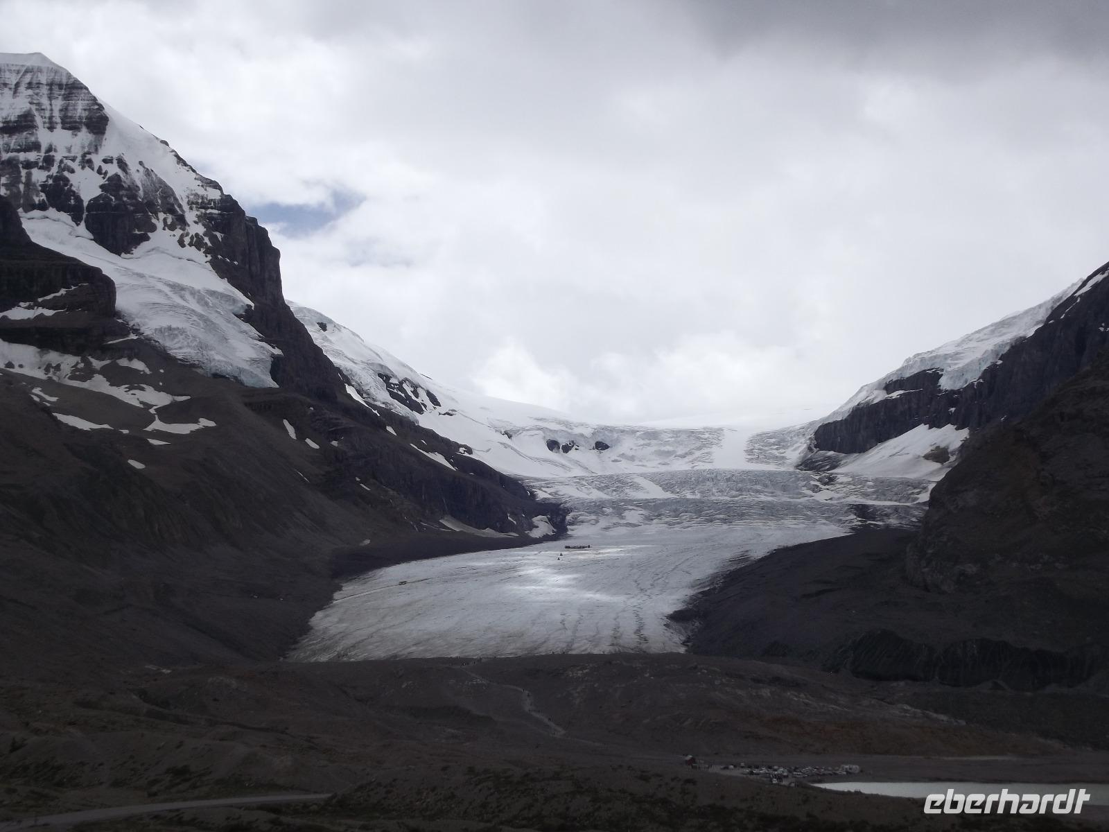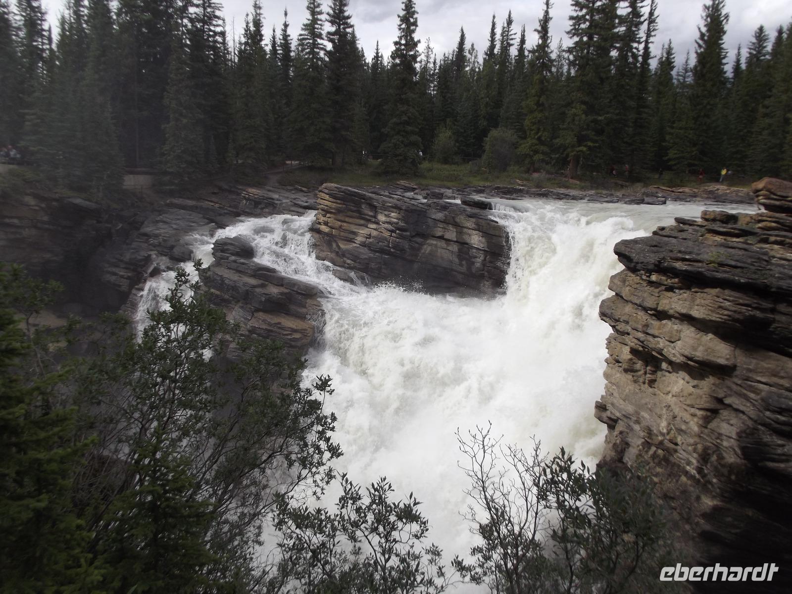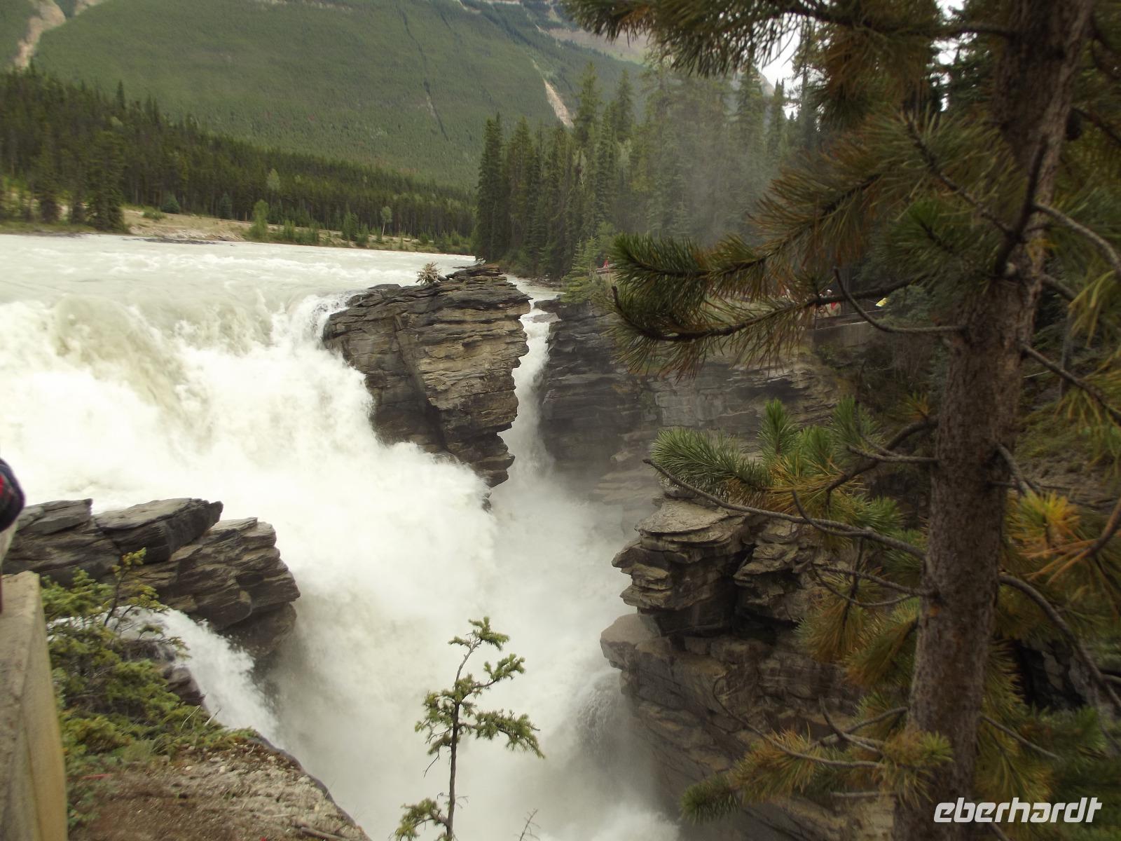 Unser nächster Tagesprogrammpunkt ist der Lake Louise: ein See, der durch das türkisblaue Wasser und die umrahmende Bergwelt weltweit bekannt ist. Uns bietet sich ein perfektes Bild, wie von einer Postkarte. Das luxuriöse Hotel Fairmont Chateau Lake Louise ist ein kleiner Wink der Zivilisation inmitten dieses Naturspektakels. Einige Gäste machen einen ausgiebigen Spaziergang, andere begutachten die Filmkulisse von Dr. Schiwago. Gegen Mittag setzen wir unsere Fahrt fort, passieren den Crowfoot Glacier (Krähenfuss-Gletscher) und halten am wunderschönen Bow Lake, um Fotos zu machen. Kurze Zeit später gelangen wir zum Peyto Lake, benannt nach Bill Peyto, einem bekannten Bergführer Ende des 19. Jahrhunderts. Nachdem wir auch dort Fotomaterial gesammelt haben, steht nun das Tageshighlight bevor. Marvin, unser netter Fahrer, fährt uns über den Icefield Parkway, eine wunderbare Fernstraße durch die kanadischen Rockies, aber unser Ziel ist der Athabasca Gletscher. Nach einer kurzen Mittagspause setzen wir uns, eingepackt in Schals und Handschuhe, in die gigantischen Schneemobile. Es geht rauf und runter und nach etwa einer halben Stunde Fahrt sind wir auf dem Gletscher angekommen. Um uns herum präsentieren sich mehrere Gletscher in voller Schönheit und die Sonne lässt das Eis in sanftem Blau leuchten. Mit den Schneemobilen geht es zurück zum Icefield Centre und gegen halb 5 verlassen wir den Banff Nationalpark und erreichen den Jasper Nationalpark. Unsere Reiseleiterin Marion hat uns schon einige Merkmale von Braun- und Schwarzbären erläutert - und nun passierte es: ein Schwarzbär am Straßenrand, unweit von unserem Reisebus. Er wandte uns leider hauptsächlich das Hinterteil zu, aber die Reisegruppe war dennoch glücklich. Und die Glückssträhne setzte sich fort, denn kurz darauf entdeckten wir eine Bergziegenfamilie. Was für ein Tag! Bevor wir unser Hotel für die nächsten zwei Nächte anfuhren, machten wir Halt an den Athabasca Wasserfällen. Der reißende und brausende Wasserfall ergab ein wunderschönes Bild und auch die Felsformationen waren sehr außergewöhnlich.