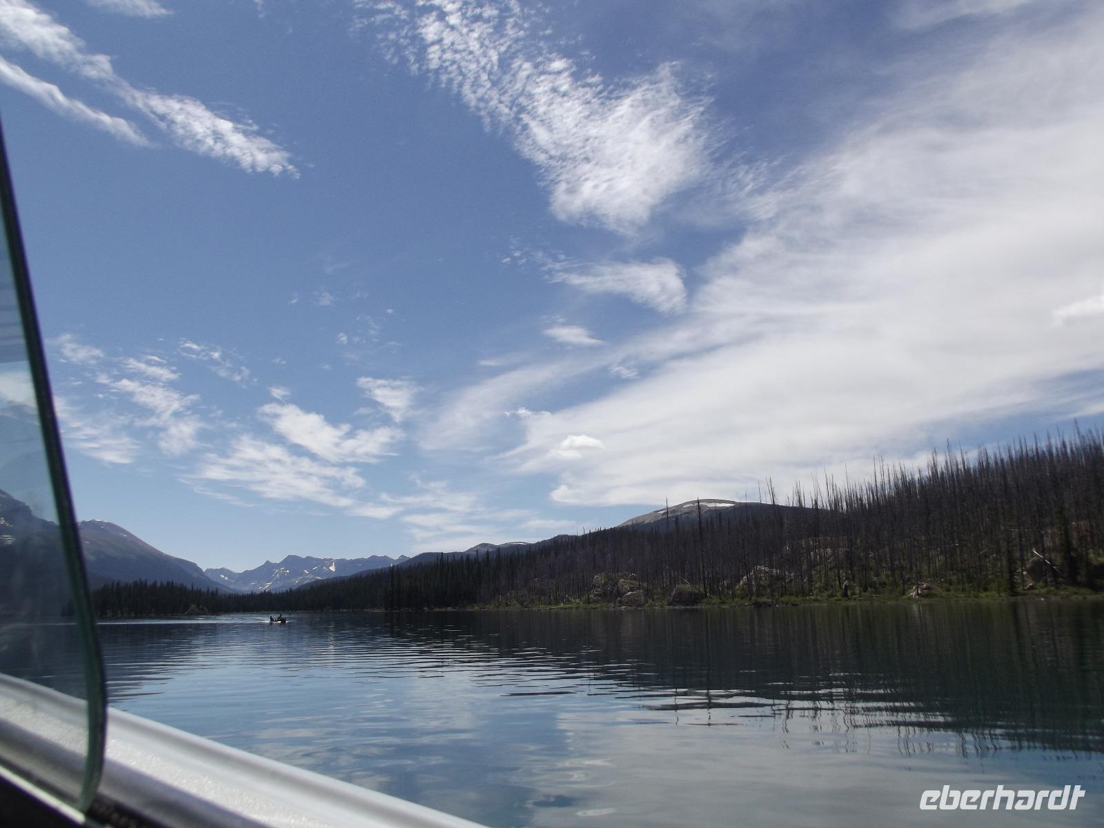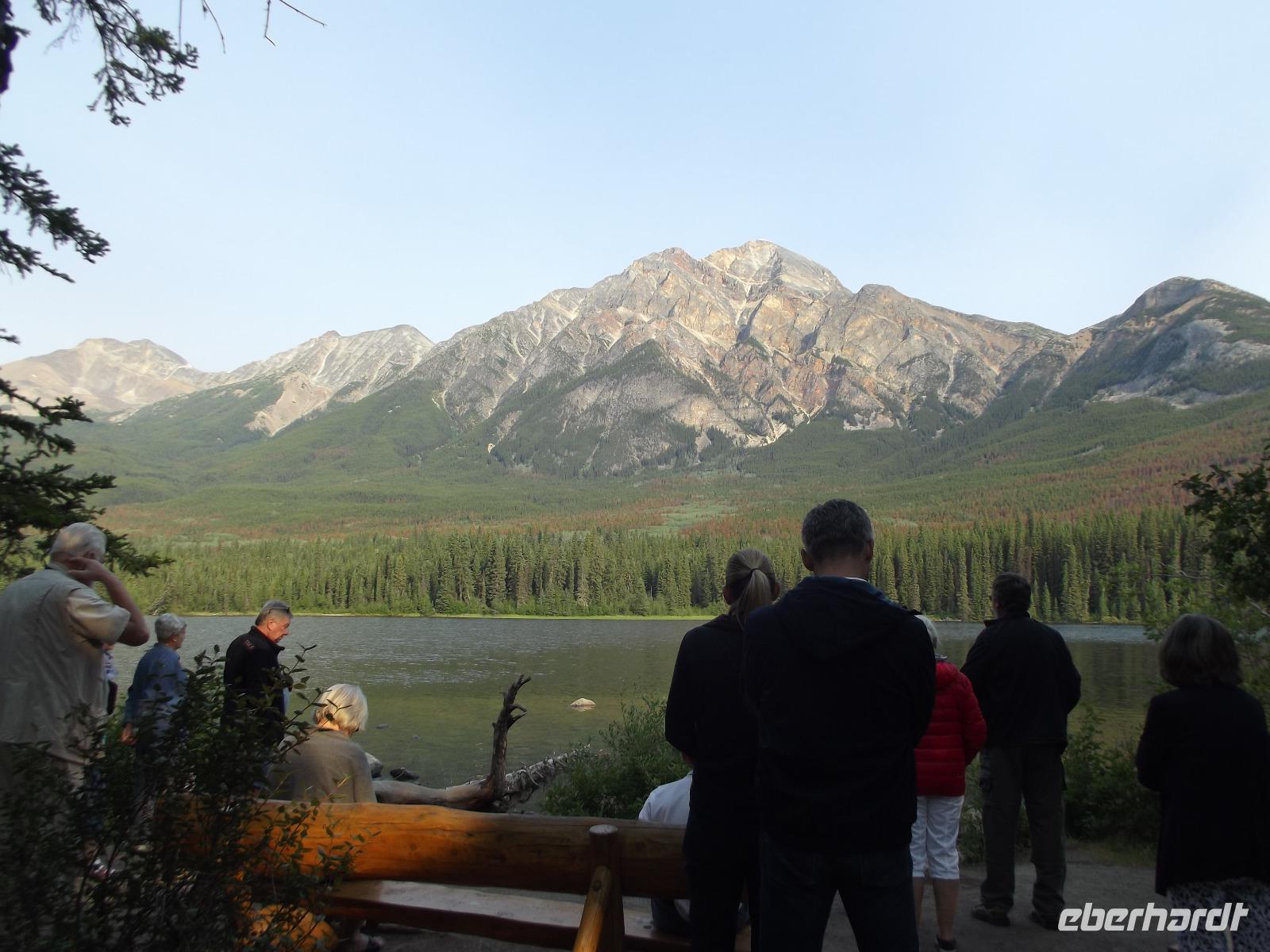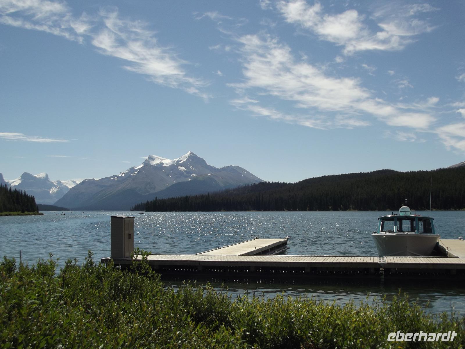 Pünktlich zu Mittag findet sich die Reisegruppe beim Maligne Lake ein, denn wir wollen alle zusammen eine schöne Bootsfahrt unternehmen. Der See, so sagt man, wurde von einer Frau namens Mary Schaffer Anfang des 20. Jahrhunderts entdeckt mittels einer Lageskizze des Indianers Samson Beaver. Zurück in der Gegenwart umschippern wir die legendäre Insel „Spirit Island" - ein spiritueller Ort der Indianer, der der Legende nach ein heimlicher Treffpunkt eines Liebespaares aus verfeindeten Indianerstämmen war. Wir genießen die Szenerie für ein paar Minuten, dann geht es zurück auf das Festland. Zurück in Jasper haben wir Freizeit und die Gruppe entscheidet sich fürs Bummeln, Eisessen und einkaufen. Vom Wandern und von der Bootsfahrt haben wir mächtig Hunger bekommen und lassen den Abend im Restaurant mit einem Wein oder einem Bier gemütlich ausklingen.