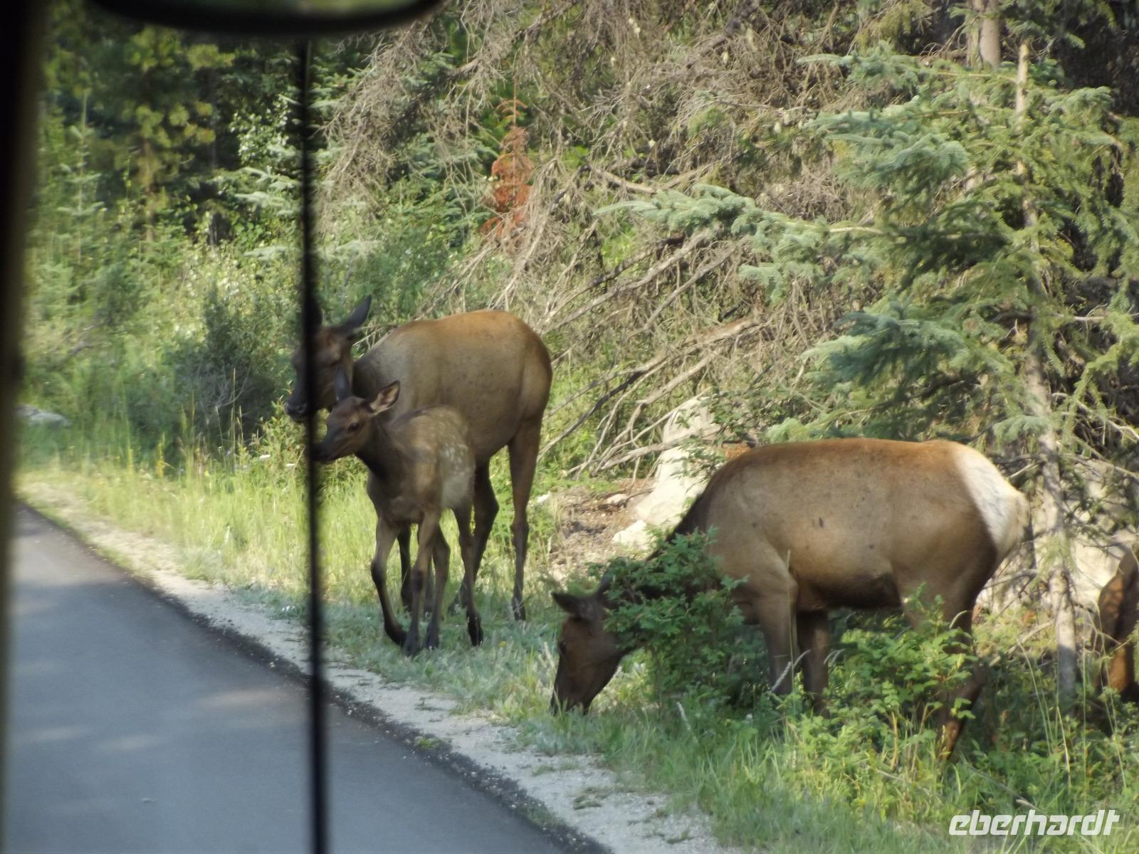 Neuer Tag, neues Frühstück: und was für eins! Das Frühstücksbuffet ist sehr lecker, sowie umfangreich, und wir sammeln Kraft für das heutige Programm. Unser erster Weg an diesem Morgen führt uns in die Innenstadt von Jasper, wo wir unseren neuen Fahrer Bill abholen. Daraufhin fahren wir auf der Maligne Lake Road zum Maligne Trail und machen eine schöne einstündige Wanderung über Wurzeln und Waldboden, parallel zu Wasserfällen und kleinen Bächen. Nun haben wir die letzte Müdigkeit vertrieben und sind hellwach, um zum Medicine Lake zu fahren, wo uns ein Weißkopfseeadler-Nest erwartet. Marion erzählt uns, dass es um den See herum einst ein großes Feuer gegeben hat, wodurch sehr viele Bäume betroffen waren. Die Natur aber heilt sich selbst und sorgt dafür, dass die Vegetation innerhalb von vielen Jahren wieder nachwächst.