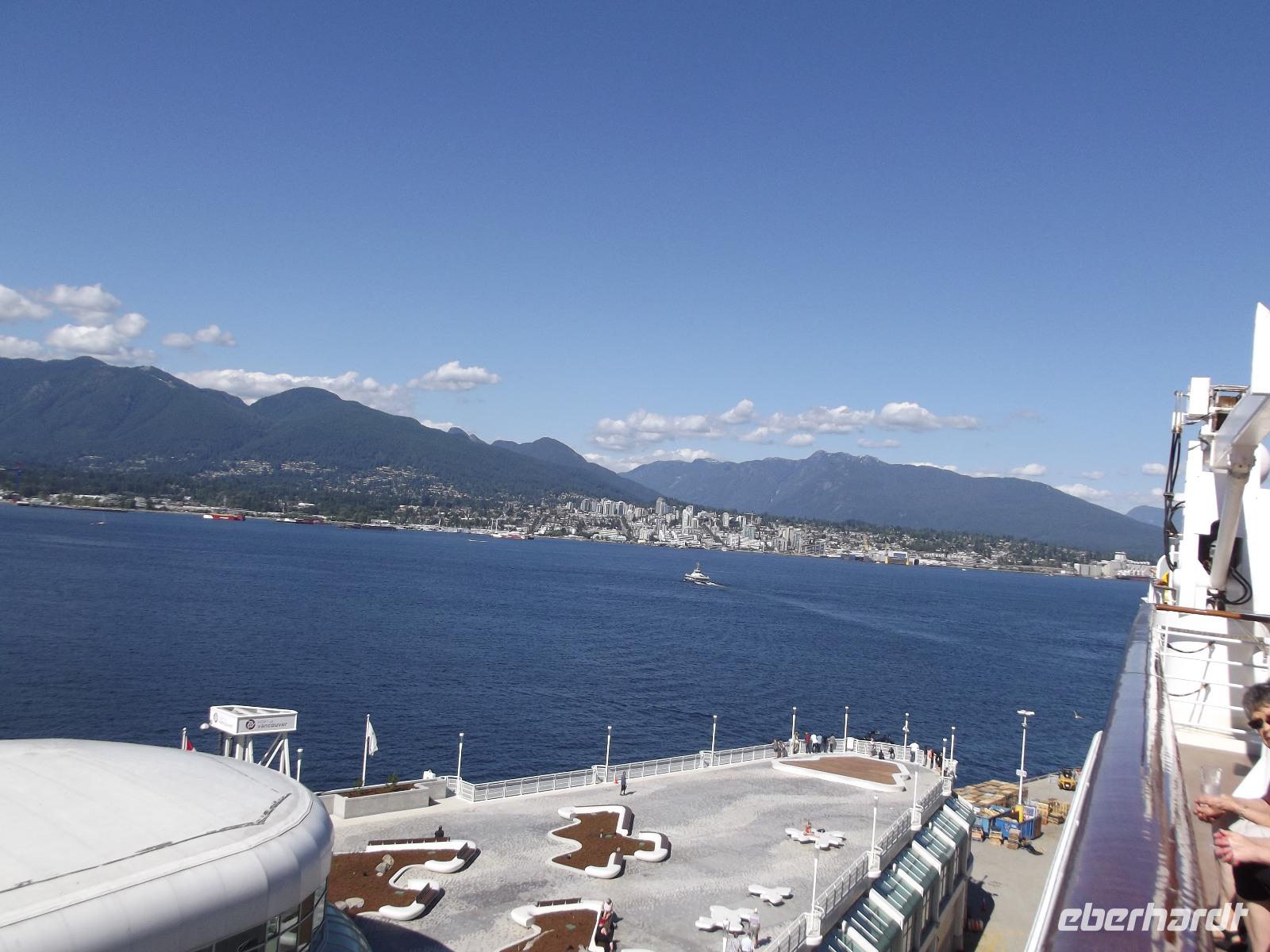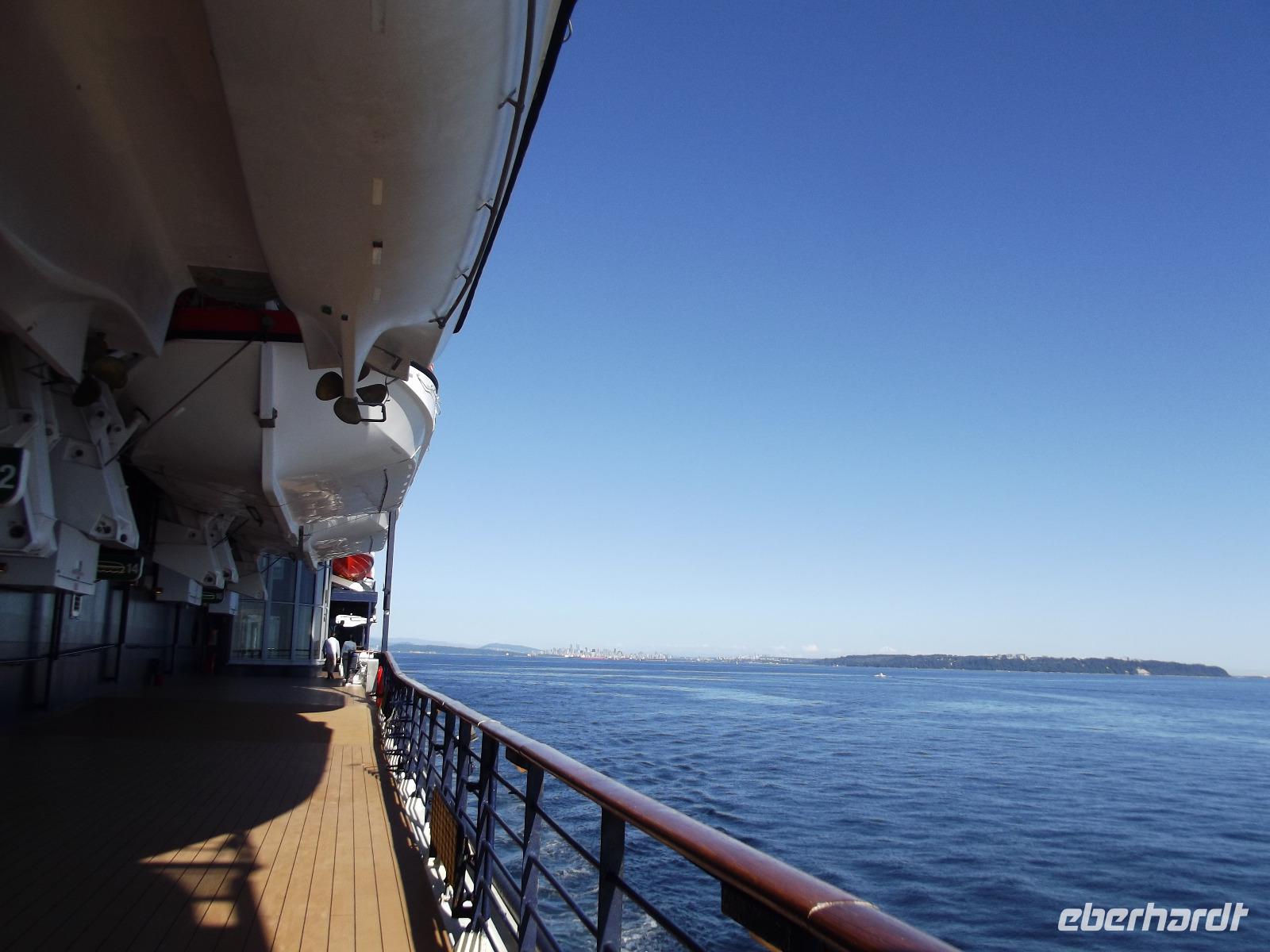 Der Pazifik ruft uns, denn unsere Alaska-Kreuzfahrt auf der Celebrity Infinity steht an. Ein letztes Frühstück im Hotel, die nächsten Tage werden wir auf dem Schiff speisen. Nachdem wir uns etwas frisch gemacht, die letzten Koffer gepackt und verstaut haben, geht es in den Bus. Da wir überpünktlich sind, stoppen wir auf dem Weg zum Canada Place an der überdimensionalen Flamme von Olympia, die 2010 im Mittelpunkt stand. Die letzten Momente in Vancouver verbracht, geht es jetzt zum Check-In, durch die Sicherheits- und Passkontrolle bis auf das Schiff. Wir bekommen alle unsere Zimmerkarte, müssen uns aber noch etwas gedulden bis die Kabinen fertig sind. Es gibt einen herzlichen Sektempfang und die ersten Gäste spazieren schon über die beeindruckenden Decks des Schiffes. So manche oranisatorische Dinge müssen noch erledigt werden, dann geht es für uns zum Mittagessen in das leckere Buffetrestaurant. Pünktlich im halb Vier ertönt eine Ansage durch die Lautsprecher - die Sicherheitsübung beginnt! Auf dem ganzen Schiff sammeln sich kleine Grüppchen, die mittels Video und persönlicher Demonstrationen über einen möglichen Rettungsvorgang belehrt werden. Schon eine Stunde später legt die Celebrity Infinity ab und wir winken von den obersten Decks. Mit Cocktails und anderen leckeren Getränken stimmt sich die Gruppe auf das Abendessen ein, dass wir im Trellis Restaurant bekommen: Ein Drei-Gänge-Menü mit delikater Auswahl! Den Abend lassen wir auf der Terasse der Oceanviewbar ausklingen mit Blick auf das Meer. Und wir haben Begleiter, denn Wale lassen sich am Horizont sichten und begrüßen uns auf hoher See.