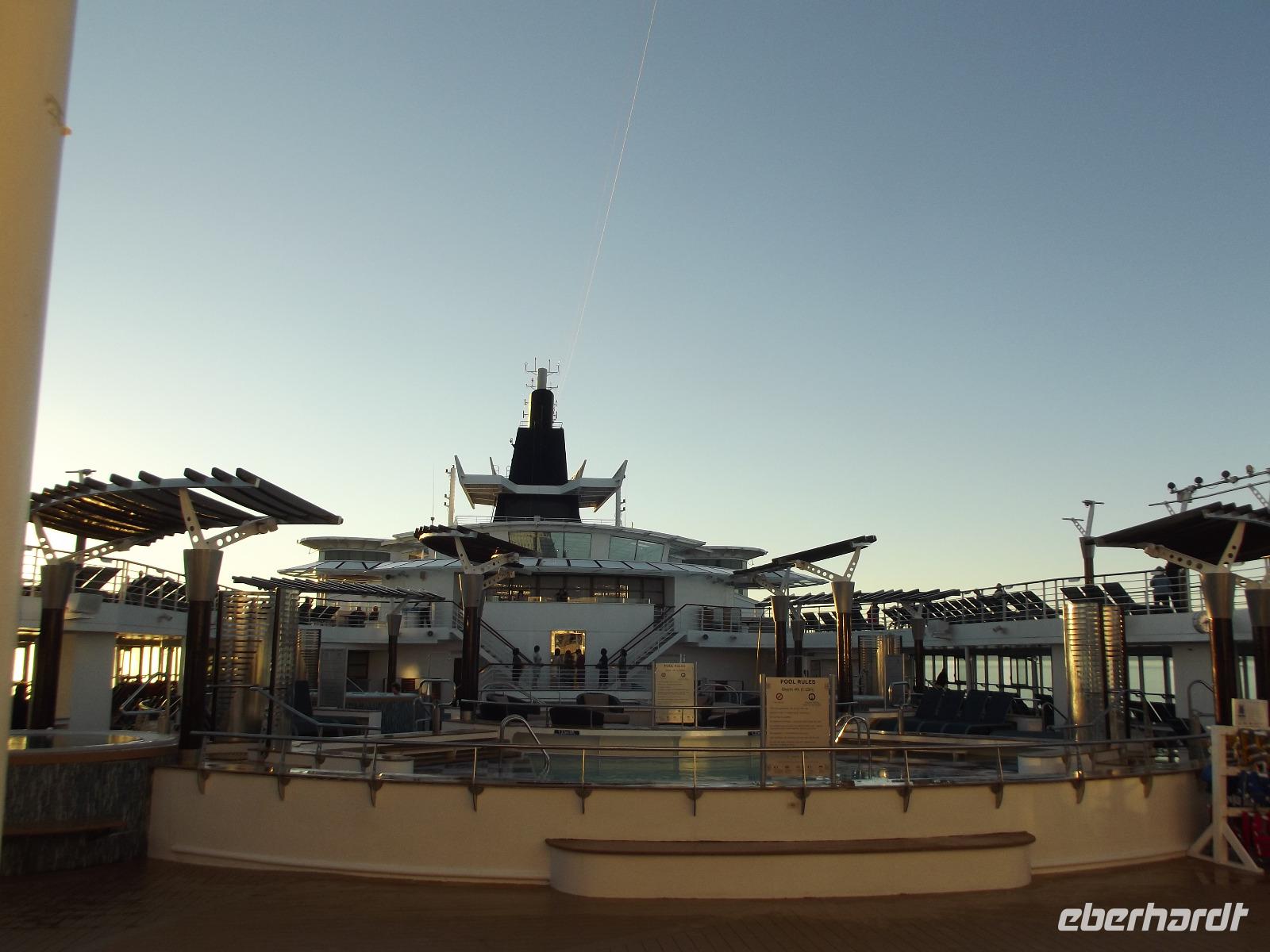 Wir erwachen in unseren komfortablen Kabinen und stärken uns am Frühstücksbuffet, welches so eine große Auswahl hat, dass man sich kaum entscheiden kann. Um 10 Uhr trifft sich unsere Reisegruppe und bekommt eine exklusive Führung von Silvio, dem deutschen Gastgeber auf dem Schiff. Er zeigt uns das Open-Air Kino, den Spa-Bereich und auch den Sportbereich. Die Celebrity Infinity kann ca. 2000 Passagiere aufnehmen, verteilt auf 11 Decks. Es gibt ca. 1000 Crewmitglieder, wurde 2001 gebaut und gehört zur Millennium-Klasse der Celebrity-Schiffe. Mit dem ganzen Wissen gehen wir individuell zum Mittagessen, denn es gibt einige Restaurants, die man ausprobieren kann: Sushi, Toskana Grill oder auch internationale, gehobene Küche. Den Nachmittag verbringen wir entweder am Pool, im Café mit einem guten Buch, auf dem eigenen Balkon, auf dem Deck auf den Liegen oder auch gern im Fitnessraum. Nach einem leckeren Abendessen gehen wir alle gemeinsam in das Celebrity Theater, wo es eine fantastische Musikshow gibt von zwölf talentierten Künstlern, die singen und tanzen. Wen es danach noch nicht ins Bett verschlägt, der trifft sich zum Sonnenuntergang an der Eis-Martini-Bar und genießt den Himmel, der in Grün- und Orangetönen getaucht ist.