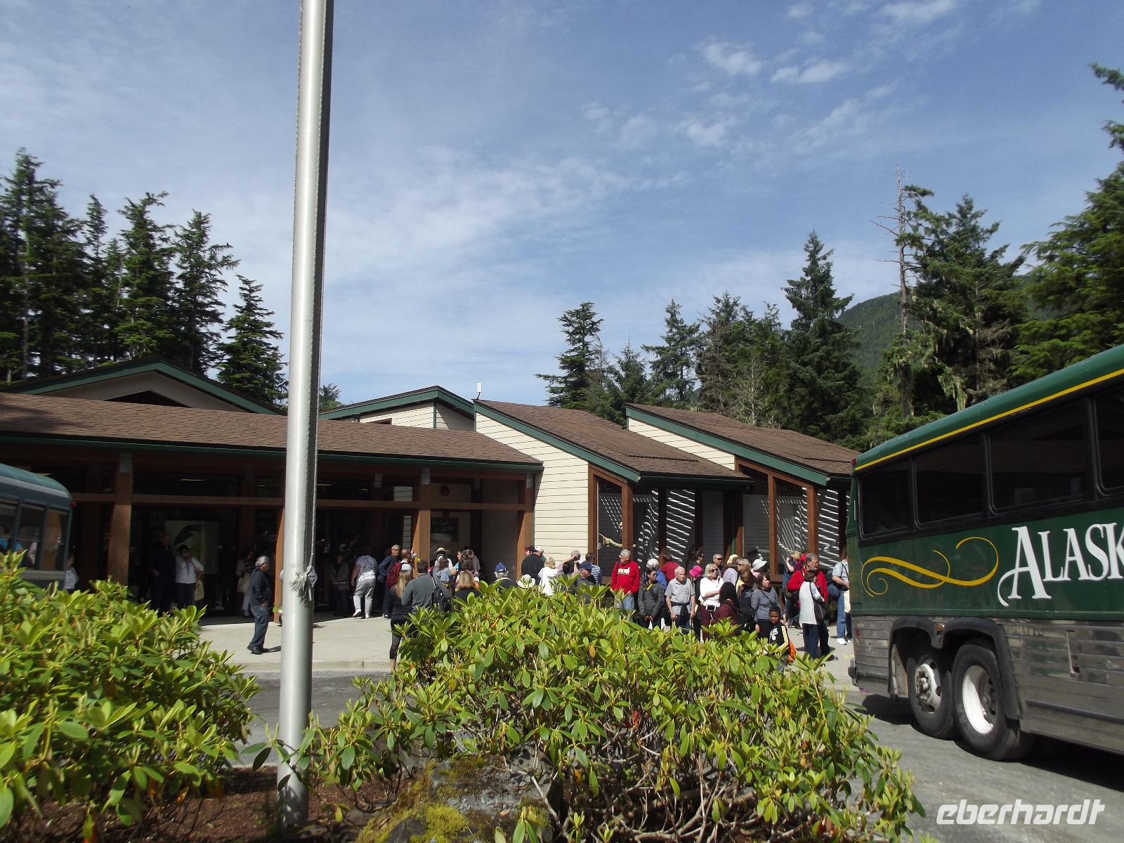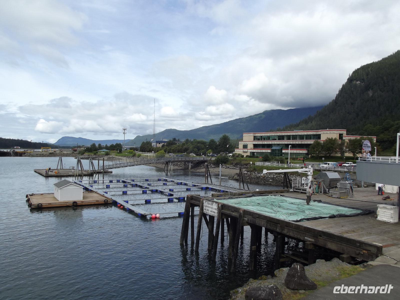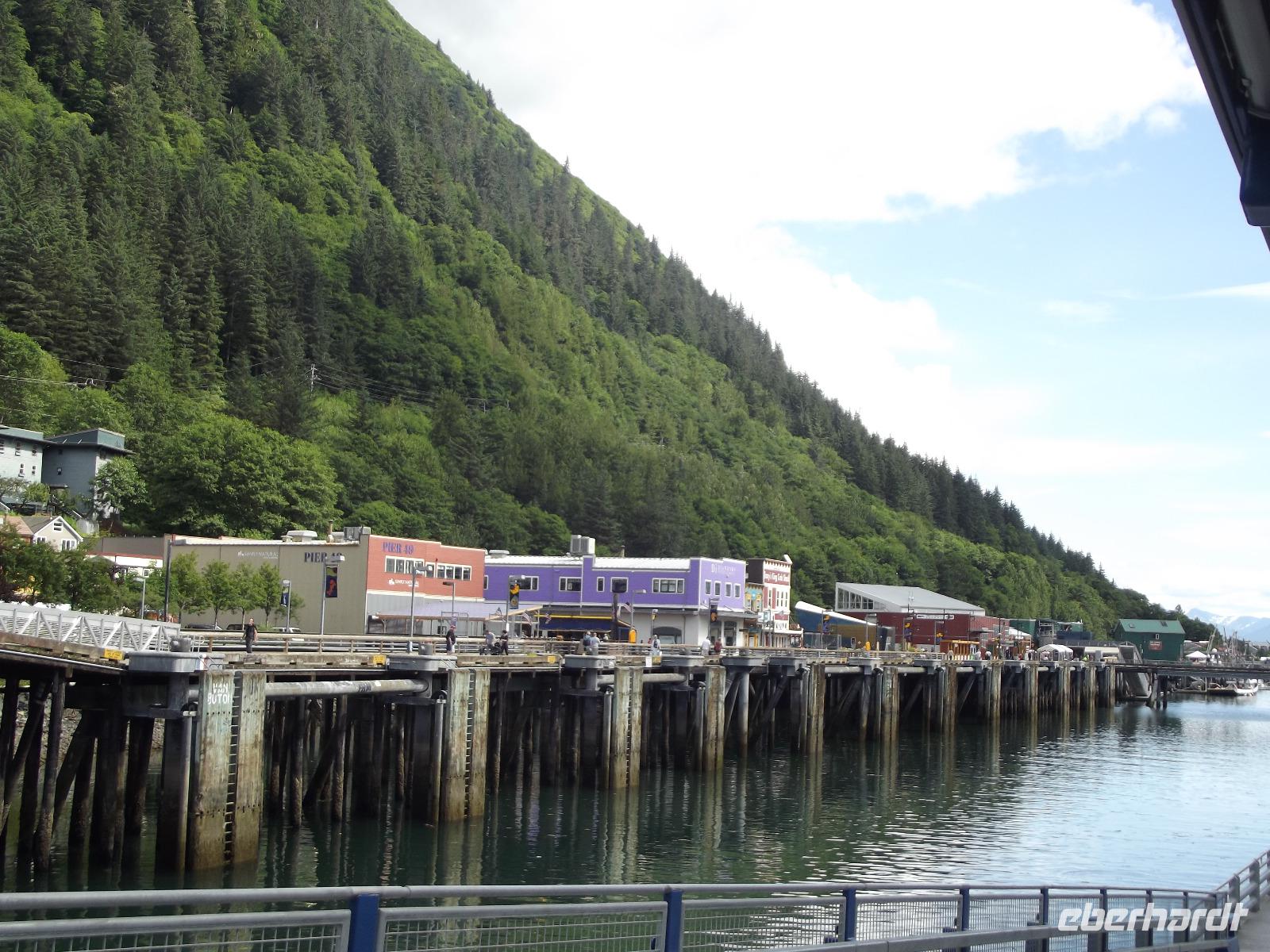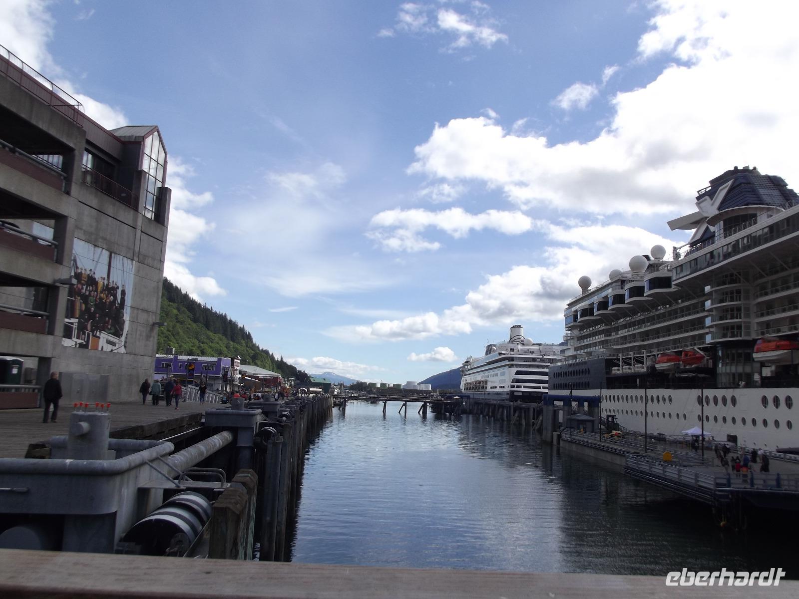 Heute steht unser exklusiver Eberhardt-Ausflug in Juneau auf dem Programm. Nach dem Frühstück holt uns unsere Fahrerin Peggi vom Pier ab - und los geht's! Es zieht uns zunächst zum Mendenhall Gletscher, der königlich zwischen zwei Berghängen sitzt und in einem tollen Blau strahlt. Das Eis an der Gletscherkante ist bis zu 150 Jahre alt und es gibt über 100 Gletscherzungen. Im Besucherzentrum kann man sich über die Entstehung des Gletschers und über die umliegende Tierwelt informieren. Auf dem Gelände befinden sich einige Wanderwege, die sich durch die Natur schlängeln. Die gefüllten Lachsbäche und das platt gedrückte Gras lässt stark vermuten, dass die Bären nicht weit sind, aber trotz unserer Ausdauer haben wir leider kein Glück. Der rote, springende Lachs ist allerdings genauso beeindruckend. Um mehr über den Lachs zu lernen, fahren wir zu einer naheliegenden Aufzuchtstation, wo uns der Mitarbeiter über die Zucht und den Lebenslauf des Fisches erzählt. Wir besuchen eine Hütte, in der sich mehr als eine Million Baby-Lachse tummeln und beim Heraustreten aus der Hütte, können wir unseren Augen kaum glauben: da schwimmen Seehunde um die Fischbecken und lassen es sich gut gehen. Unsere Fahrerin Peggi möchte die Zeit noch nutzen und macht eine kleine Stadtrundfahrt mit der Gruppe bis hin zur Mount Robert Tramway - eine der steilsten Pendelbahnen der Welt, die wir natürlich auch hochfahren. Von oben hat man einen fantastischen Blick auf die Kreuzfahrtschiffe und den Hafen. Auf der Fahrt nach unten sehen wir, wie Weißkopfseeadler um die Gondel kreisen und uns willkommen heißen. Der restliche Tag steht zur freien Verfügung und viele bummeln noch durch Juneau, bis wir uns bei Abendessen wiedertreffen.
