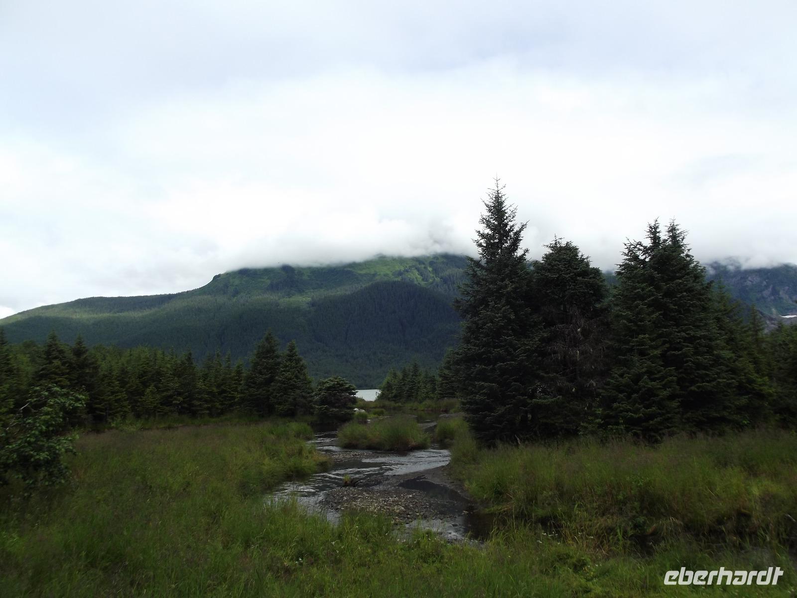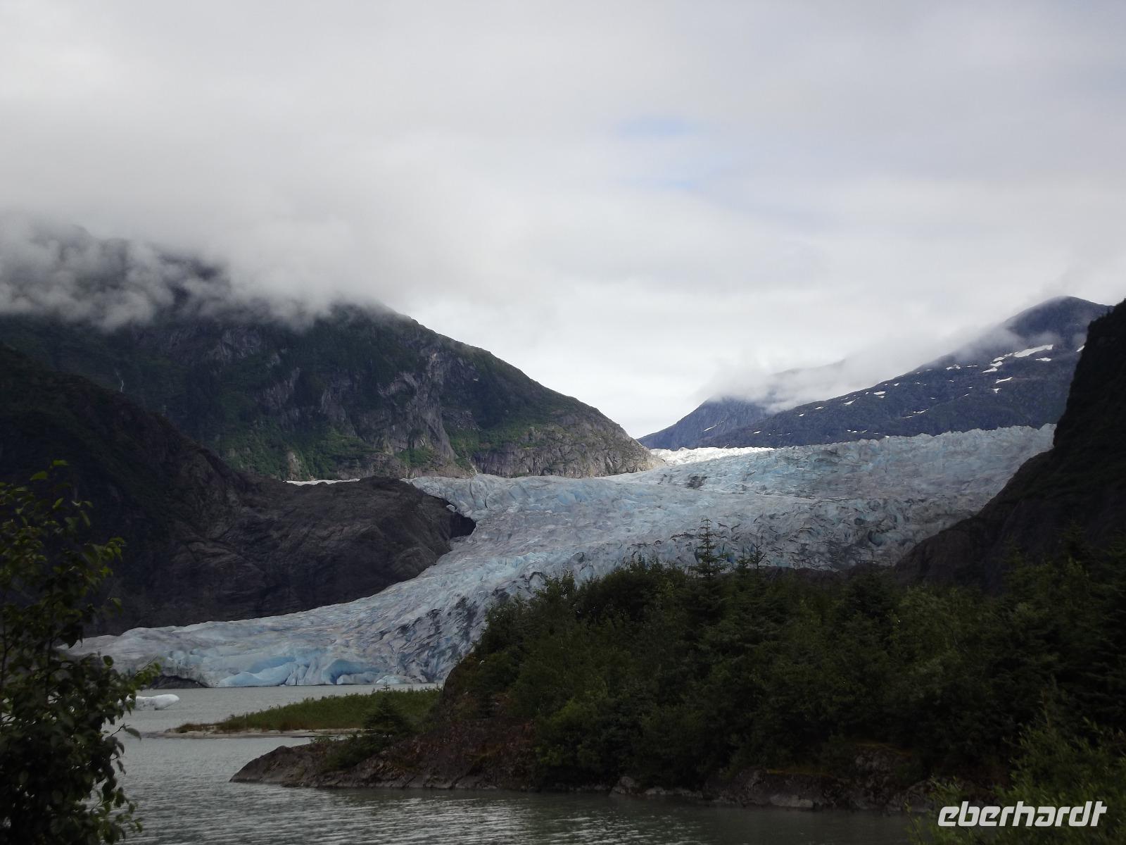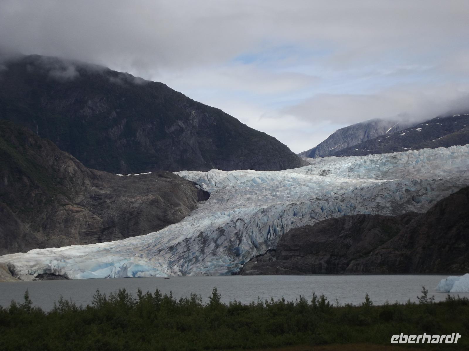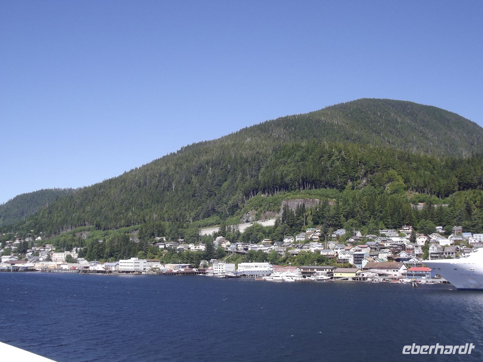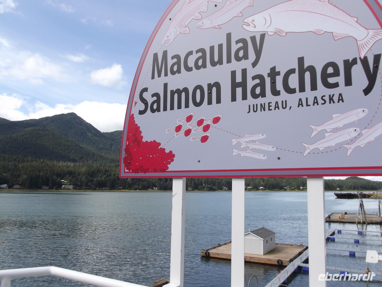 Heute steht unser exklusiver Eberhardt-Ausflug in Juneau auf dem Programm. Nach dem Frühstück holt uns unsere Fahrerin Peggi vom Pier ab - und los geht's! Es zieht uns zunächst zum Mendenhall Gletscher, der königlich zwischen zwei Berghängen sitzt und in einem tollen Blau strahlt. Das Eis an der Gletscherkante ist bis zu 150 Jahre alt und es gibt über 100 Gletscherzungen. Im Besucherzentrum kann man sich über die Entstehung des Gletschers und über die umliegende Tierwelt informieren. Auf dem Gelände befinden sich einige Wanderwege, die sich durch die Natur schlängeln. Die gefüllten Lachsbäche und das platt gedrückte Gras lässt stark vermuten, dass die Bären nicht weit sind, aber trotz unserer Ausdauer haben wir leider kein Glück. Der rote, springende Lachs ist allerdings genauso beeindruckend. Um mehr über den Lachs zu lernen, fahren wir zu einer naheliegenden Aufzuchtstation, wo uns der Mitarbeiter über die Zucht und den Lebenslauf des Fisches erzählt. Wir besuchen eine Hütte, in der sich mehr als eine Million Baby-Lachse tummeln und beim Heraustreten aus der Hütte, können wir unseren Augen kaum glauben: da schwimmen Seehunde um die Fischbecken und lassen es sich gut gehen. Unsere Fahrerin Peggi möchte die Zeit noch nutzen und macht eine kleine Stadtrundfahrt mit der Gruppe bis hin zur Mount Robert Tramway - eine der steilsten Pendelbahnen der Welt, die wir natürlich auch hochfahren. Von oben hat man einen fantastischen Blick auf die Kreuzfahrtschiffe und den Hafen. Auf der Fahrt nach unten sehen wir, wie Weißkopfseeadler um die Gondel kreisen und uns willkommen heißen. Der restliche Tag steht zur freien Verfügung und viele bummeln noch durch Juneau, bis wir uns bei Abendessen wiedertreffen.